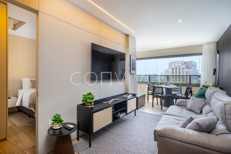 Espaço de 49m², no 20º andar, com cama queen size, varanda integrada, espaço para refeições, sofá retrátil, lavabo e banheiro, lavanderia e cozinha completa, super bem decorado e totalmente equipado.