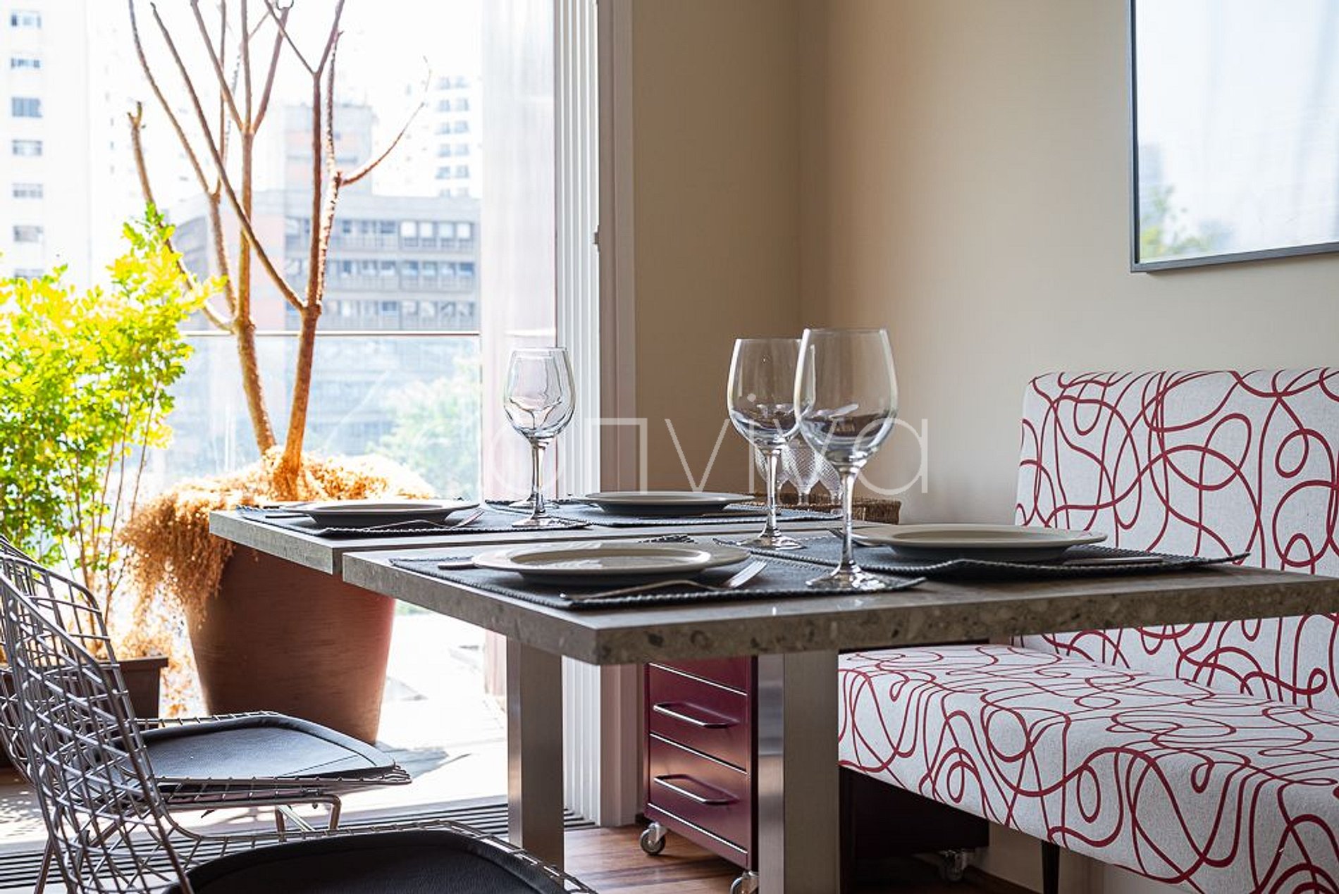 O espaço de 90m², no 4º andar, possui um quarto com uma cama queen size, cozinha, banheiro, lavabo, sala, varanda e área de serviços.
