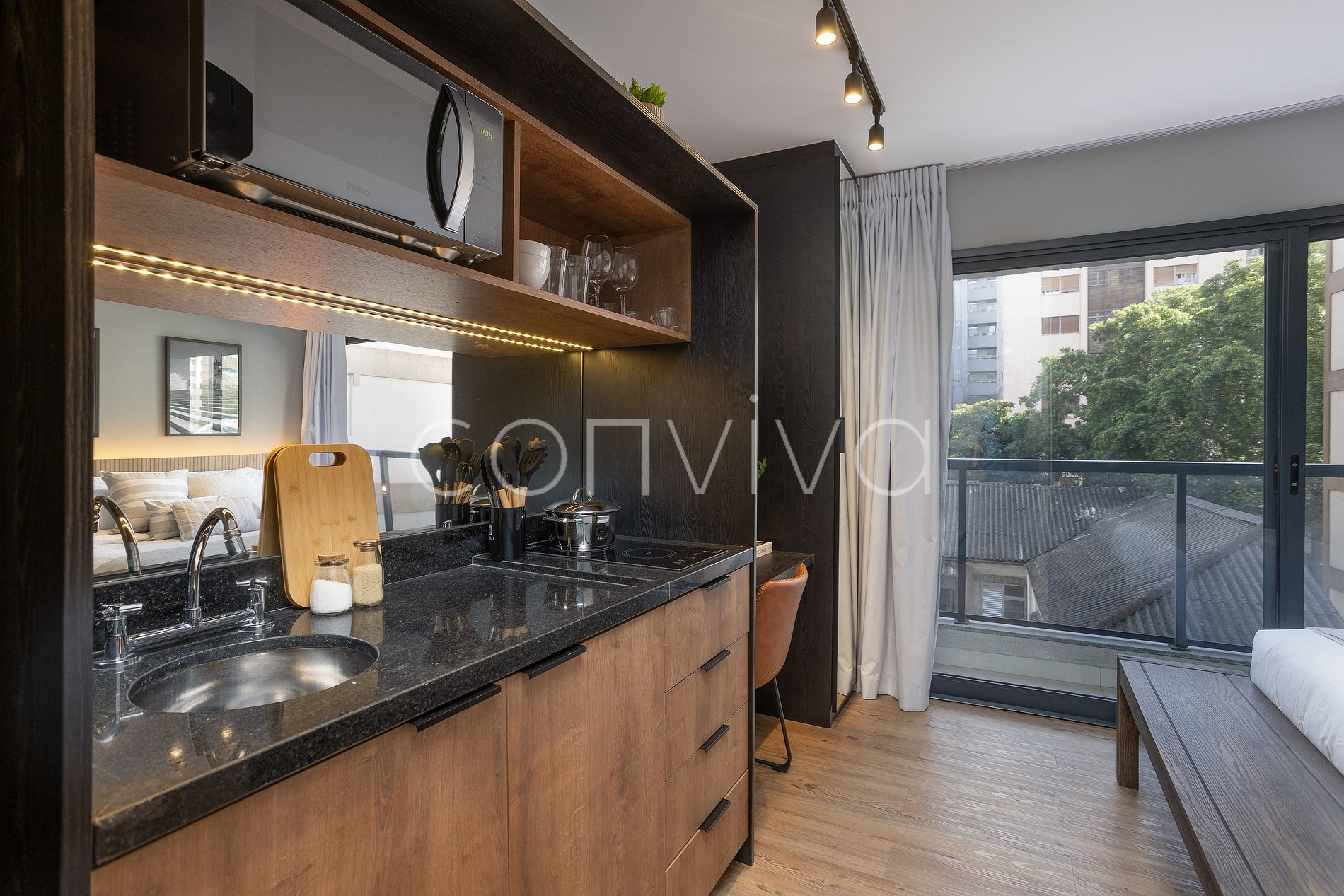 Espaço de 25m², no 4º andar, composto por uma cama casal, banheiro, varanda e cozinha.