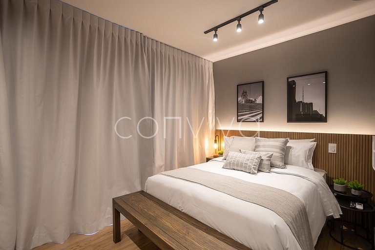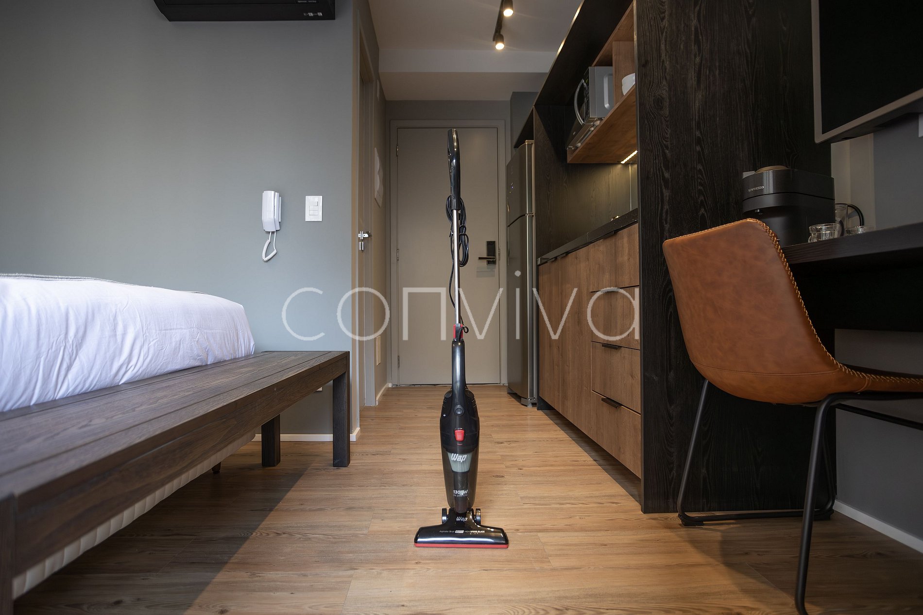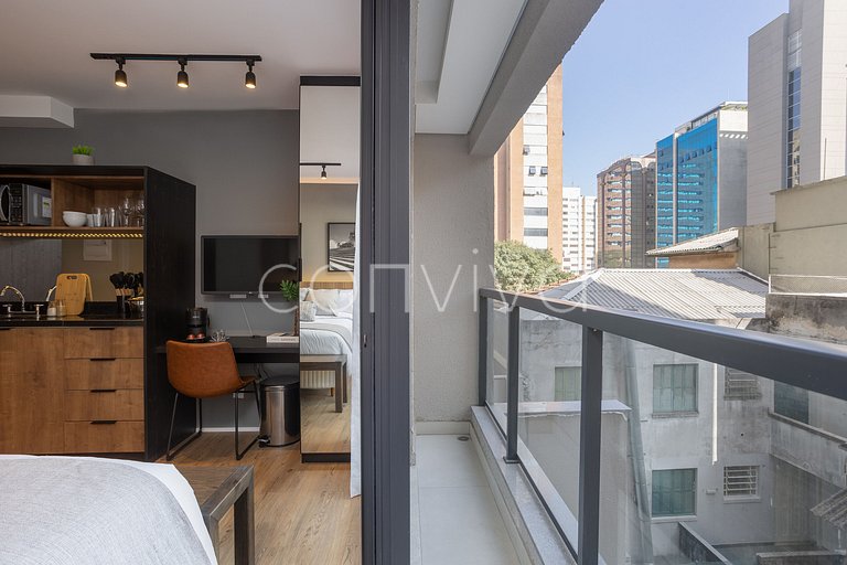 Espaço de 25m², no 4º andar, composto por uma cama casal, banheiro, varanda e cozinha.