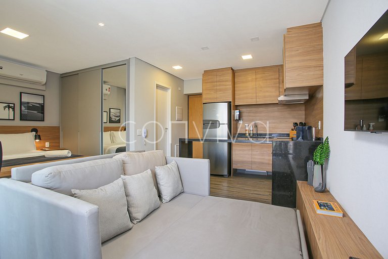 A unidade de 44m², no 2º andar, dispõe de uma cama queen size, sofá cama, banheiro e uma cozinha compacta. Comporta até 3 pessoas.