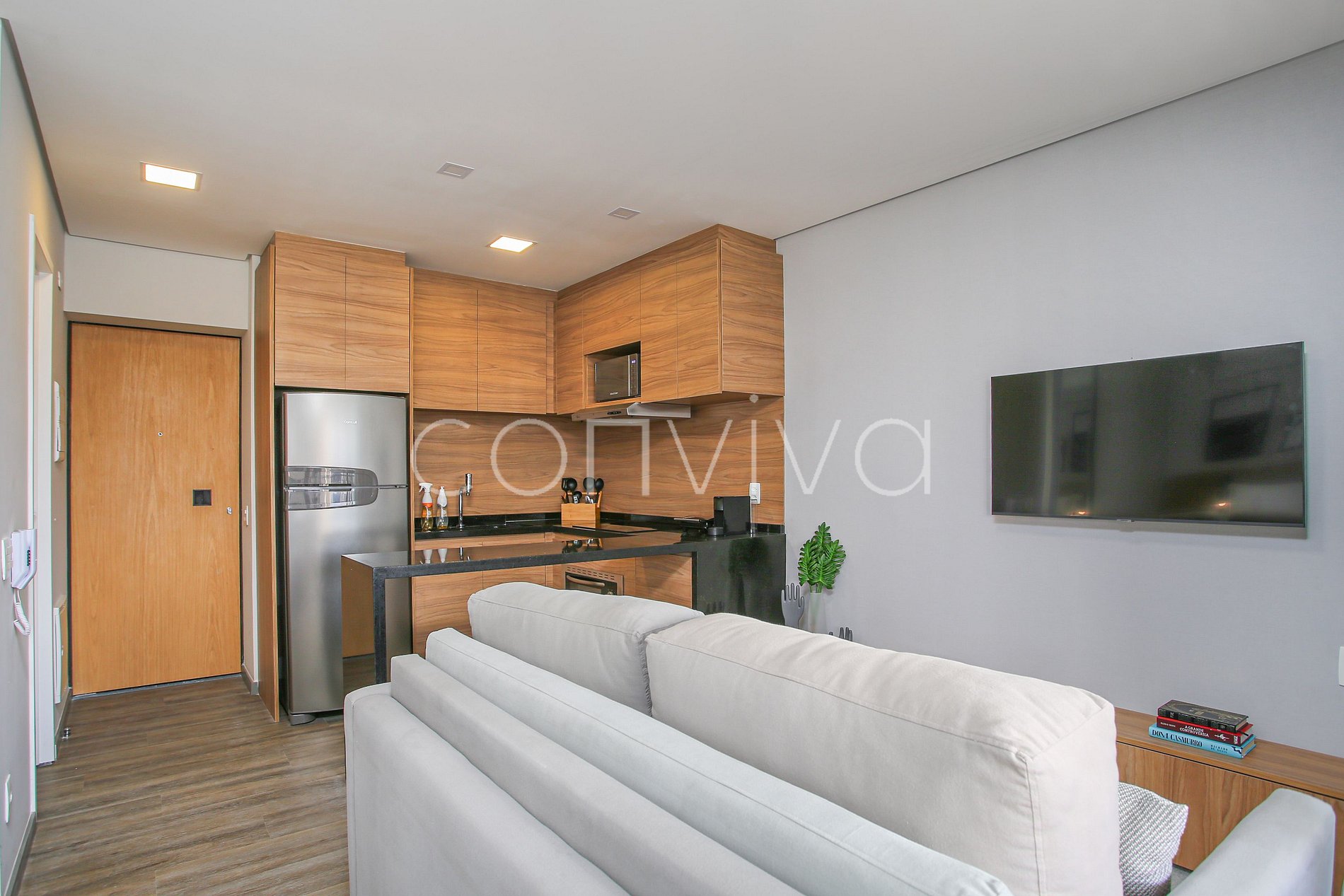 A unidade de 44m² está no 10º andar e dispõe de cama queen size, cozinha completa, sofá-cama, banheiro e uma varanda incrível com vista para o bairro.