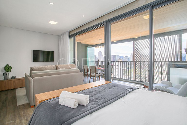 O espaço de 44m², no 14º andar, dispõe de uma cama queen size, banheiro, cozinha completa, sofá-cama e uma varanda incrível com vista para o bairro.