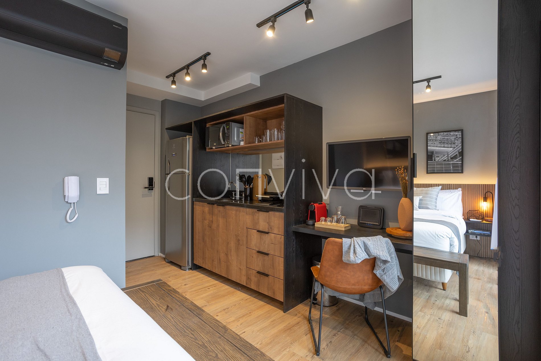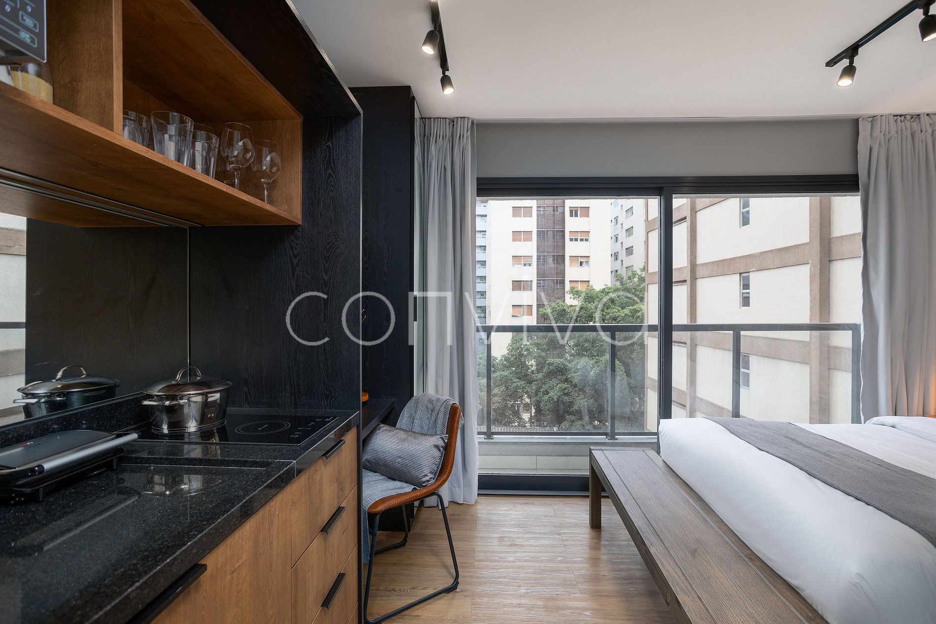 Espaço de 25m², no 6º andar, composto por uma cama casal, banheiro, varanda e cozinha completa.