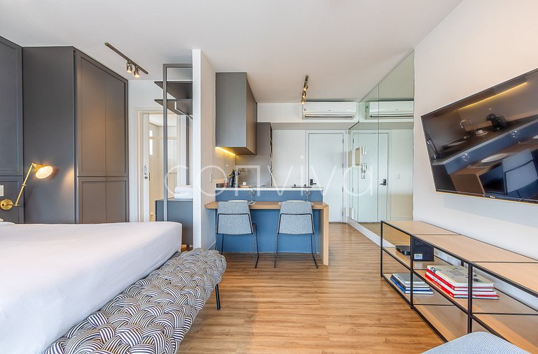 Com 45m², localizado no 16º andar, dispõe de uma cama queen size, banheiro, cozinha compacta e área de estar com vista para a cidade.