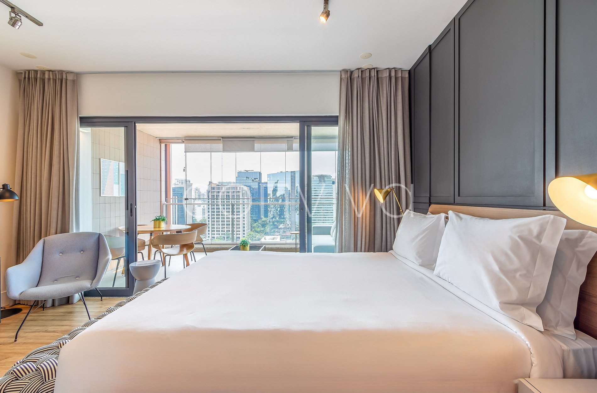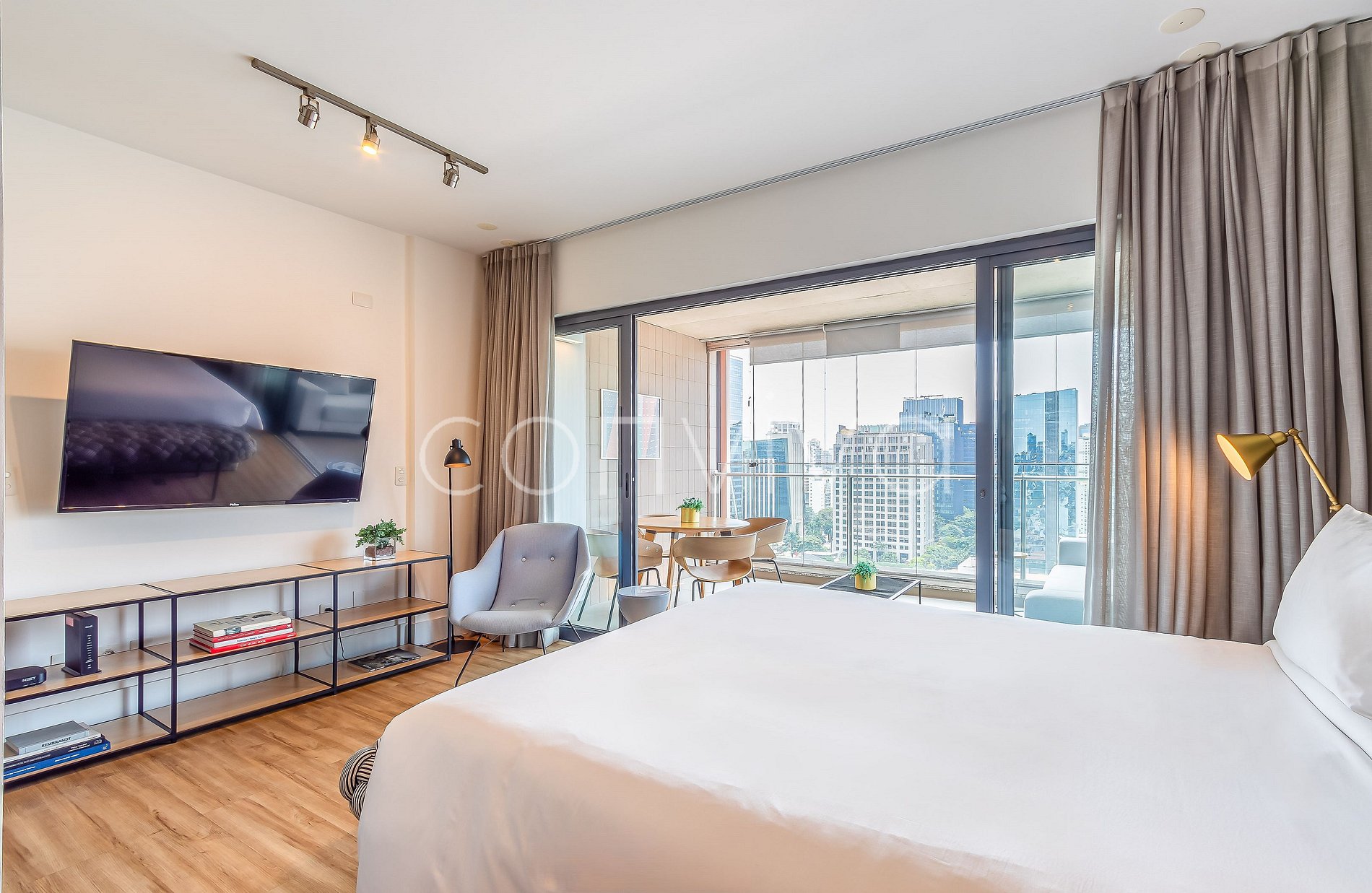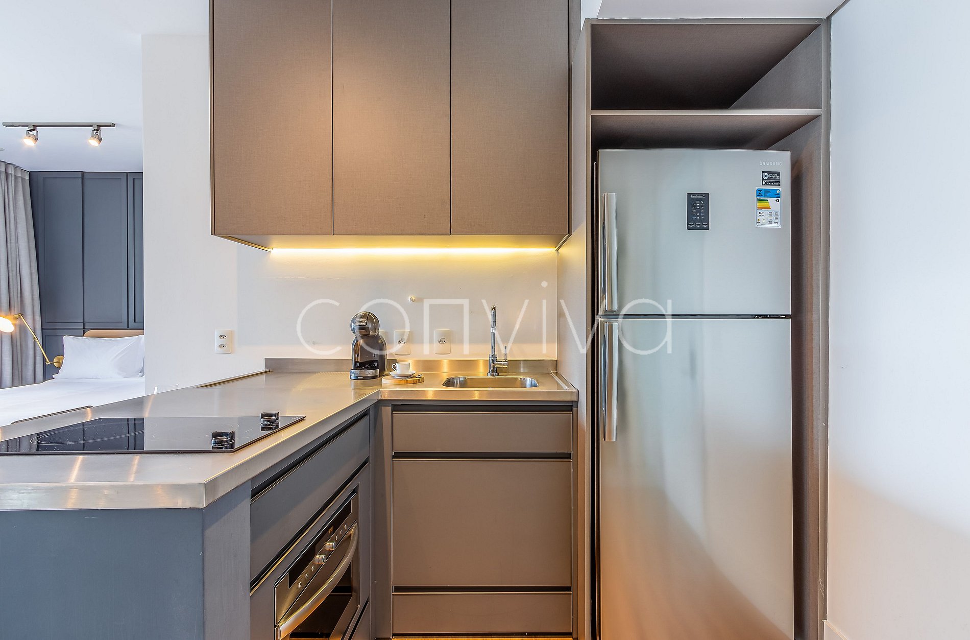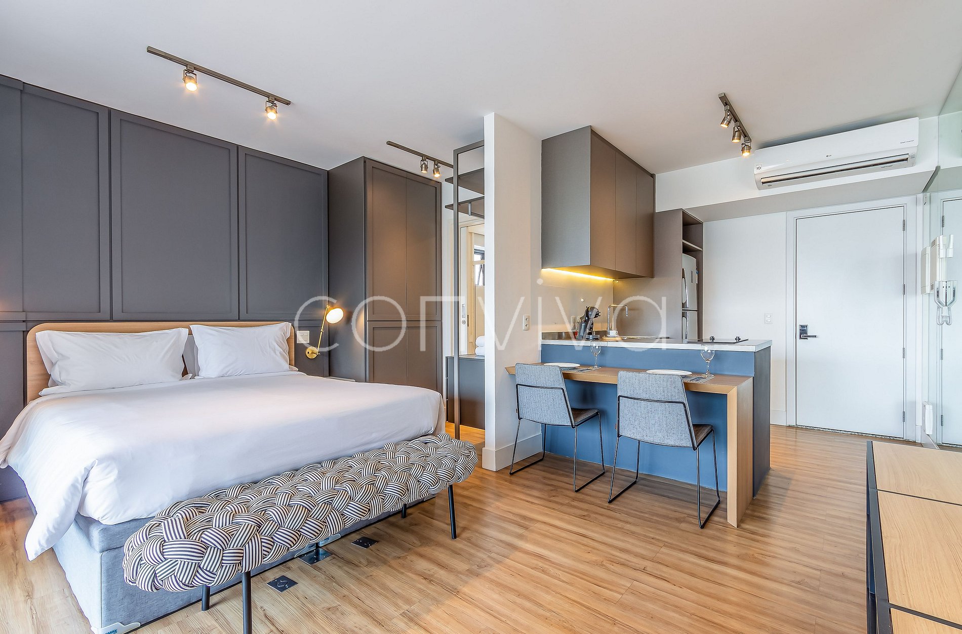 Com 45m² no 16º andar, o espaço é ideal para short e long stay, unindo conforto e praticidade: banheiro privativo, cozinha equipada e uma área de estar agradável com vista para a cidade.
