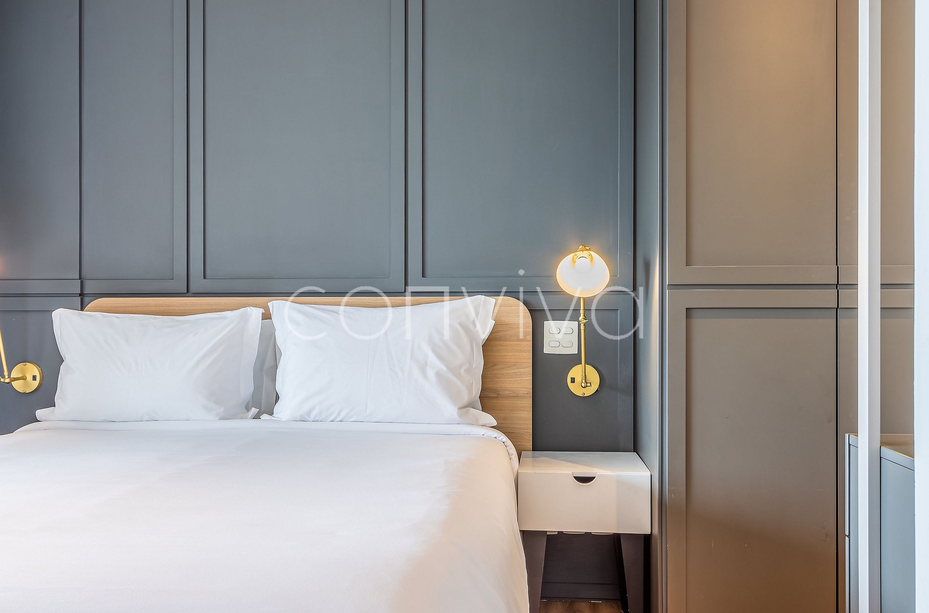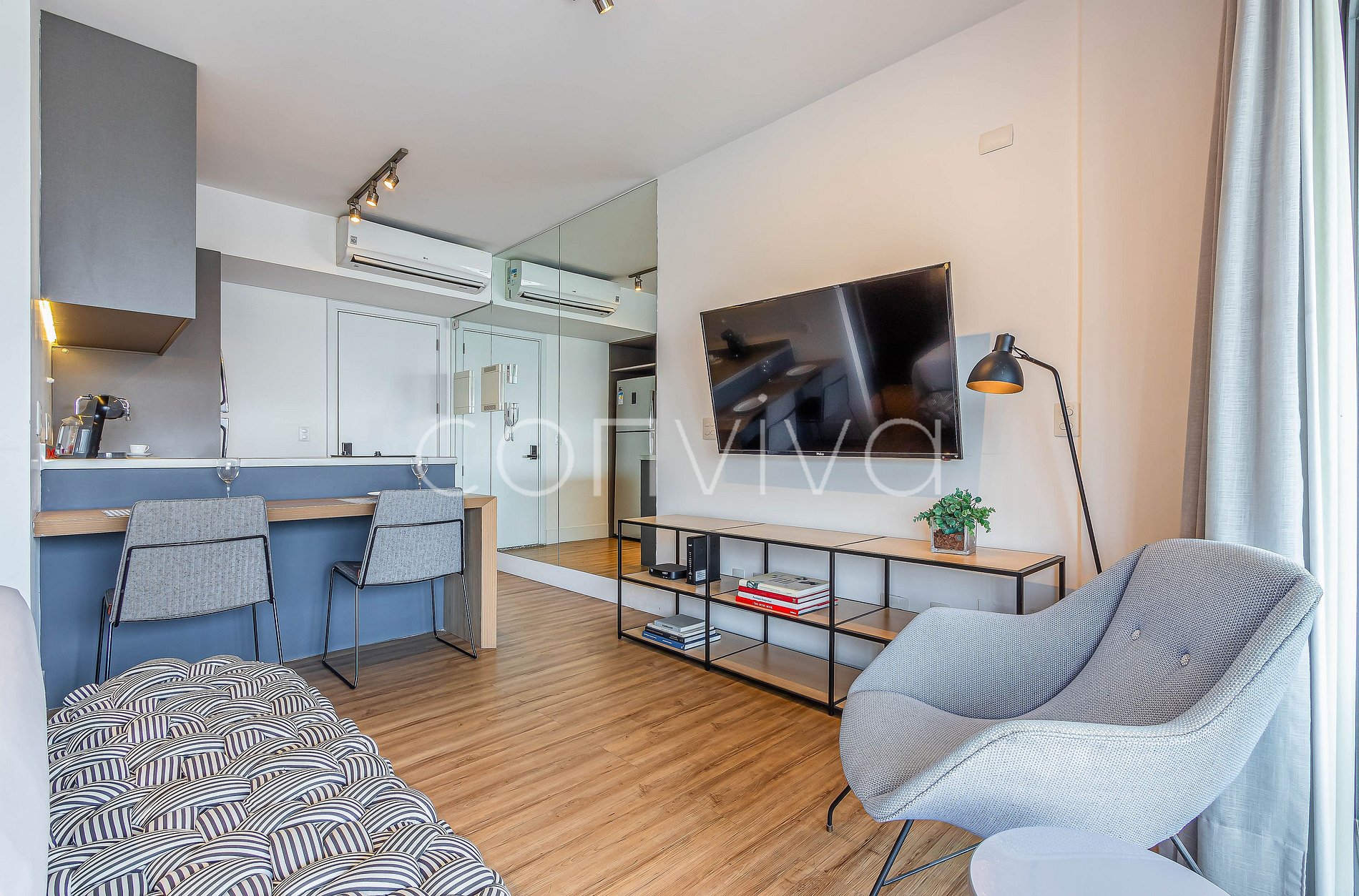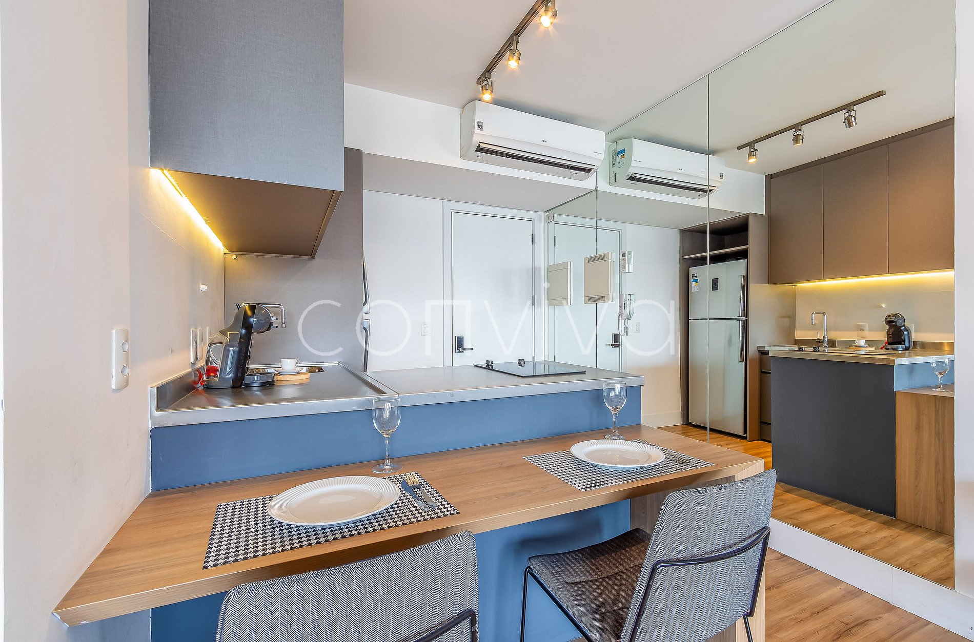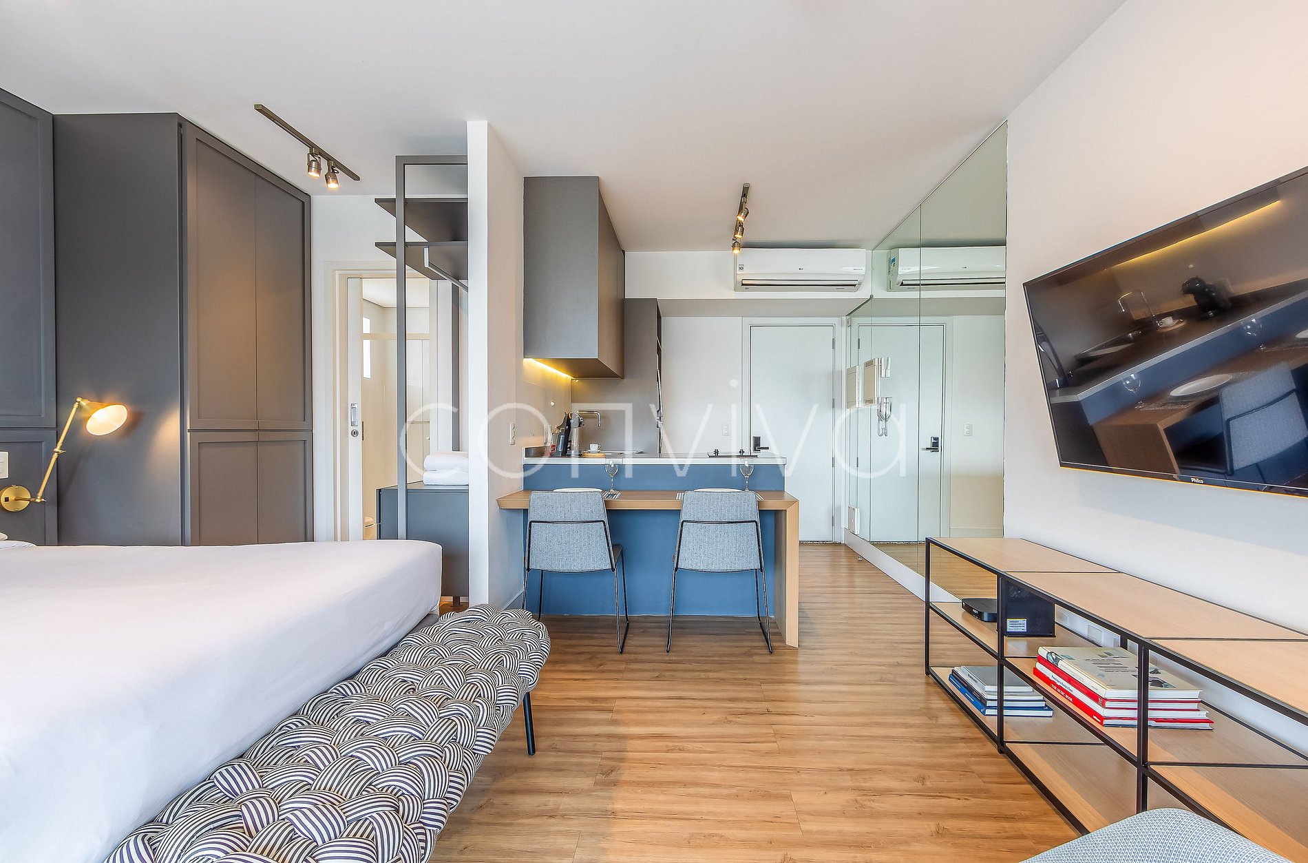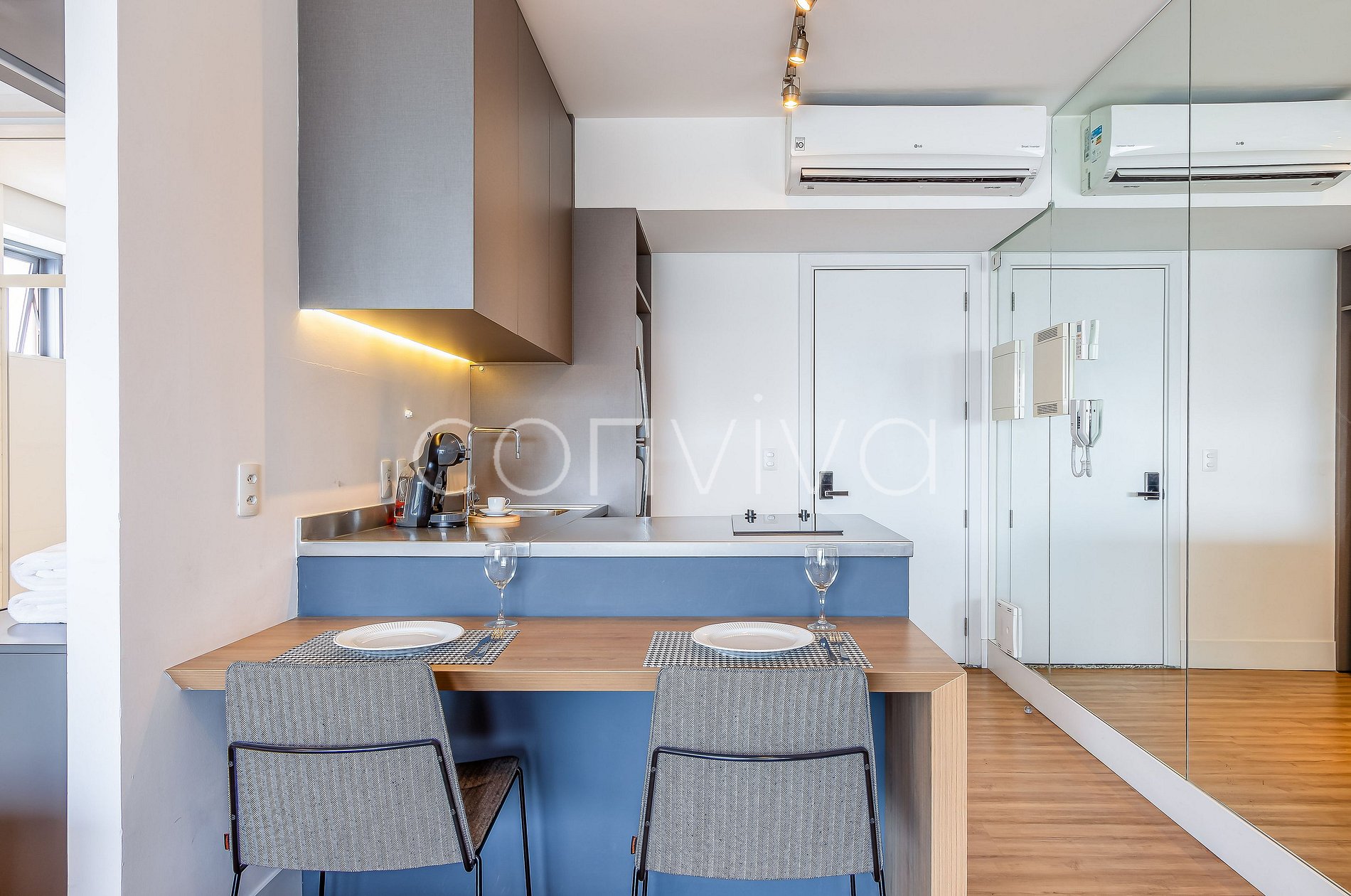 Com 45m² no 16º andar, o espaço é ideal para short e long stay, unindo conforto e praticidade: banheiro privativo, cozinha equipada e uma área de estar agradável com vista para a cidade.