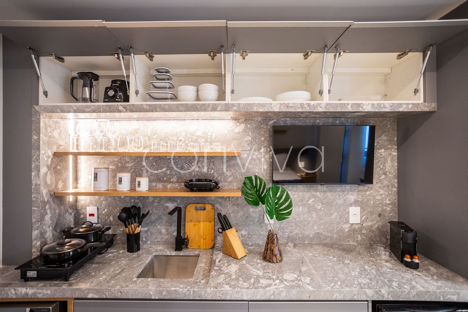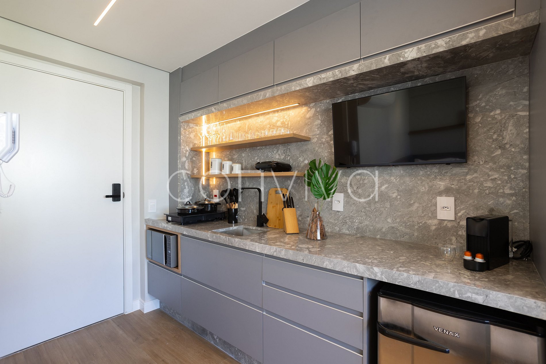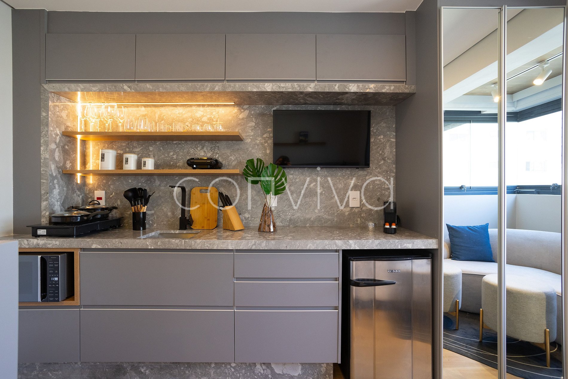 • Cooktop de indução, frigobar, micro-ondas e Air Fryer;