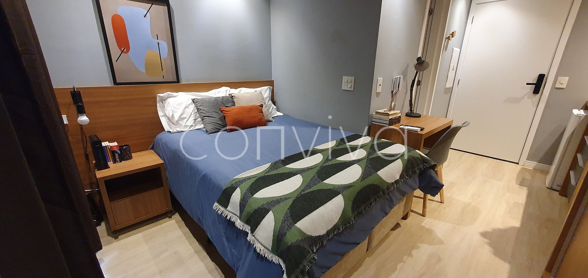 O espaço está localizado no 9º andar e é composto por uma cama de casal, banheiro e cozinha compacta, com os utensílios necessários para o preparo das suas refeições.