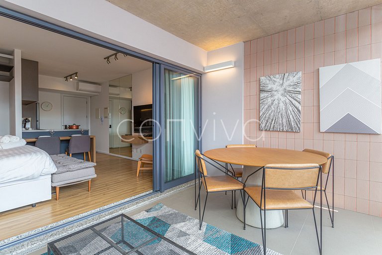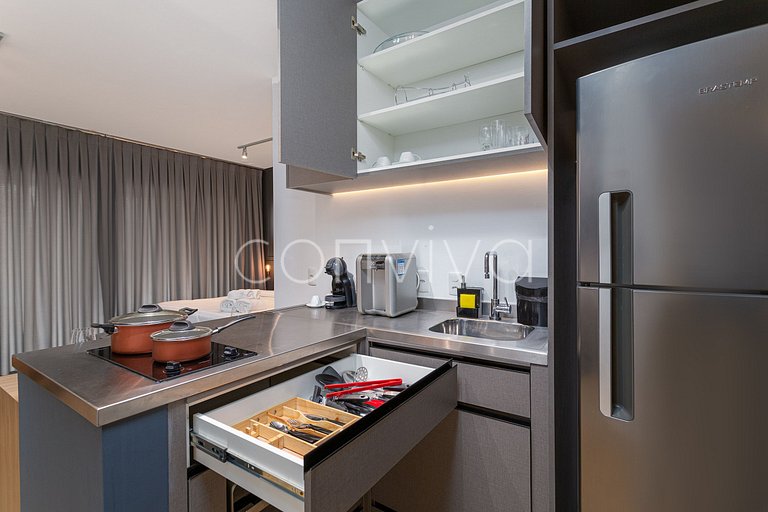 Espaço de 46m², no 3º andar, com cama queen size, banheiro e cozinha compacta, possui um ambiente super aconchegante.