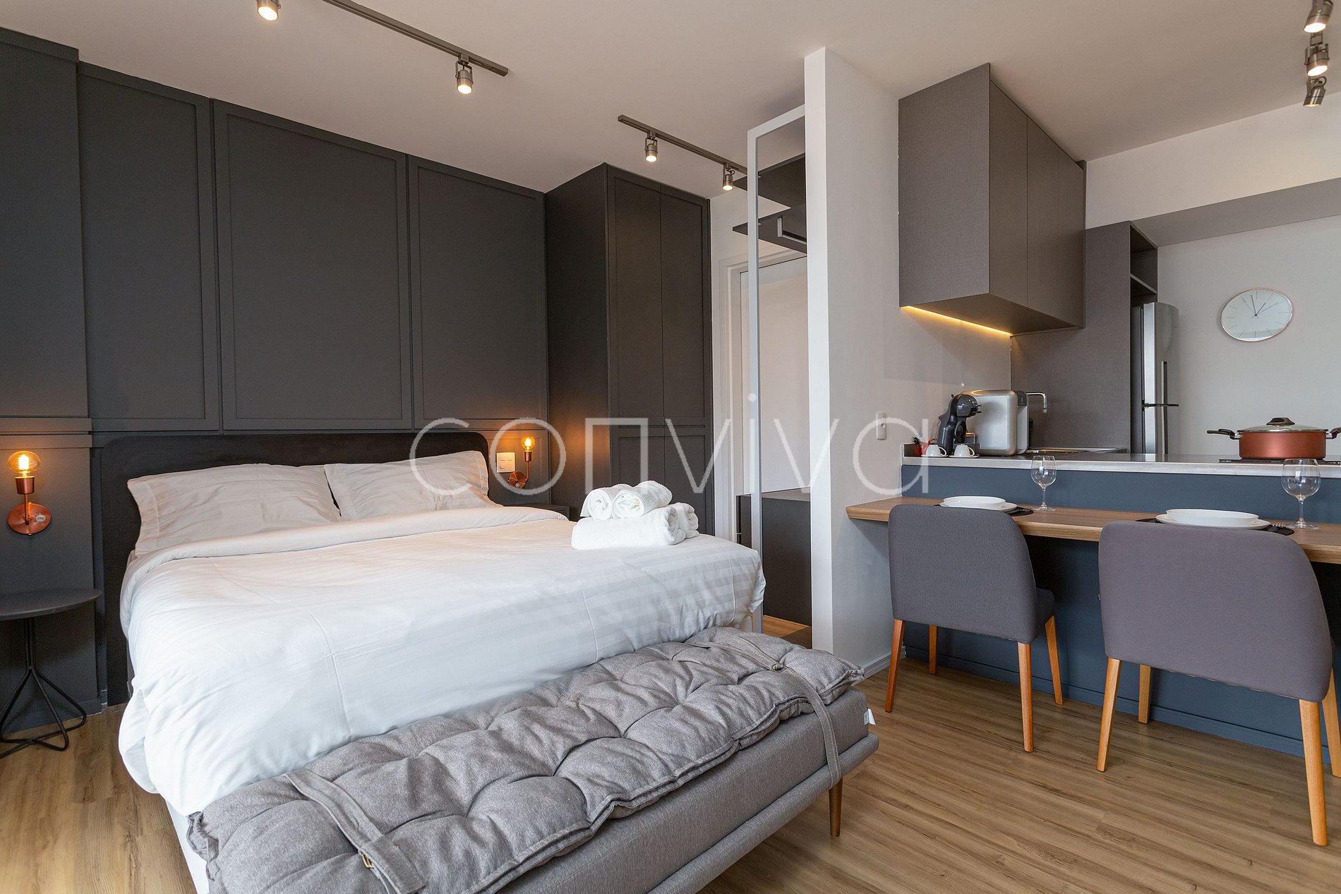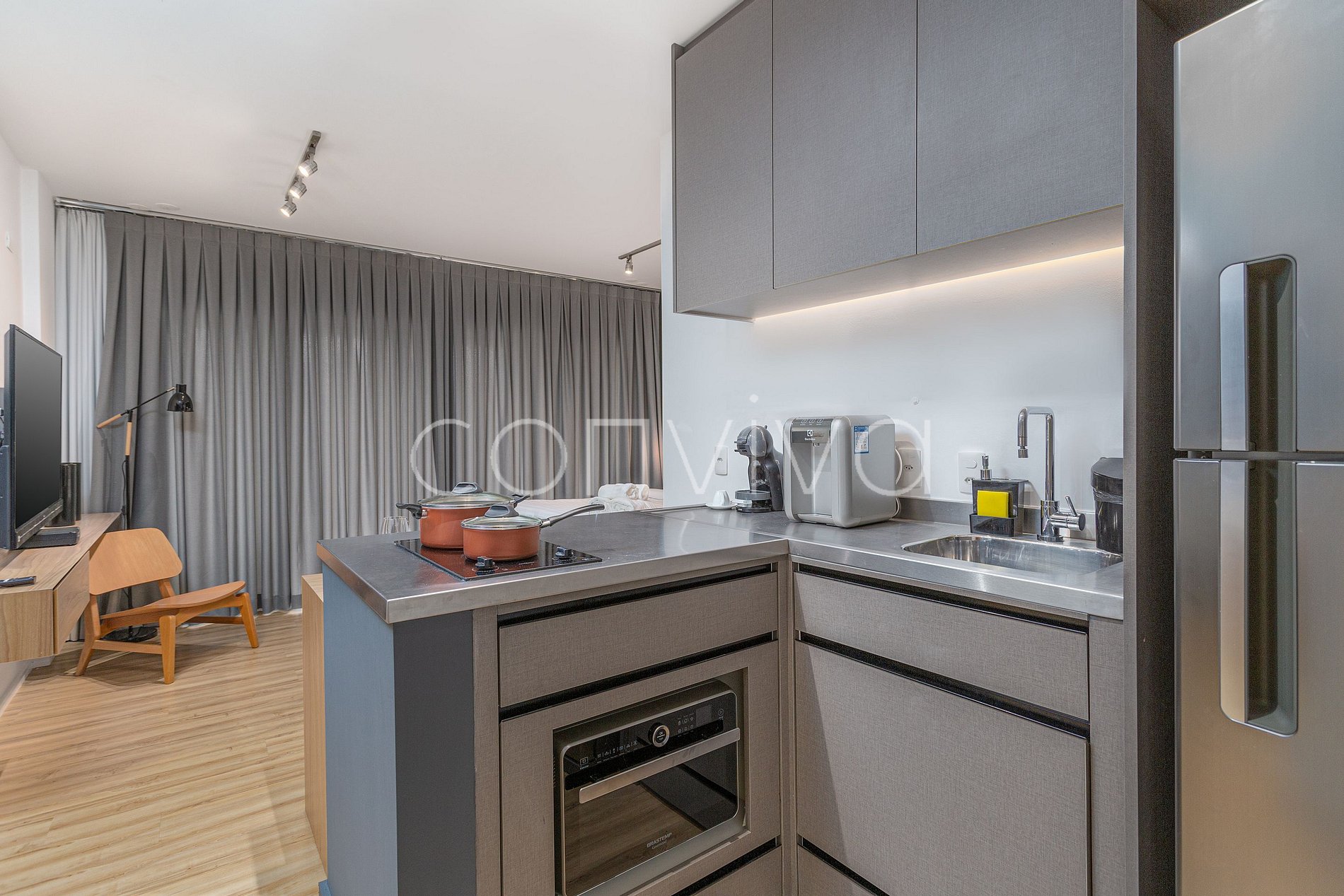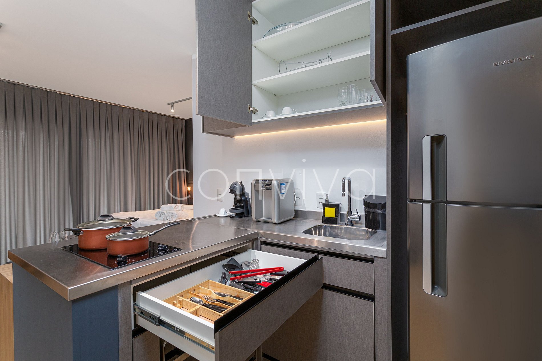 Espaço de 46m², no 3º andar, com cama queen size, banheiro e cozinha compacta, possui um ambiente super aconchegante.