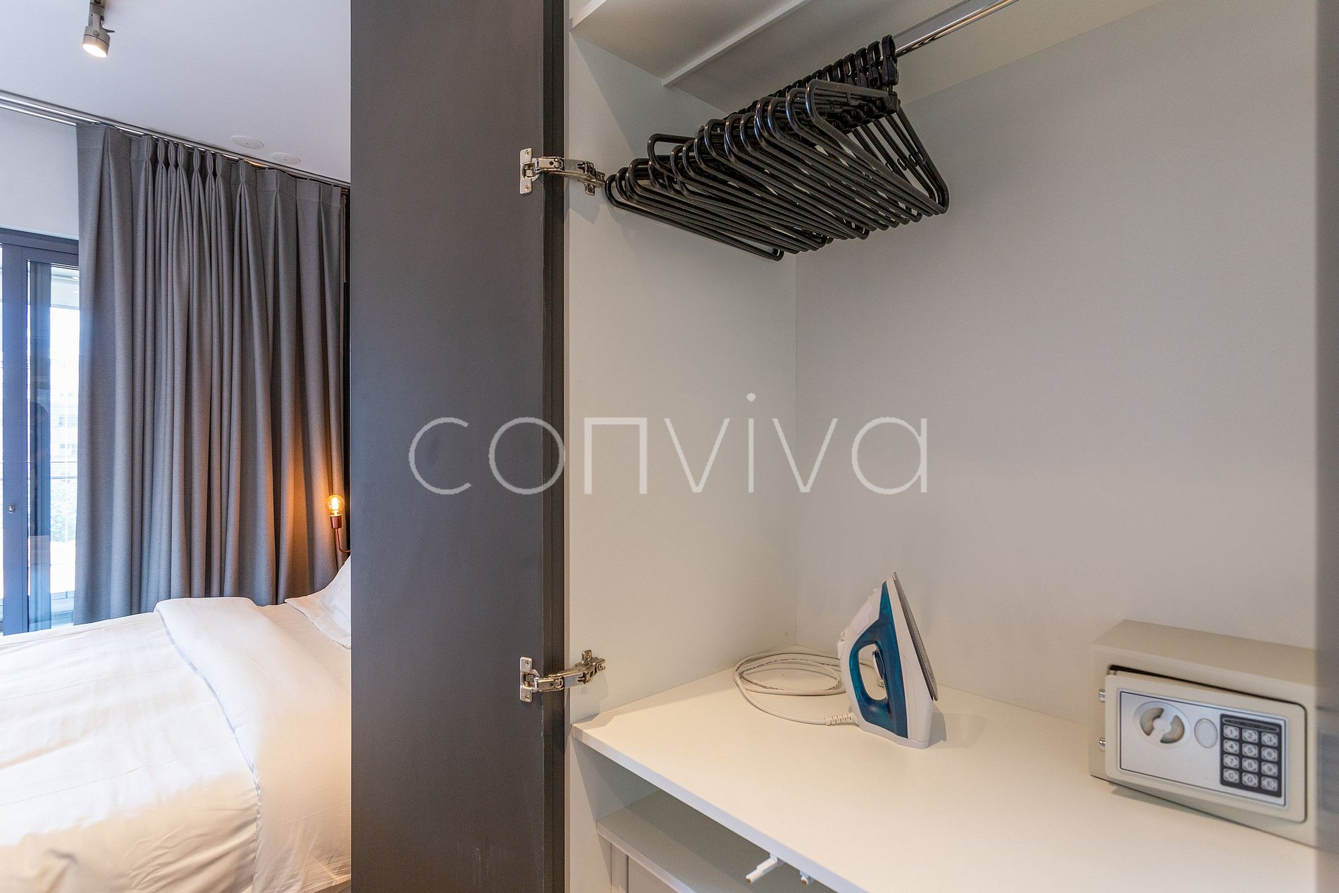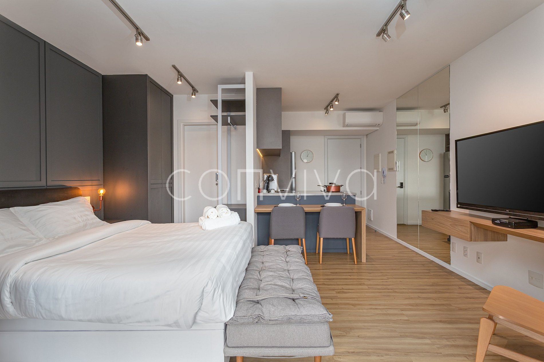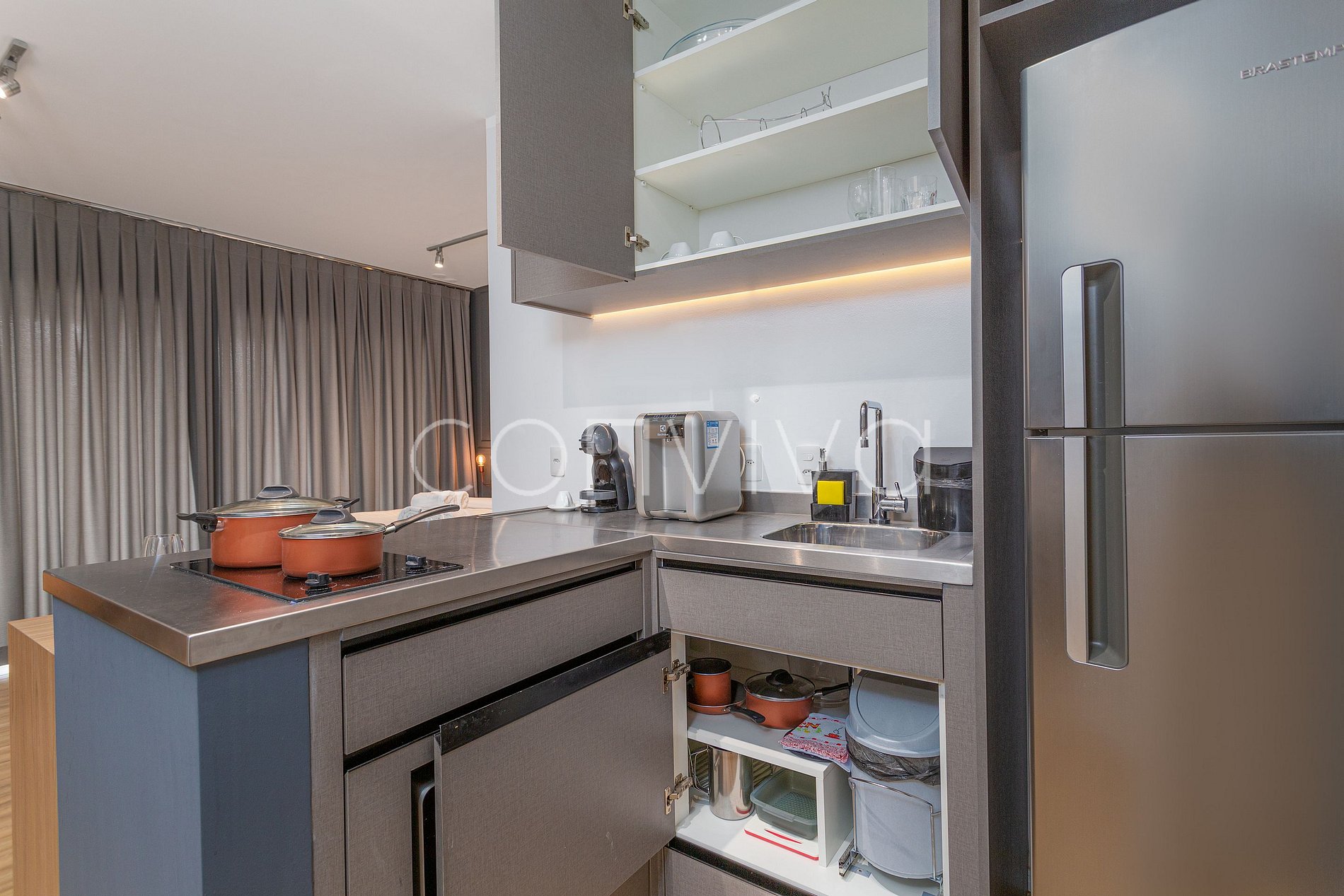 Espaço de 46m², no 3º andar, com cama queen size, banheiro e cozinha compacta, possui um ambiente super aconchegante.