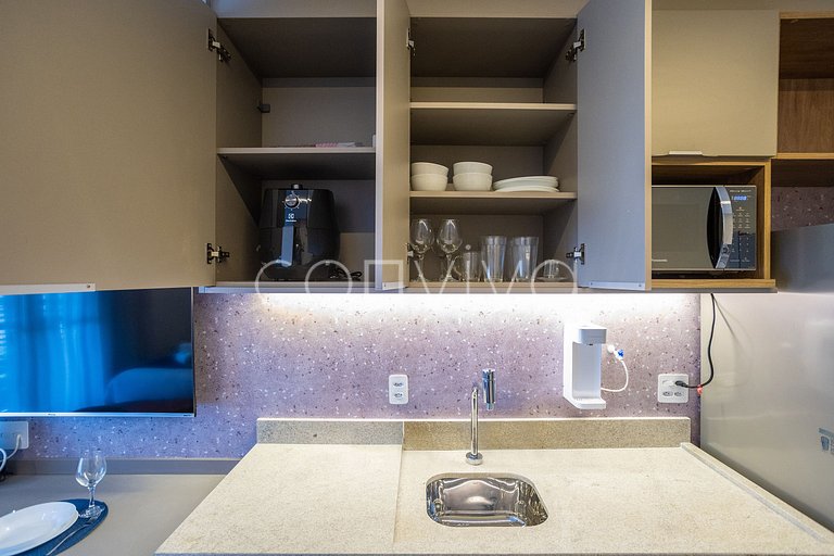 Com 35m², no 6º andar, dispõe de uma cama queen size, banheiro, cozinha completa e varanda mobiliada com vista para o bairro.