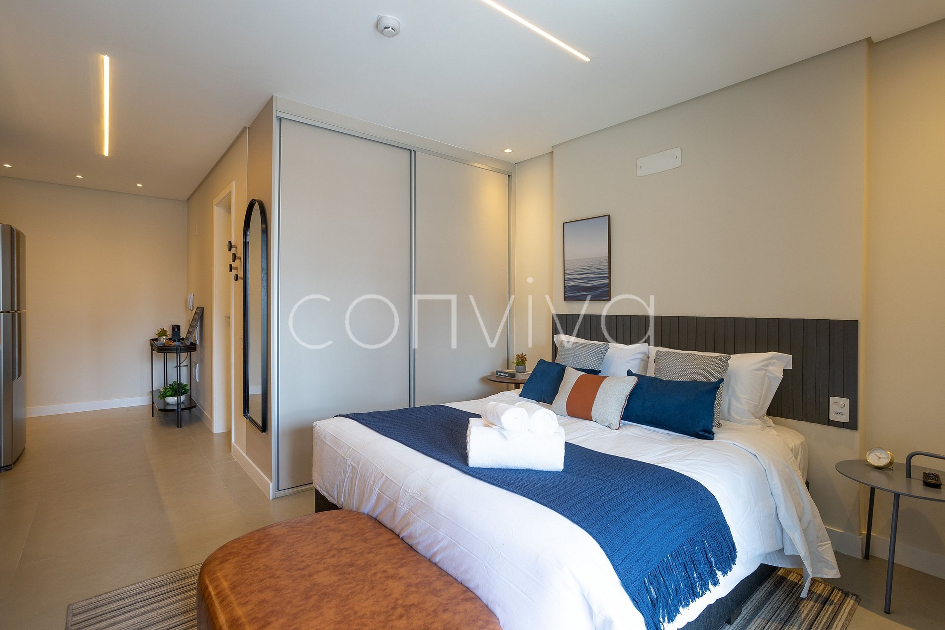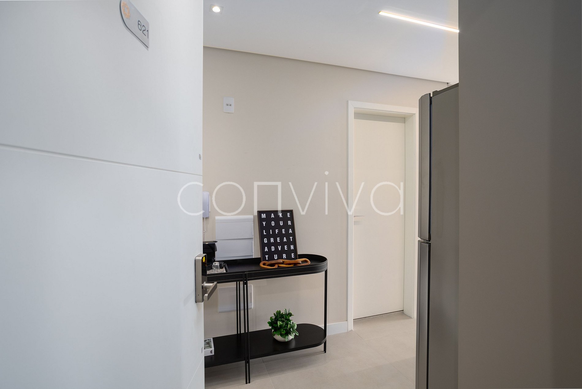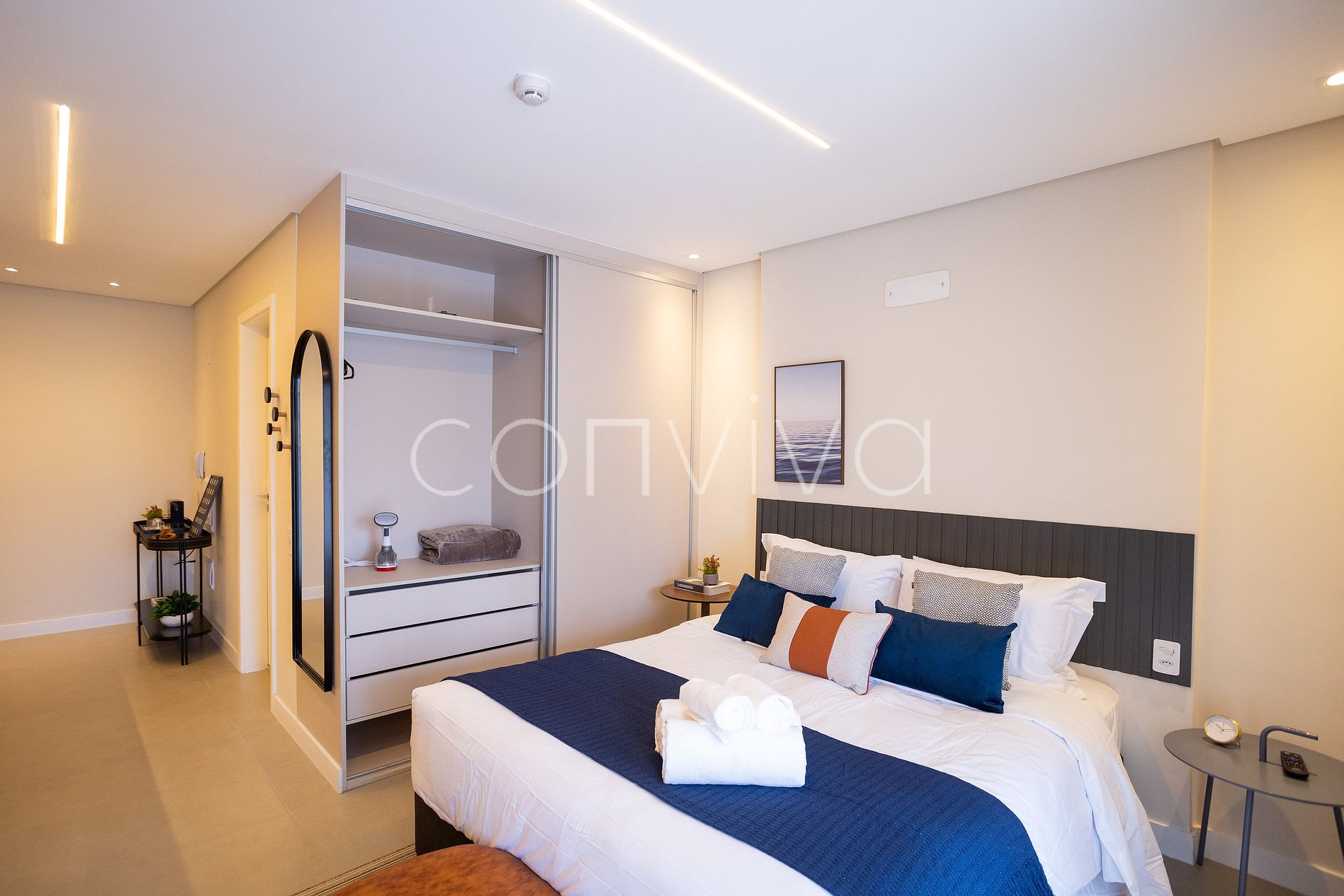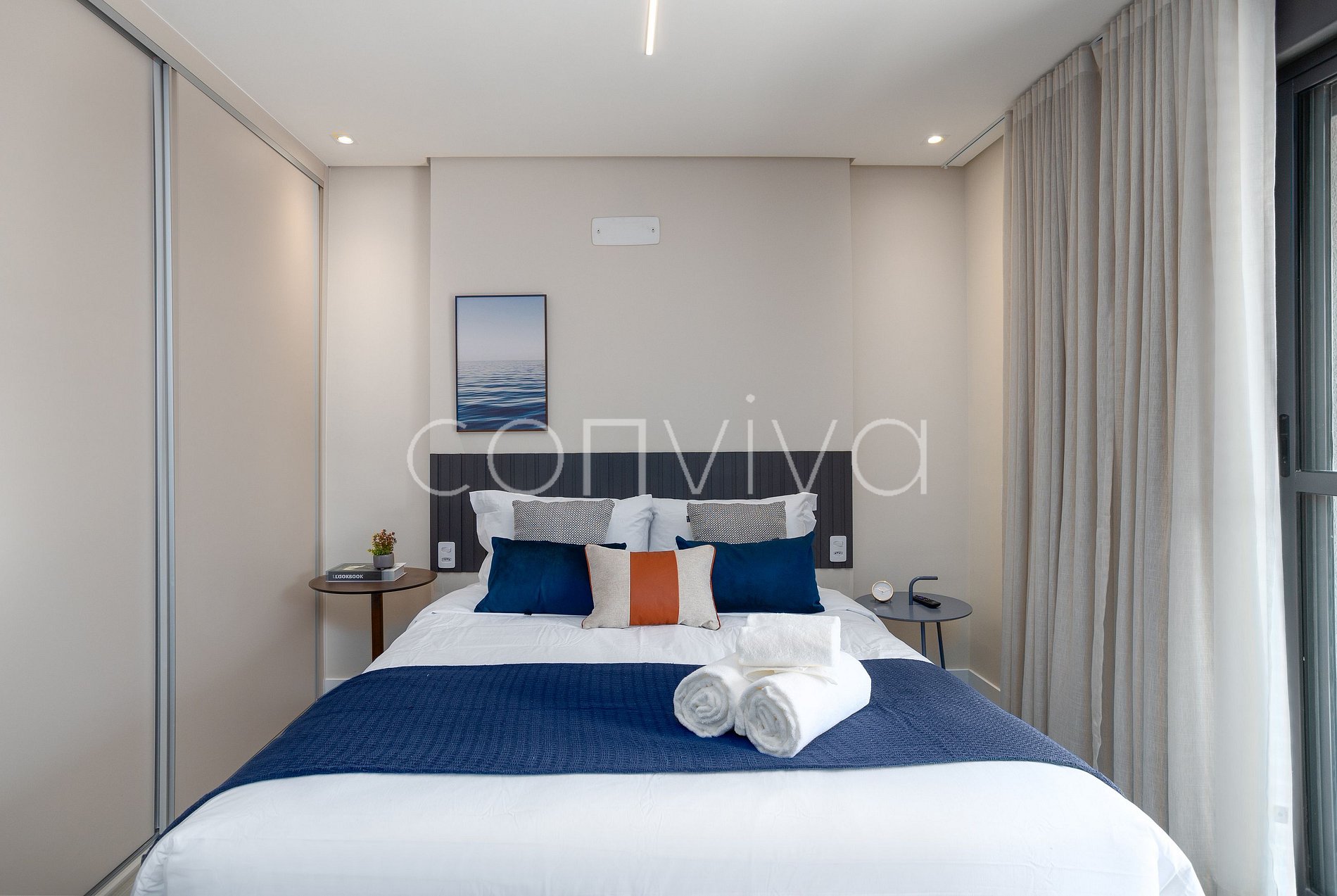 Com 35m², no 6º andar, dispõe de uma cama queen size, banheiro, cozinha completa e varanda mobiliada com vista para o bairro.