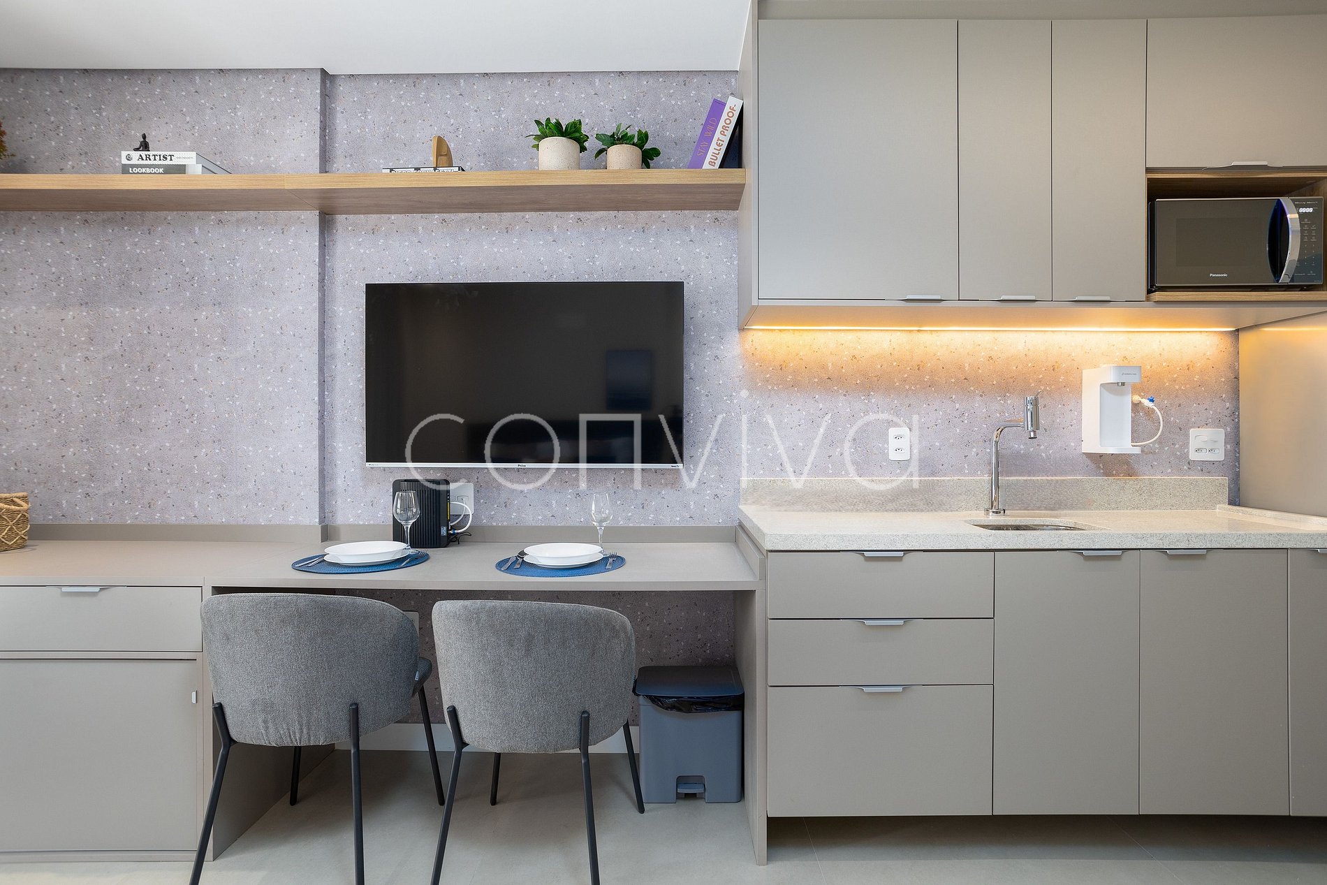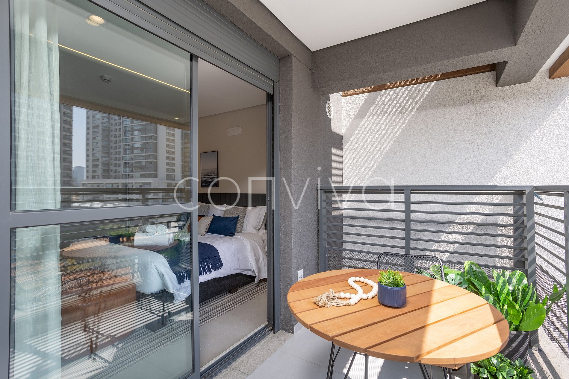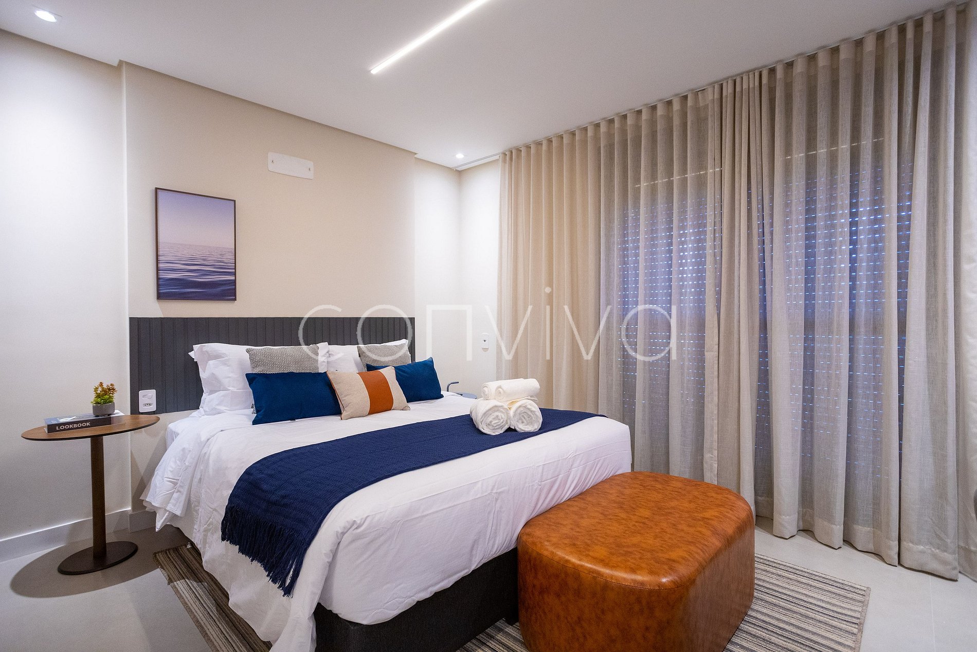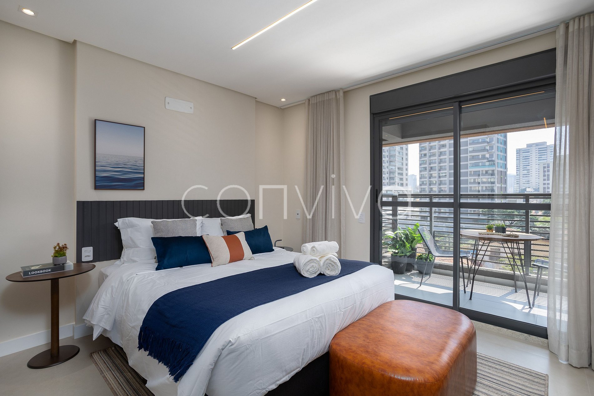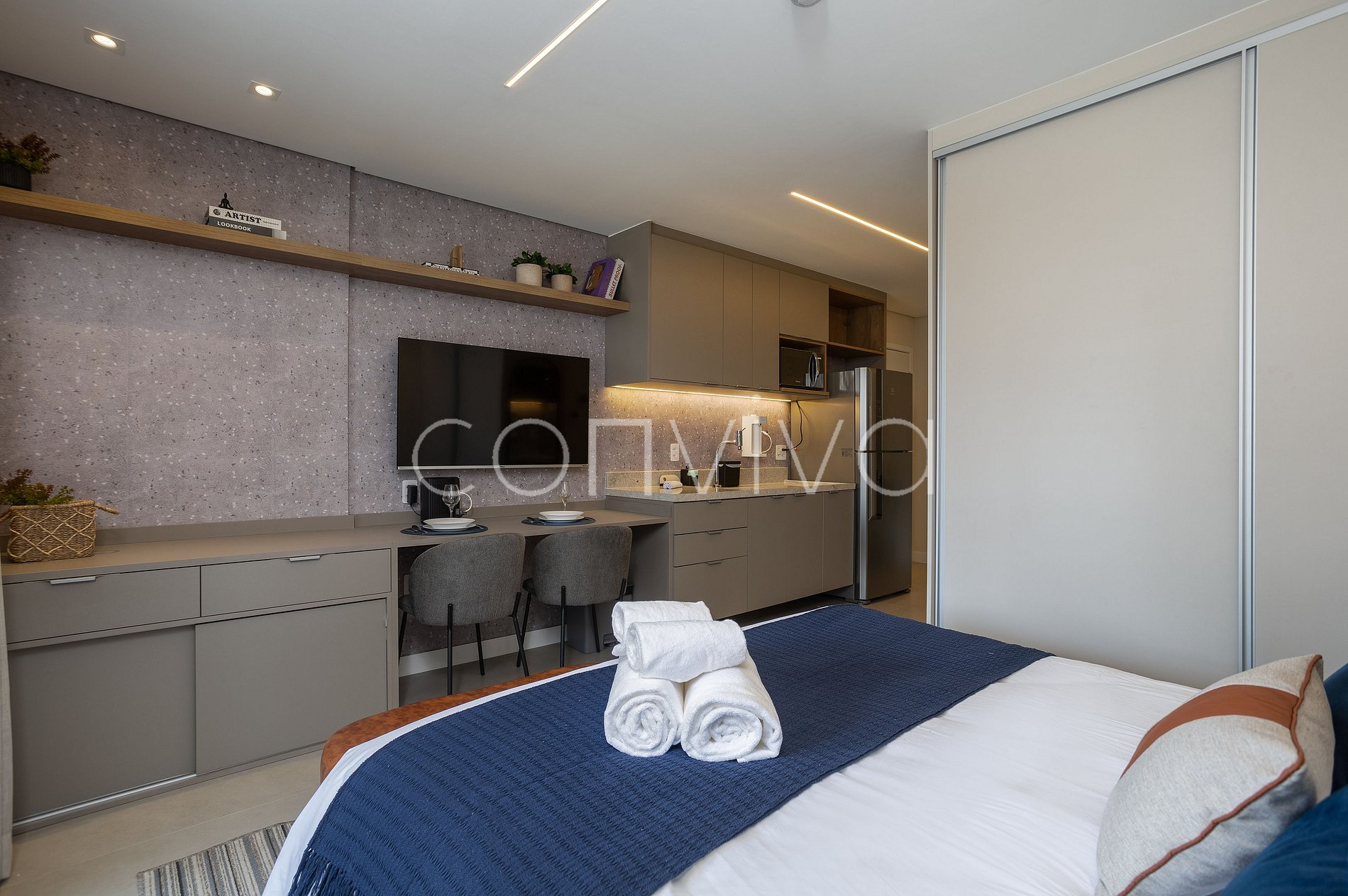 Com 35m², no 6º andar, dispõe de uma cama queen size, banheiro, cozinha completa e varanda mobiliada com vista para o bairro.