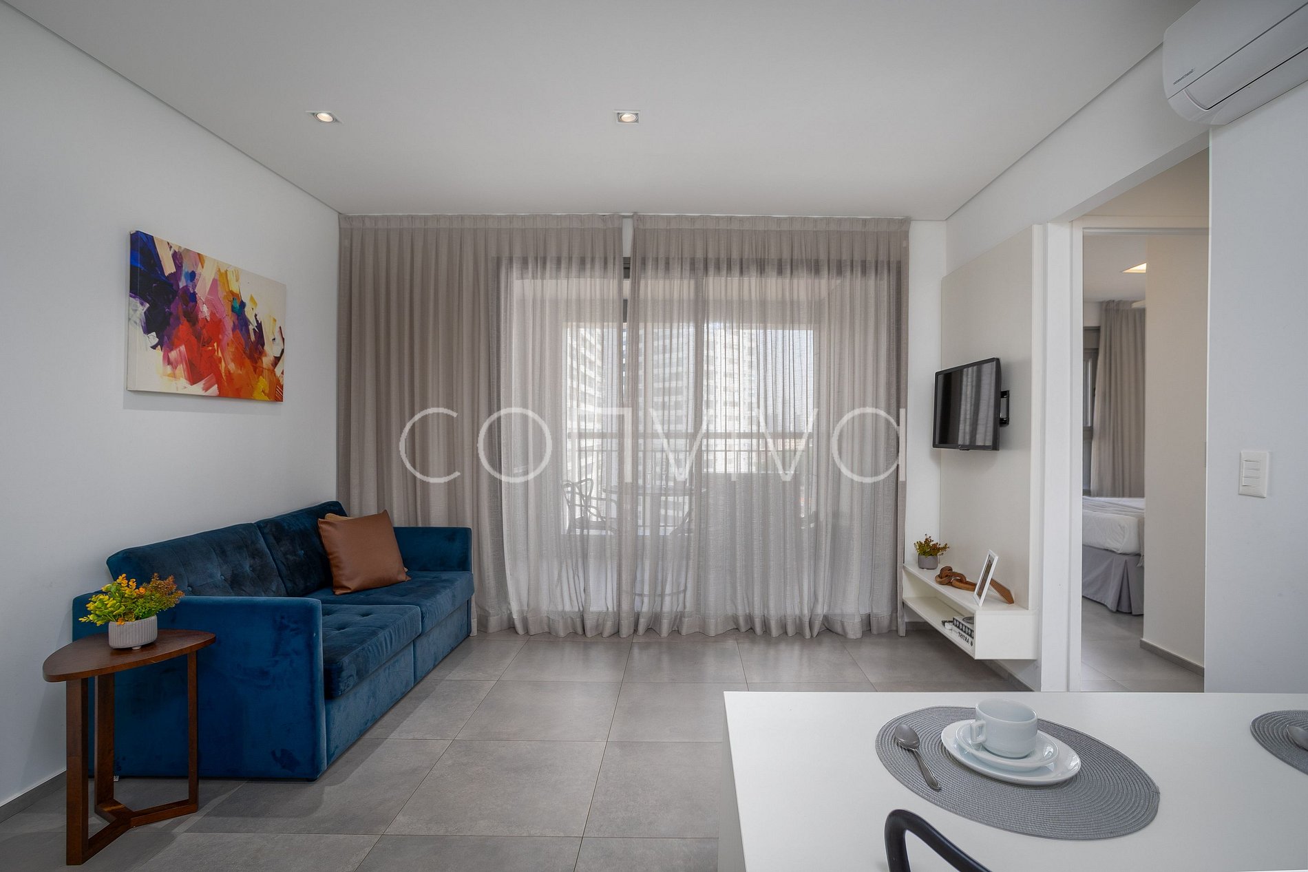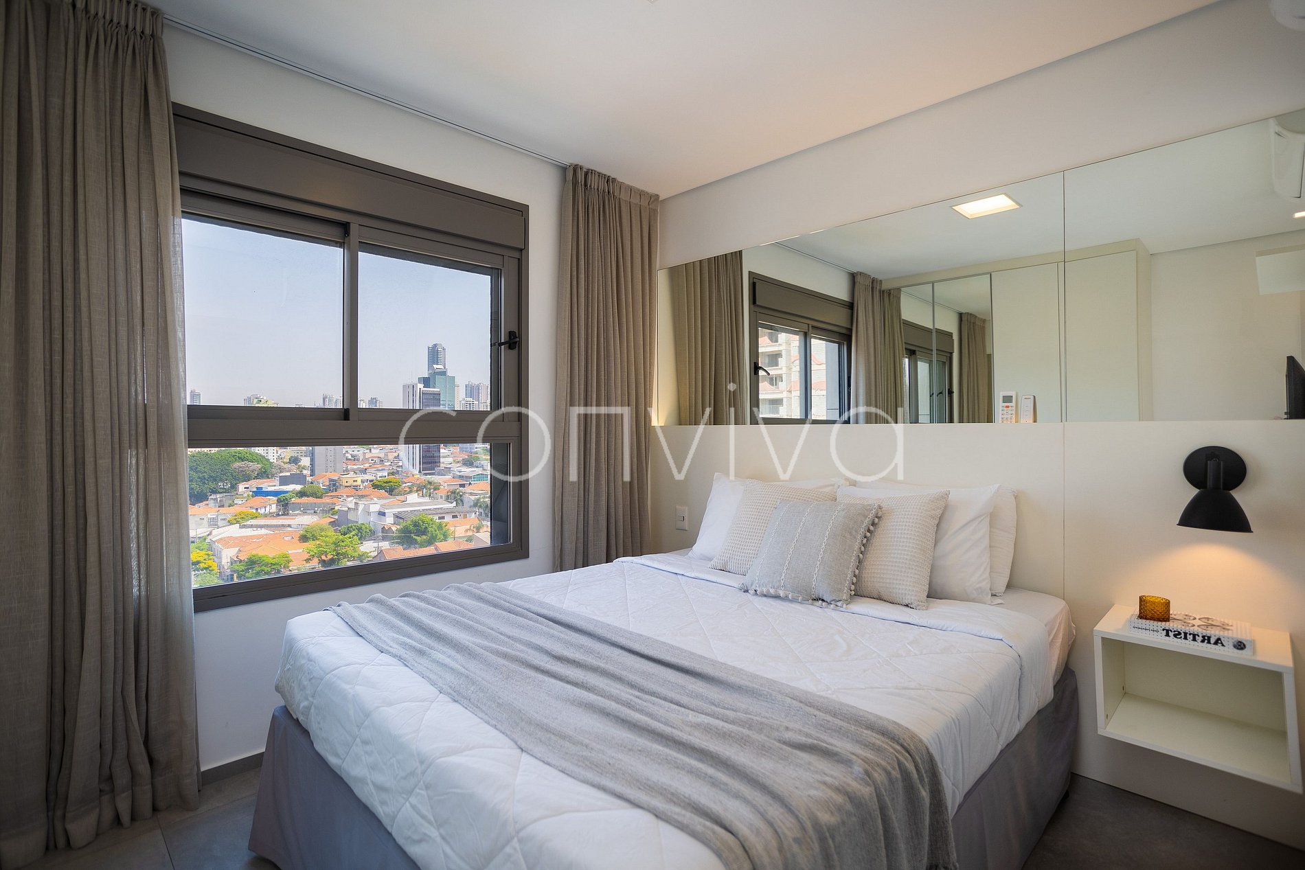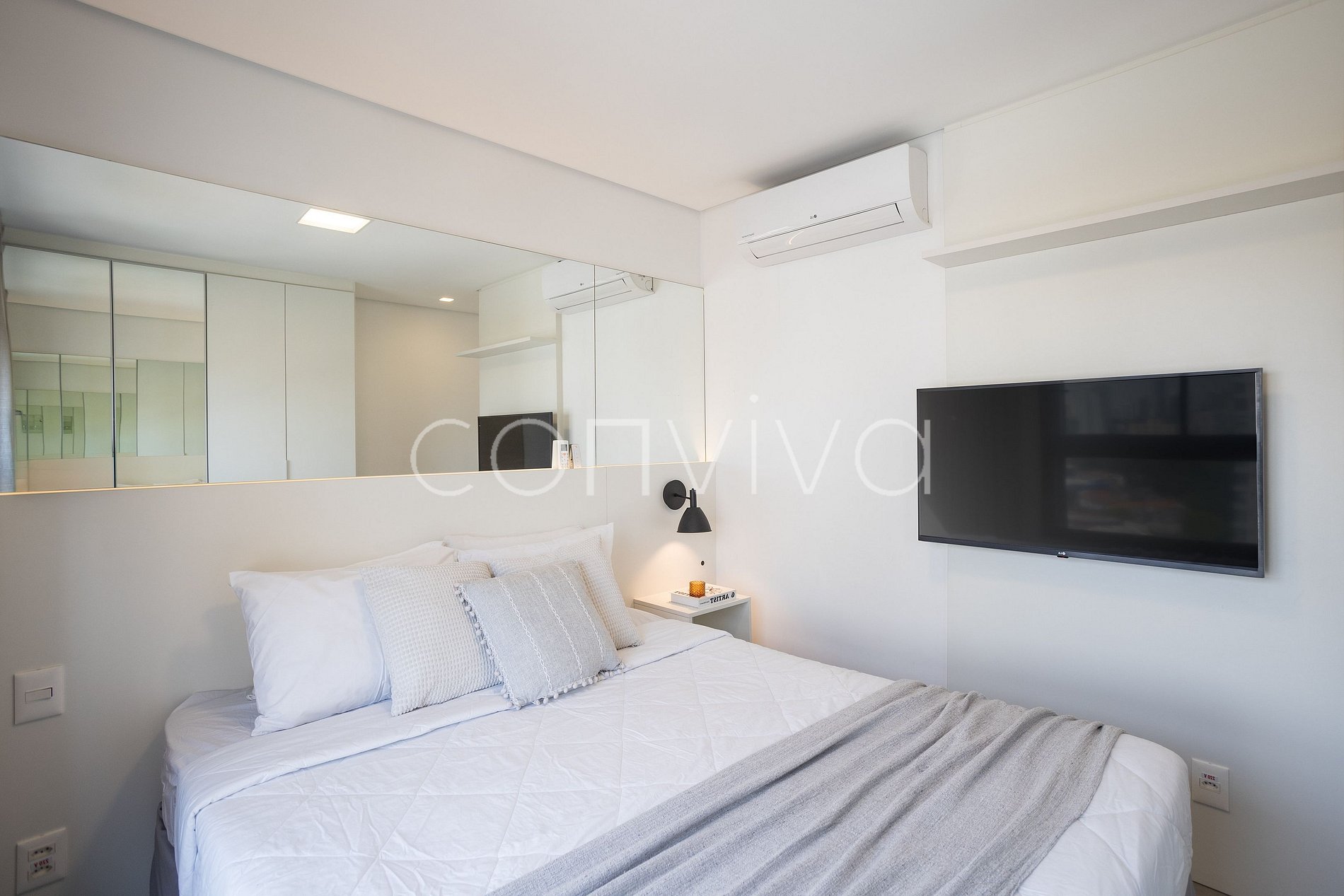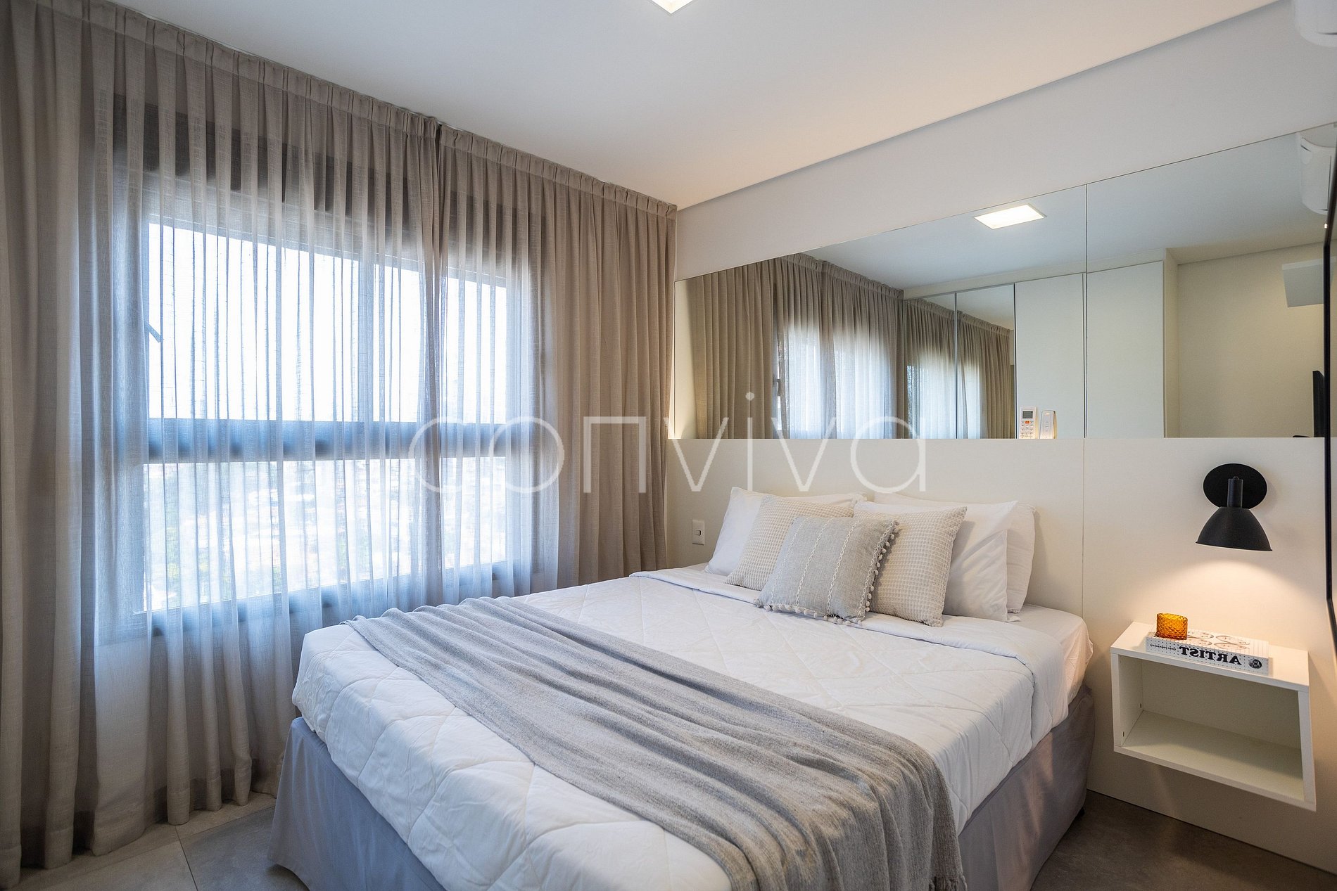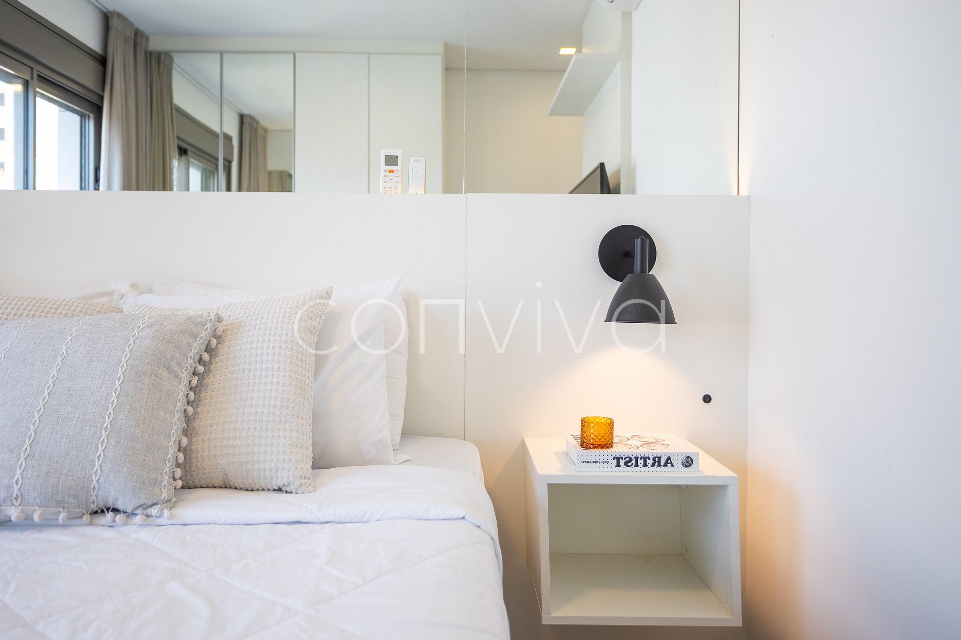 Com 57m², no 2º andar, o apartamento dispõe dois quartos, um com uma cama de casal e o outro com uma cama de solteiro e espaço para home office, cozinha equipada, banheiro, sofá e uma varanda com vista para o bairro.