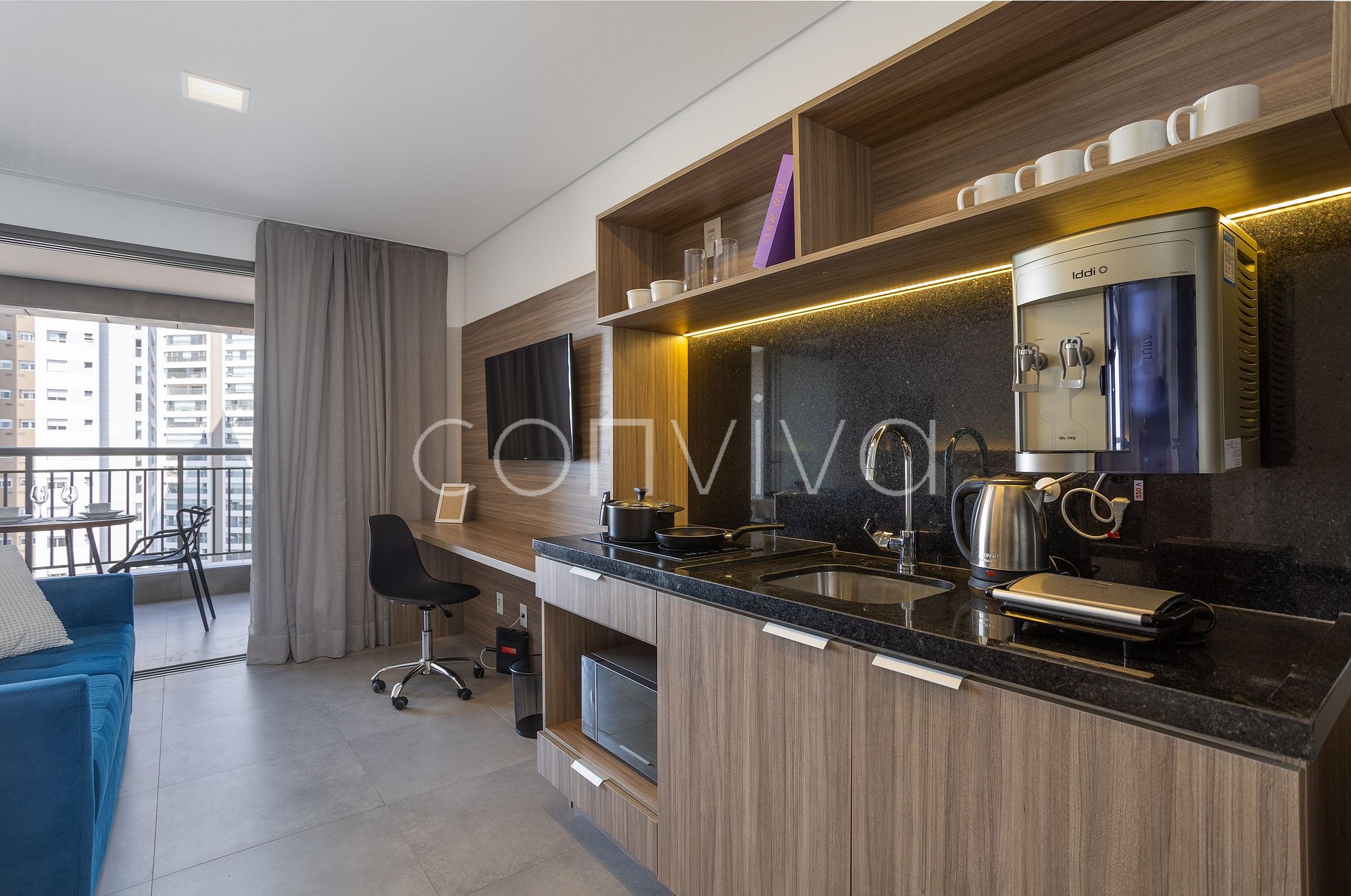 Com 35m², no 8º andar, o studio dispõe de uma cama de casal, espaço para home office, cozinha completa, banheiro, sofá e varanda com vista para o bairro.