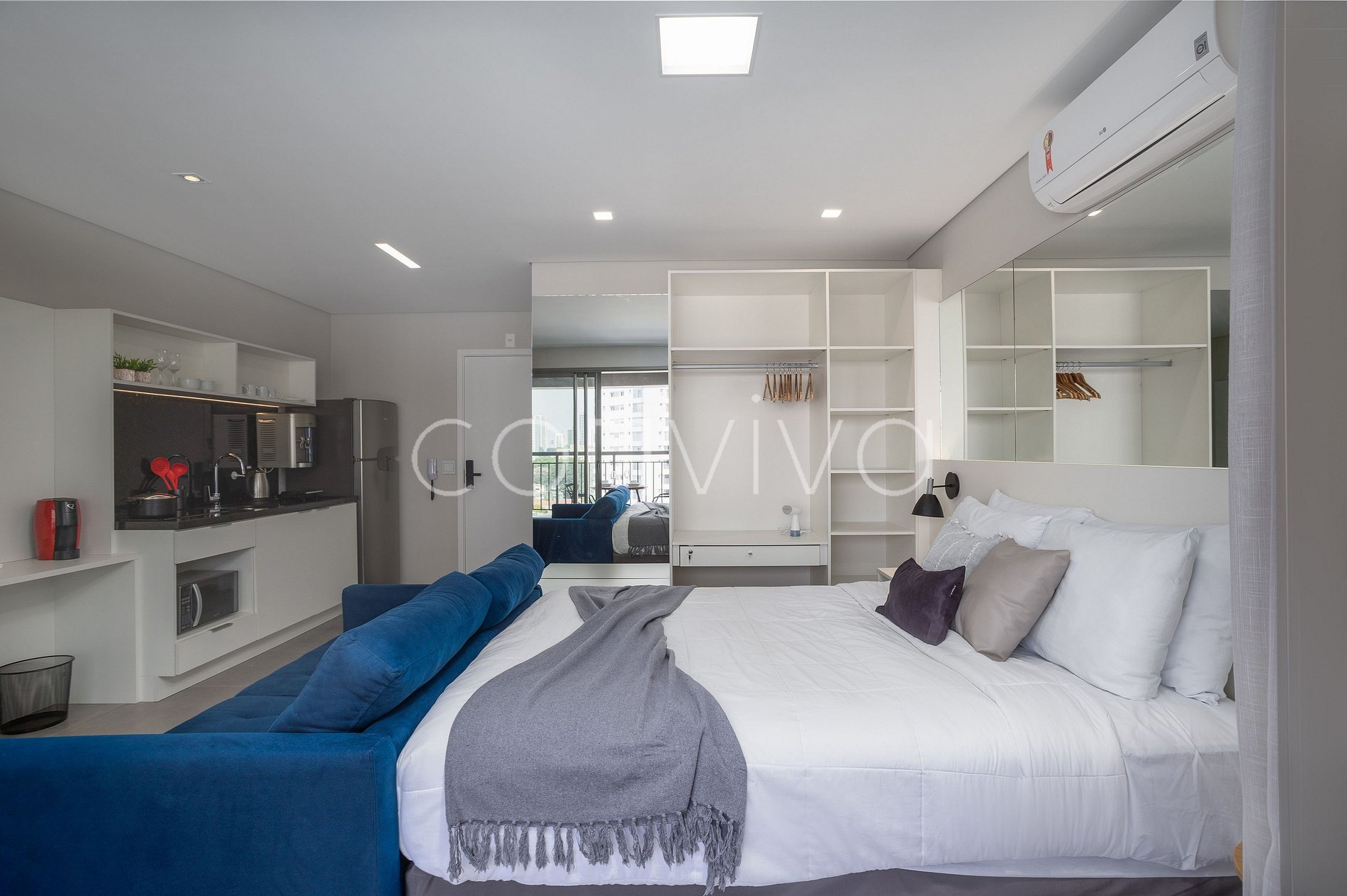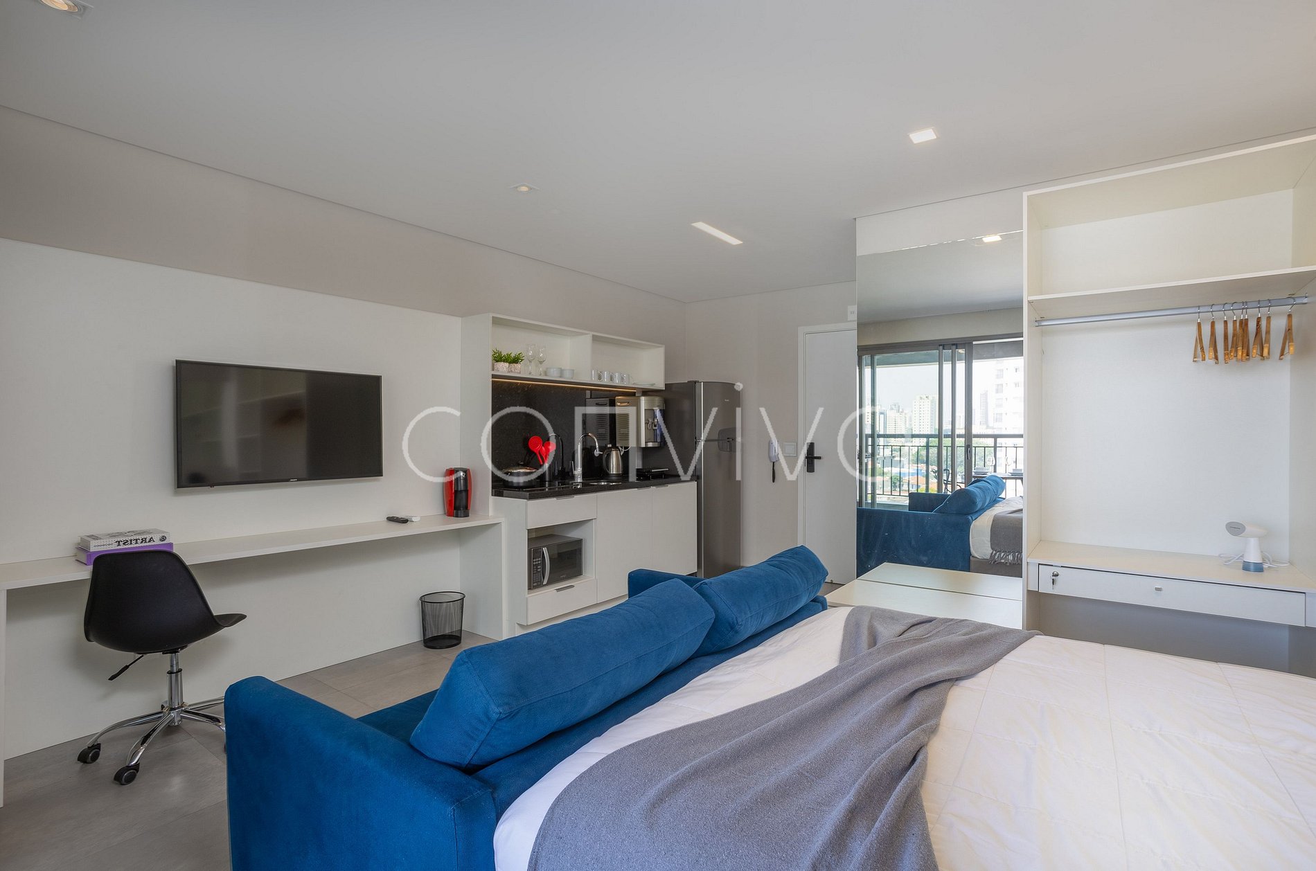 Com 35m², no 9º andar, o studio dispõe de uma cama de casal, espaço para home office, cozinha completa, banheiro, sofá e varanda com vista para o bairro.