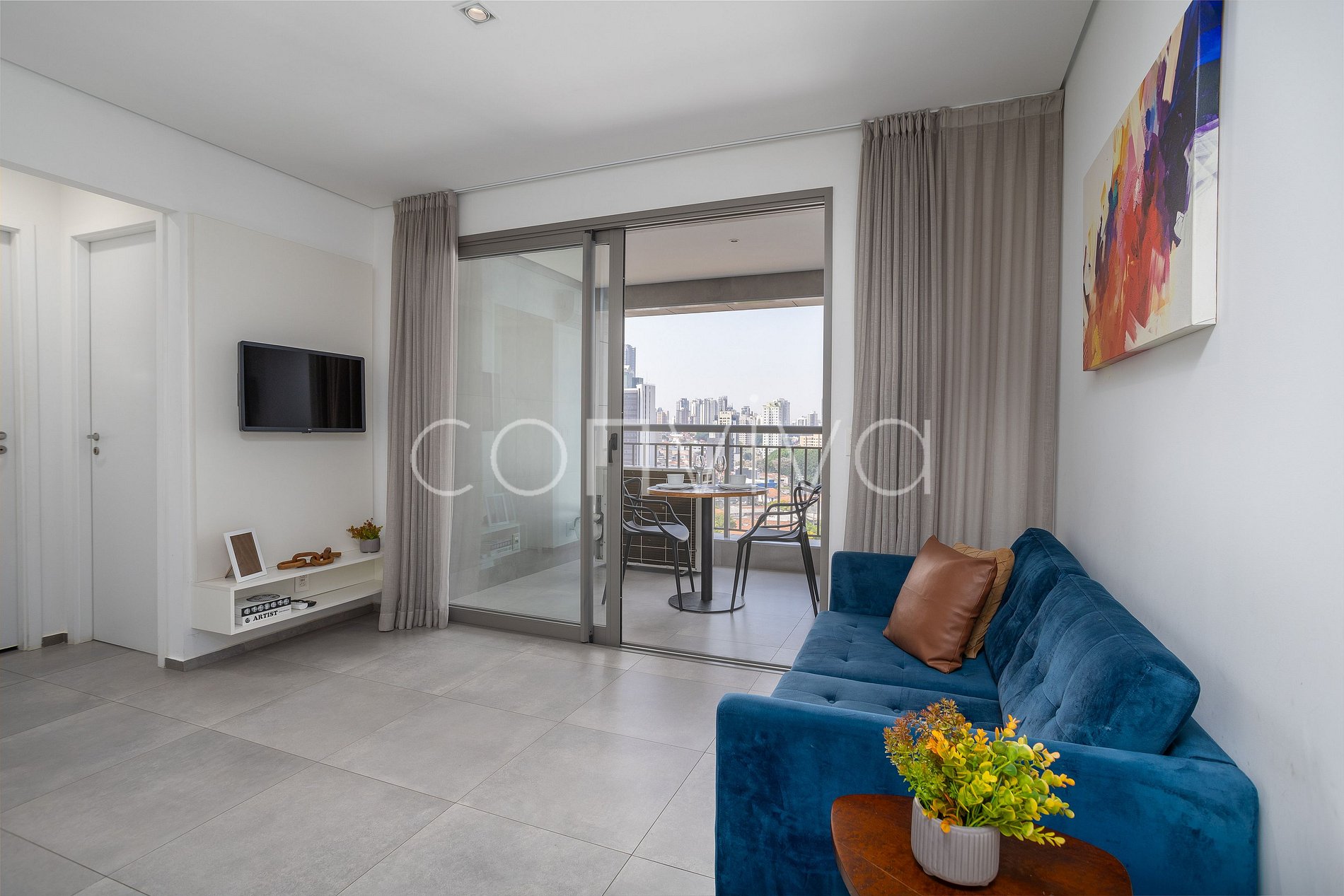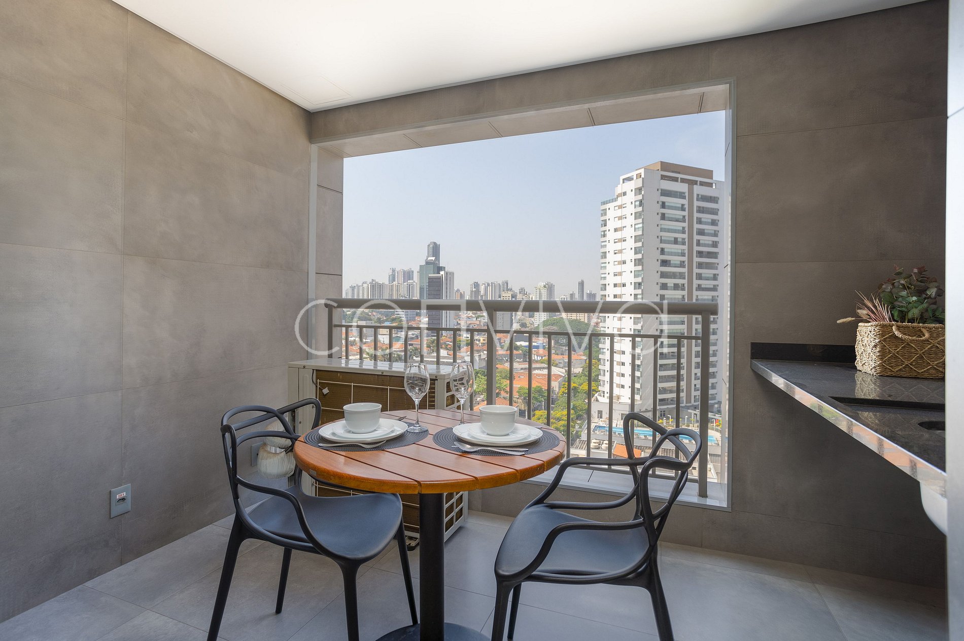 Com 57m², no 11º andar, o apartamento dispõe dois quartos, um com uma cama de casal e o outro com uma cama de solteiro e espaço para home office, cozinha equipada, banheiro, sofá e uma varanda com vista para o bairro.