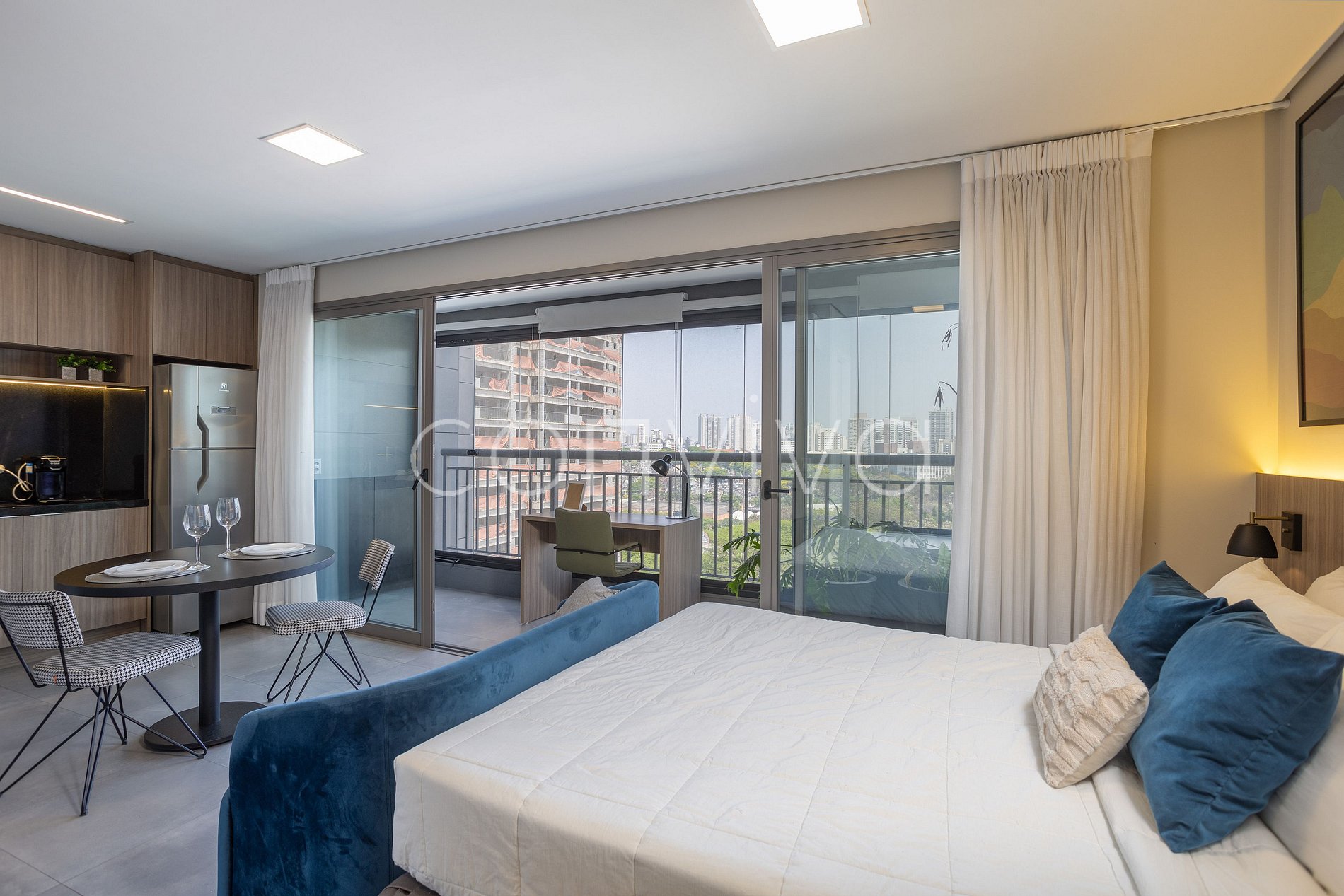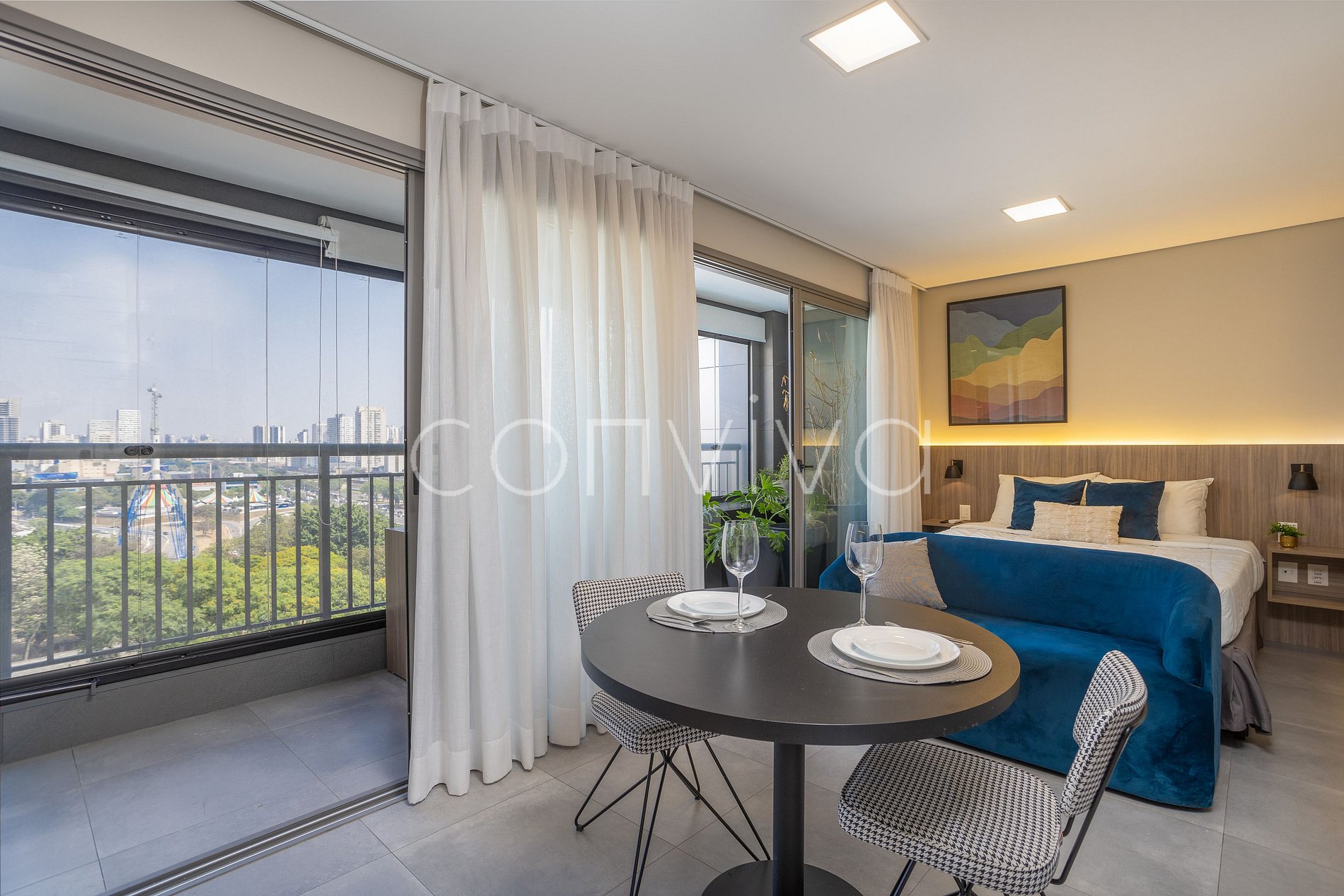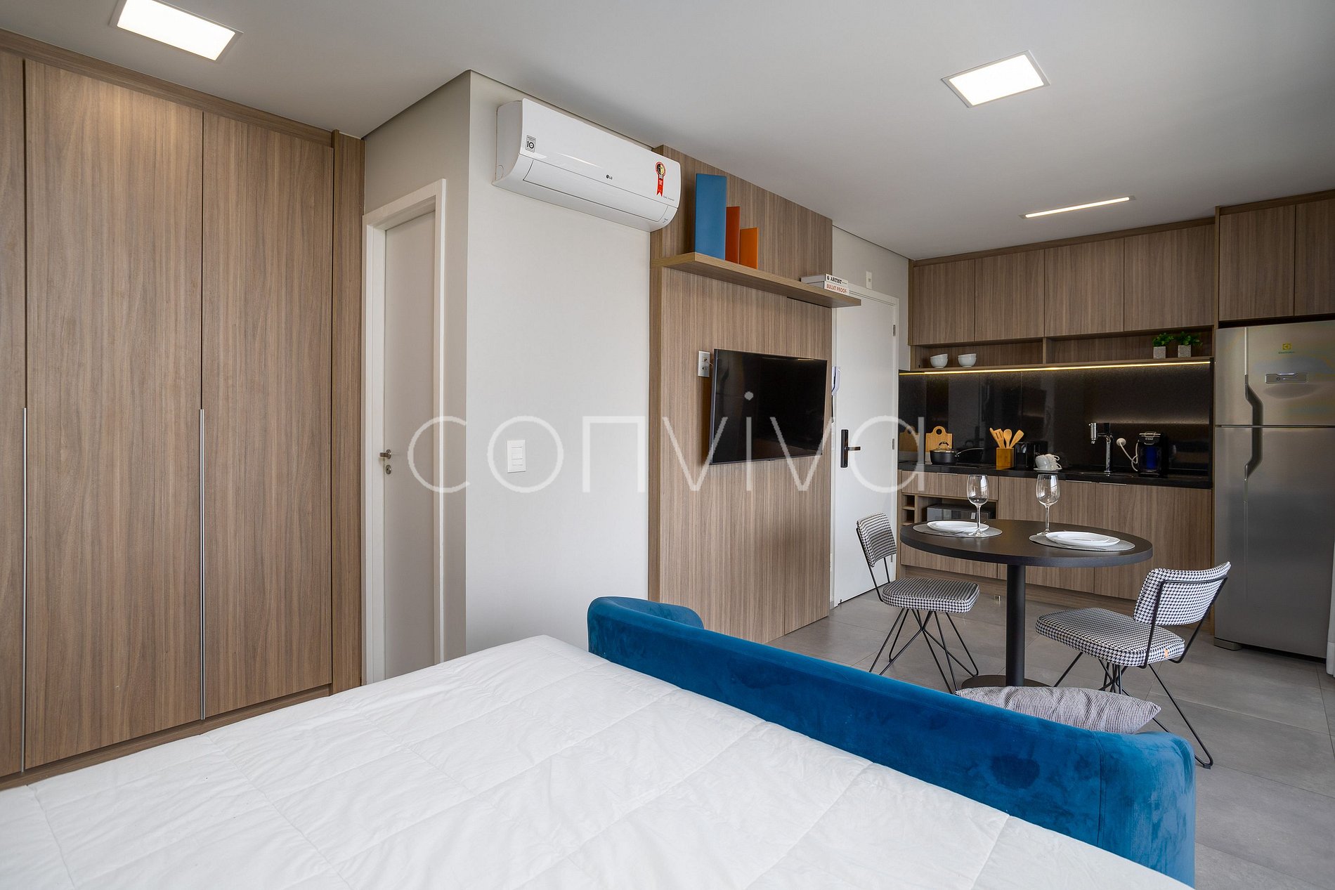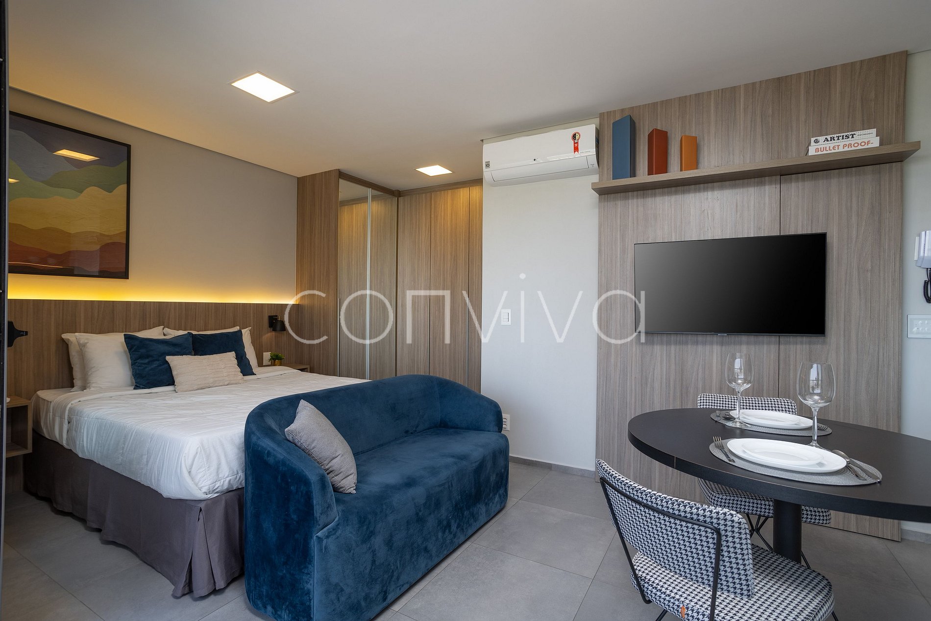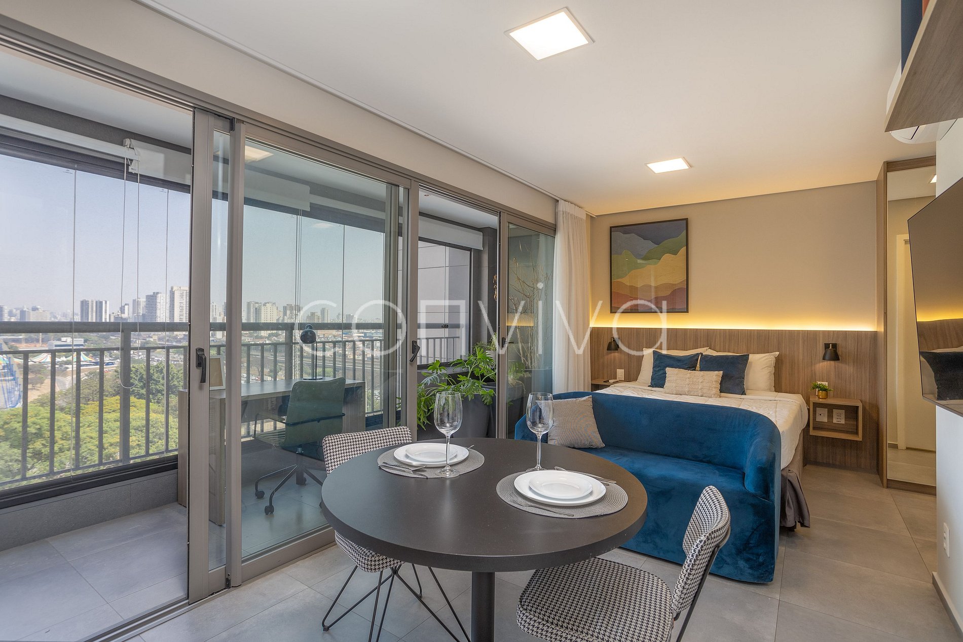 Com 35m², no 9º andar, o studio dispõe de uma cama de casal + sofá-cama, espaço para home office, cozinha completa, banheiro, sofá e varanda com vista para o bairro.