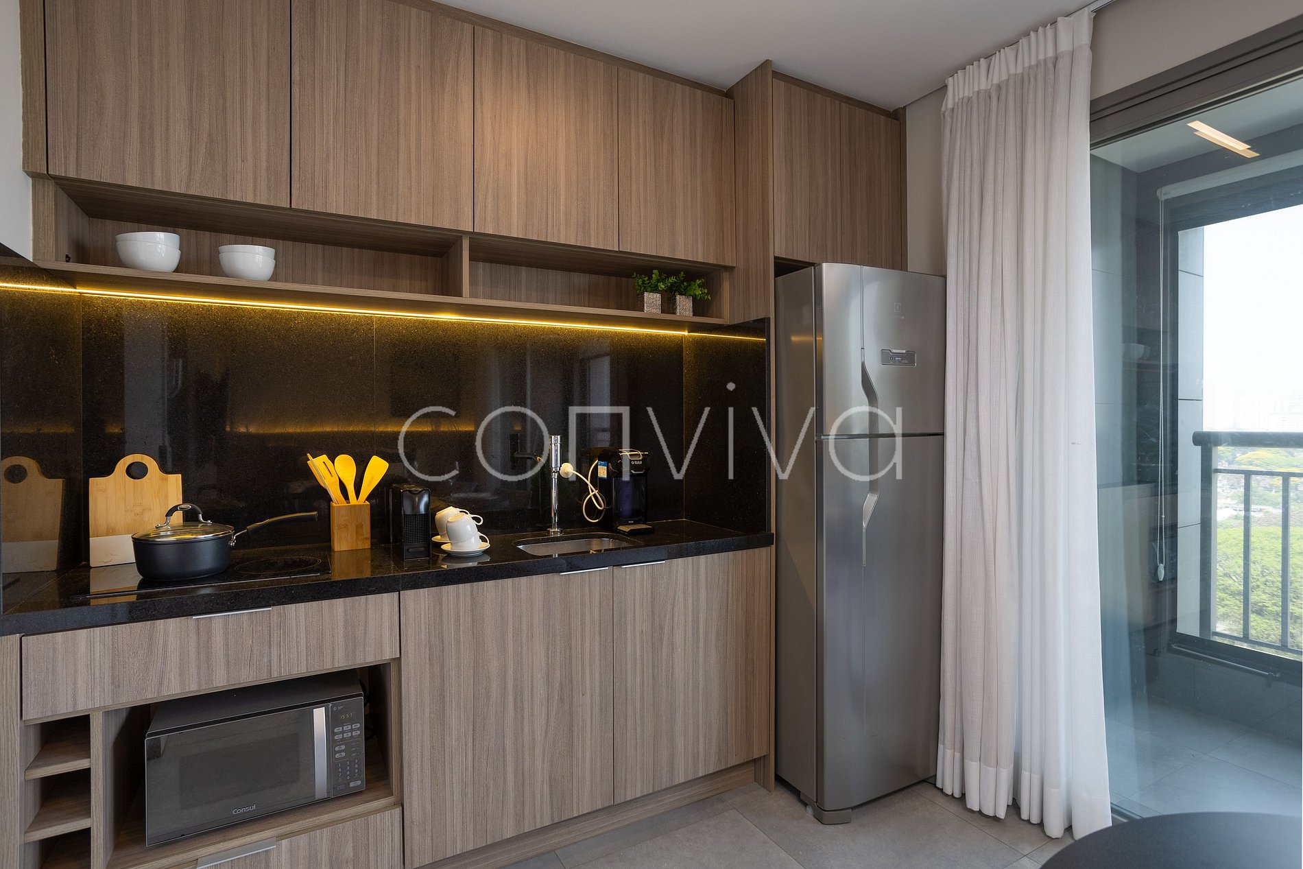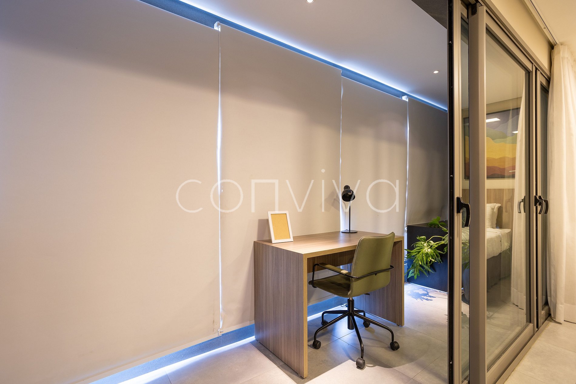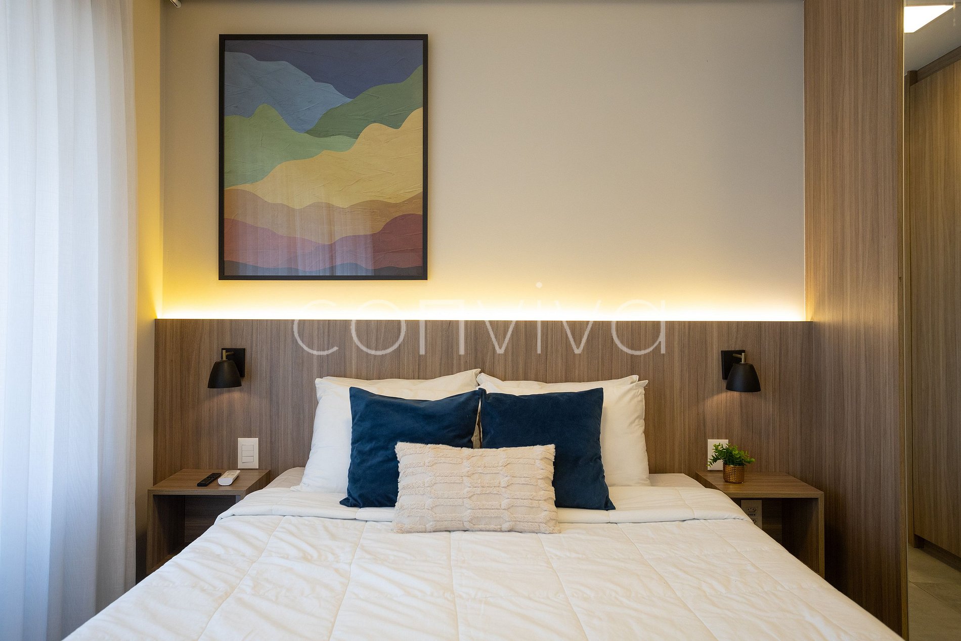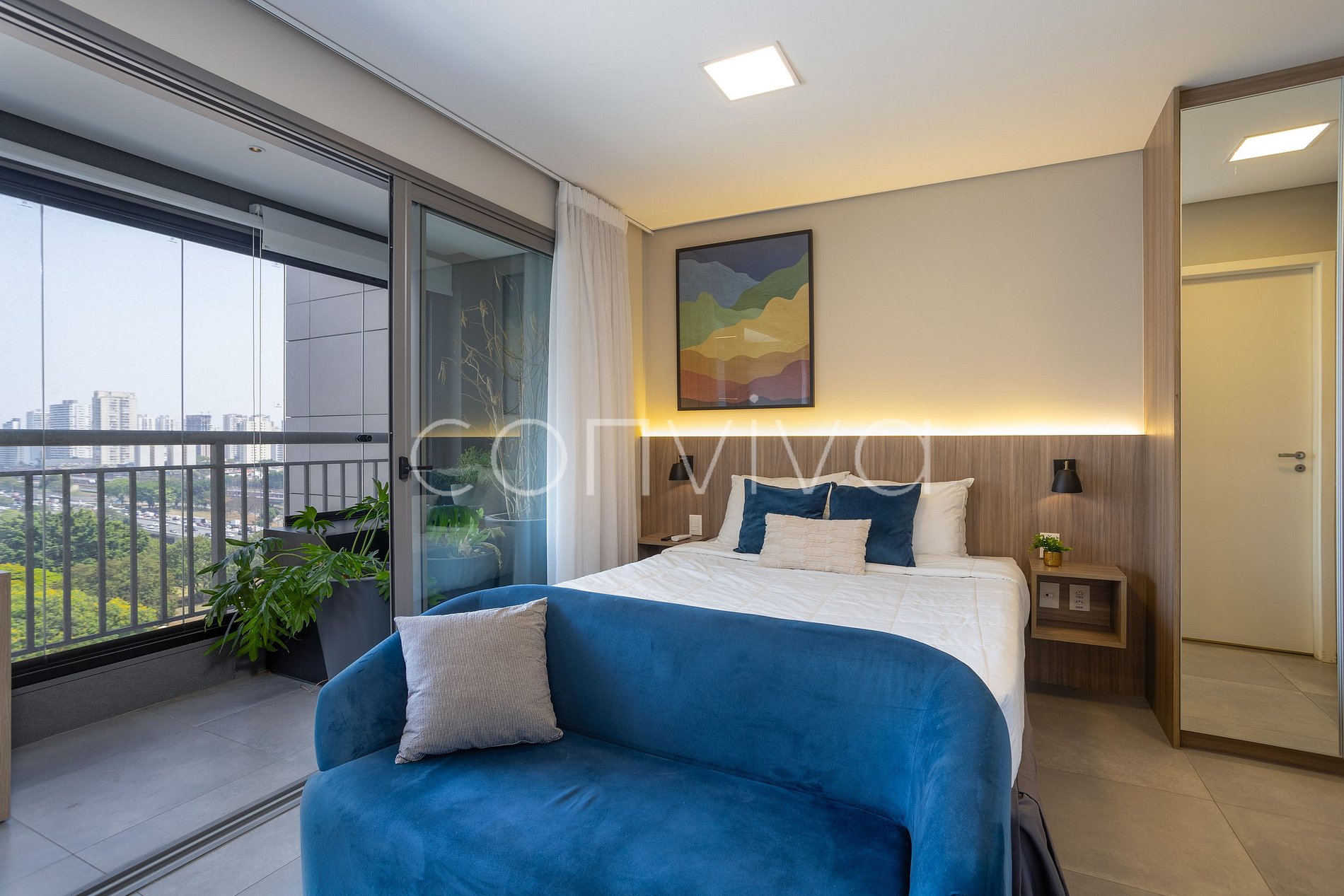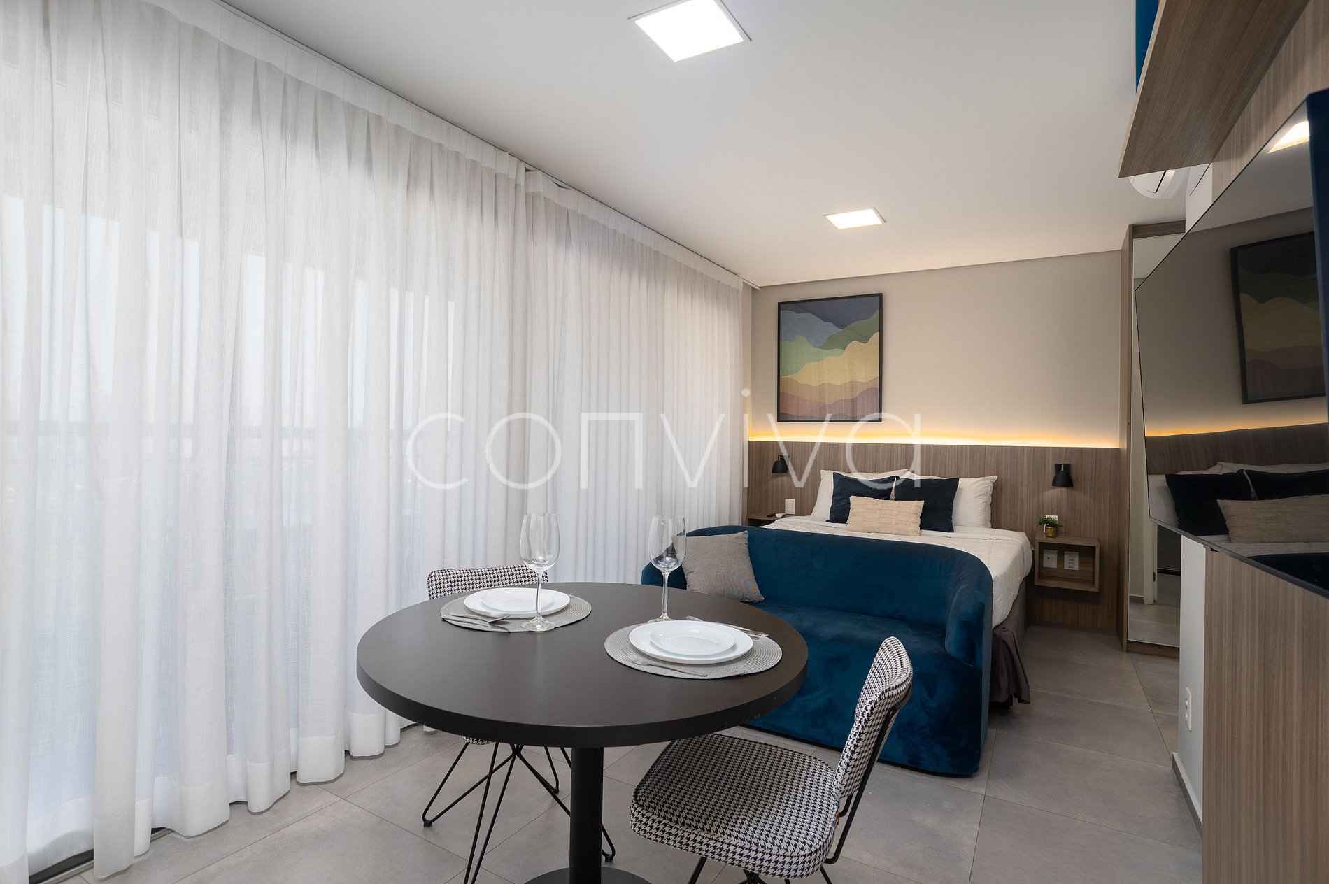 Com 35m², no 9º andar, o studio dispõe de uma cama de casal + sofá-cama, espaço para home office, cozinha completa, banheiro, sofá e varanda com vista para o bairro.