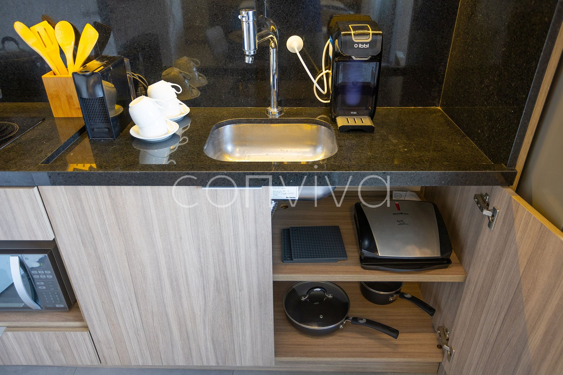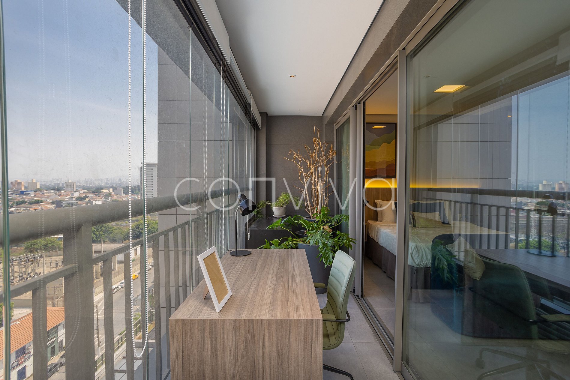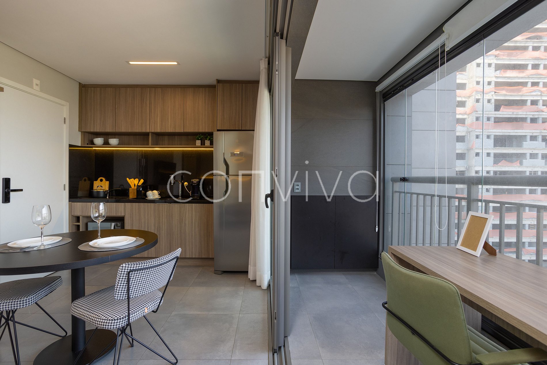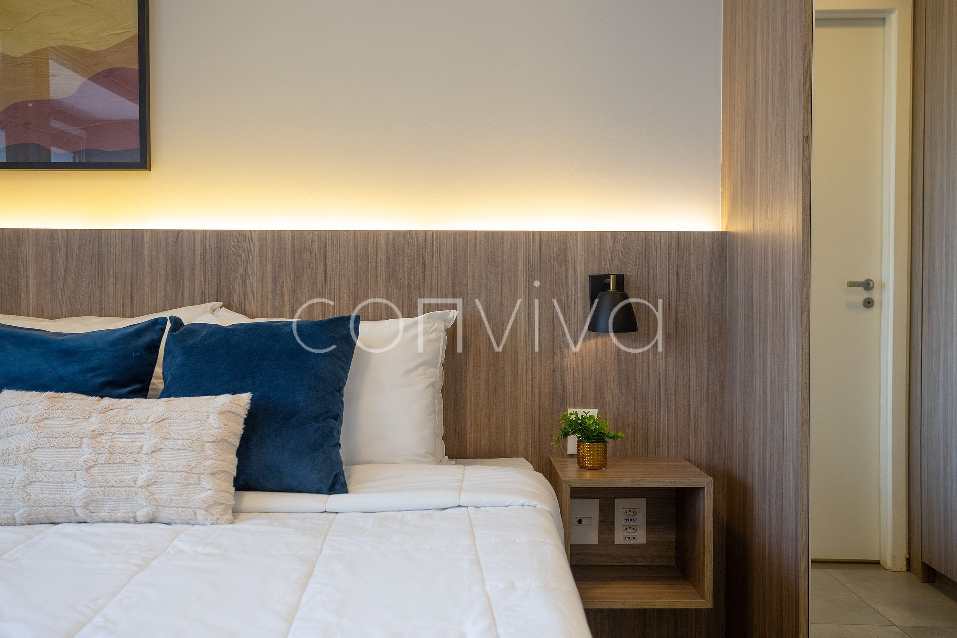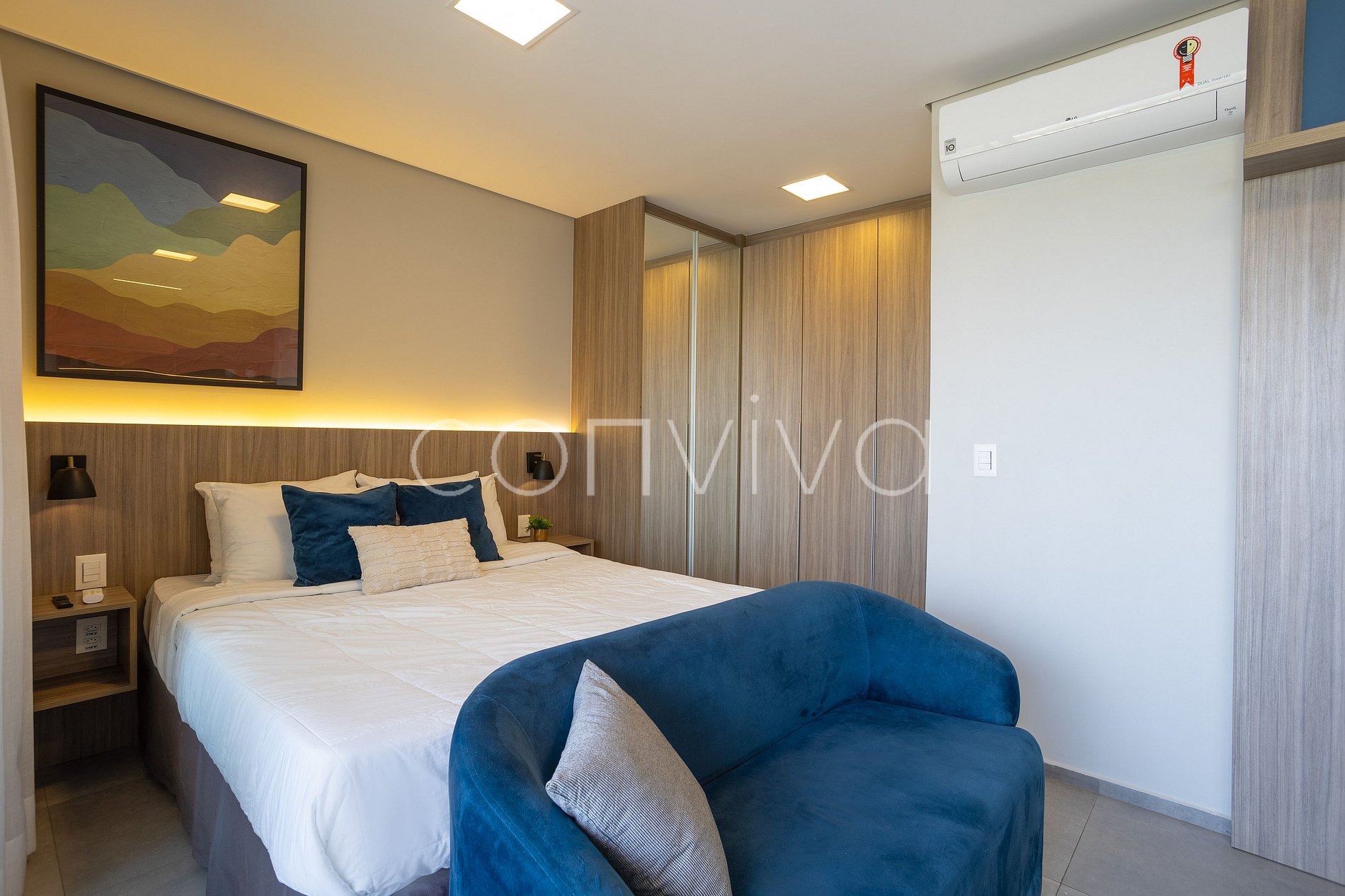 Com 35m², no 9º andar, o studio dispõe de uma cama de casal + sofá-cama, espaço para home office, cozinha completa, banheiro, sofá e varanda com vista para o bairro.