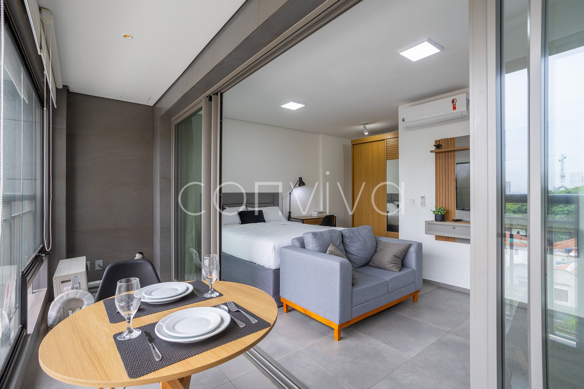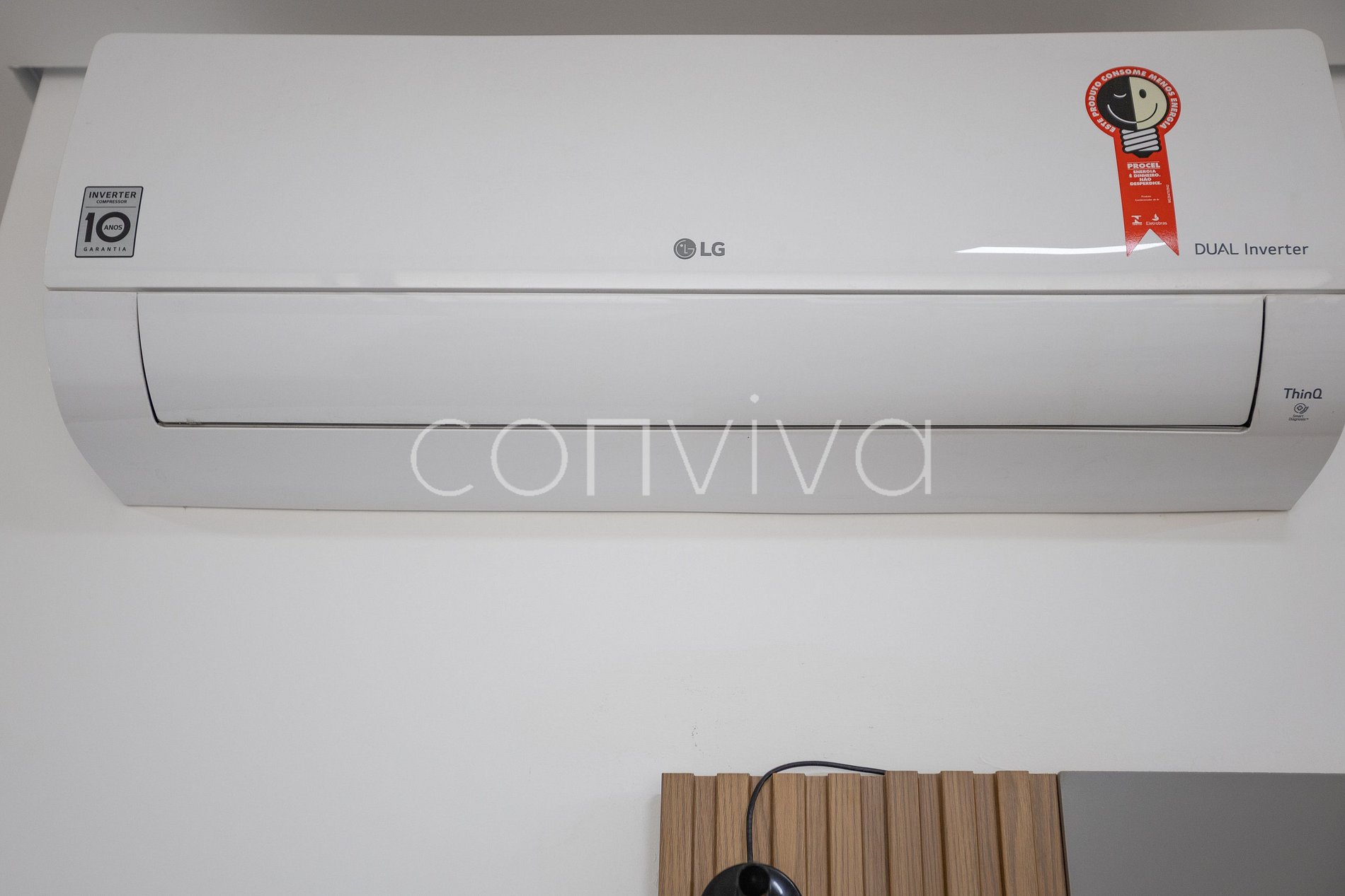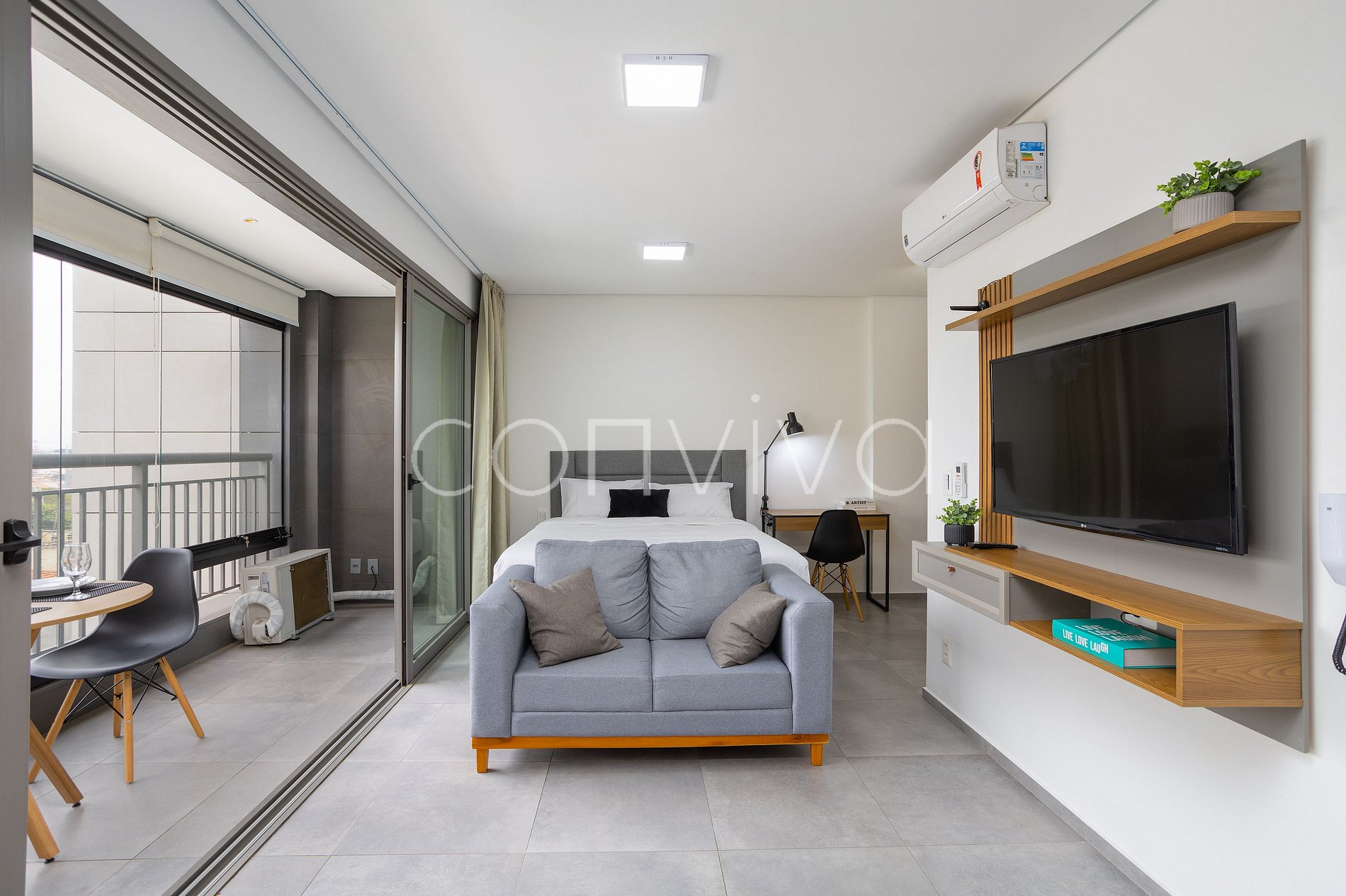 Espaço de 35m², no 4º andar, composto por uma cama de casal, sofá, espaço para home office, banheiro, cozinha completa e varanda.