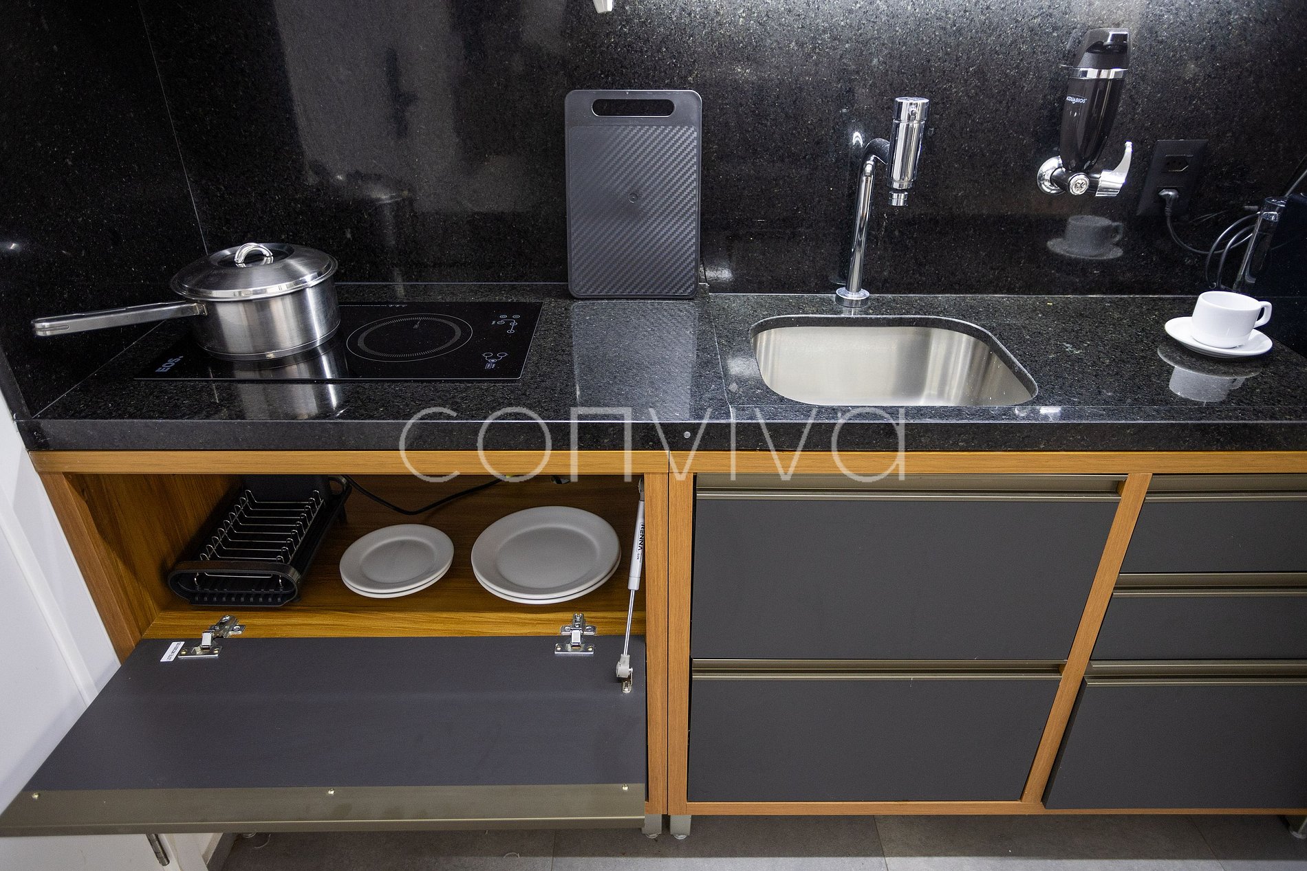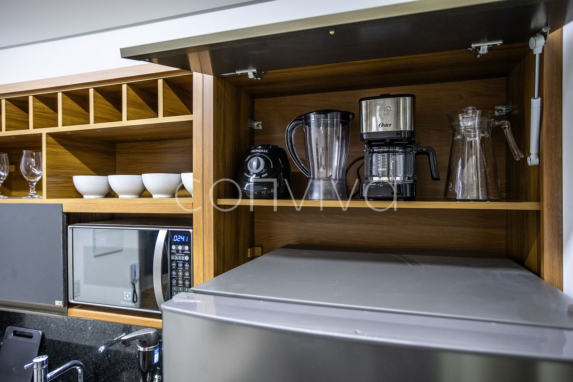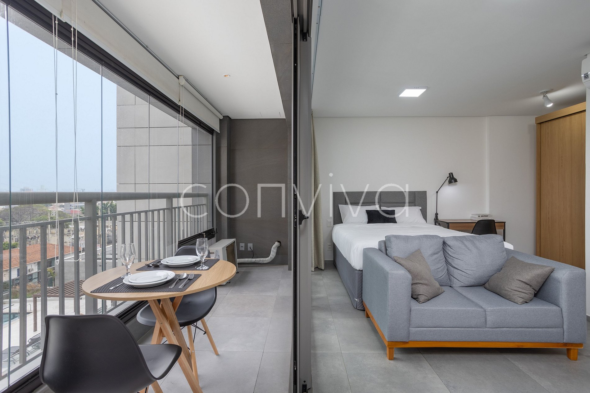 Espaço de 35m², no 4º andar, composto por uma cama de casal, sofá, espaço para home office, banheiro, cozinha completa e varanda.