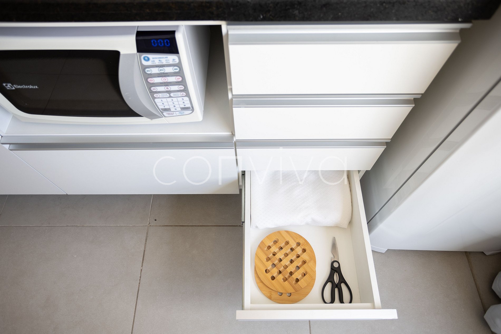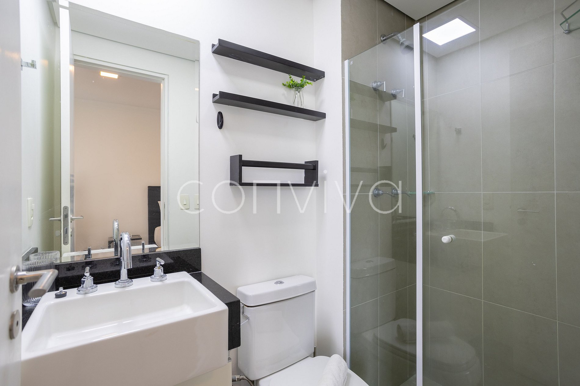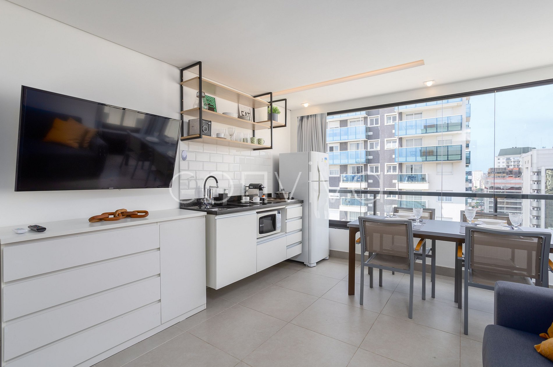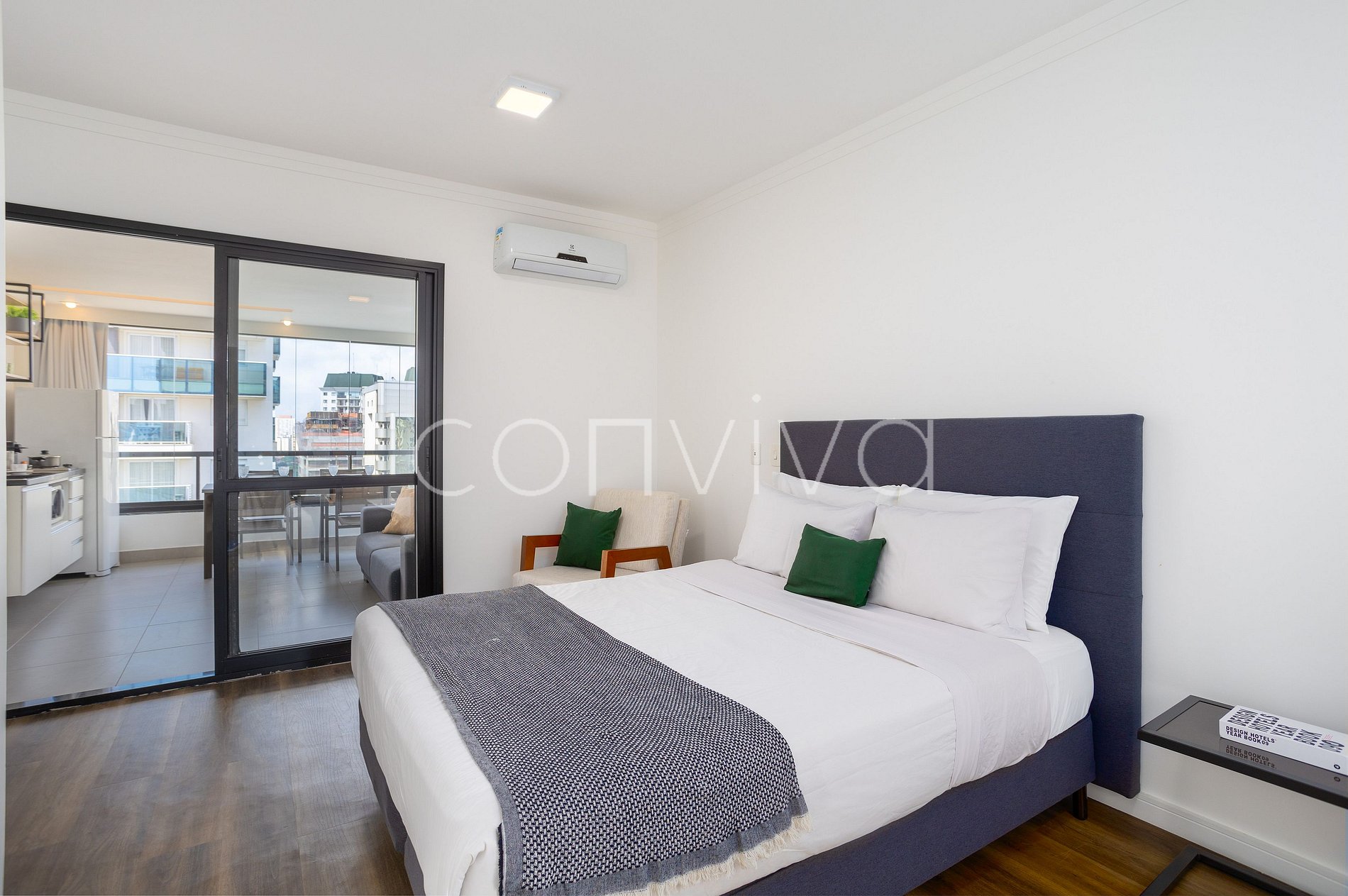 Espaço de 57m², no 19º andar, possui uma suíte com cama queen size, sofá extensor, espaço exclusivo para home office, cozinha completa e varanda ampla.