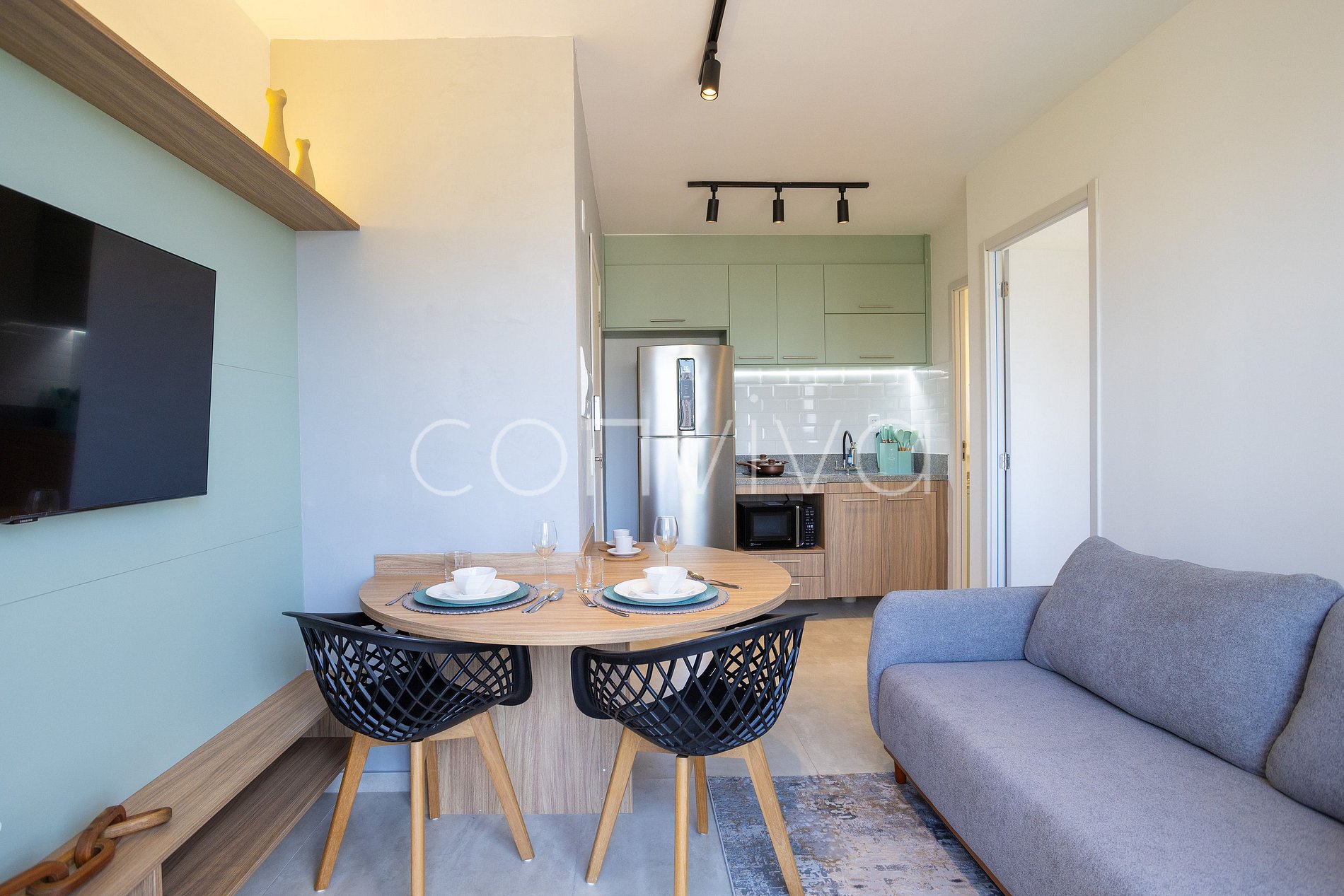 Localizado no charmoso bairro de Moema, este moderno apartamento de 27m² no 8º andar oferece o máximo de conforto e praticidade para a sua estadia em São Paulo, ideal para quem busca uma experiência única, seja a lazer ou a negócios.
