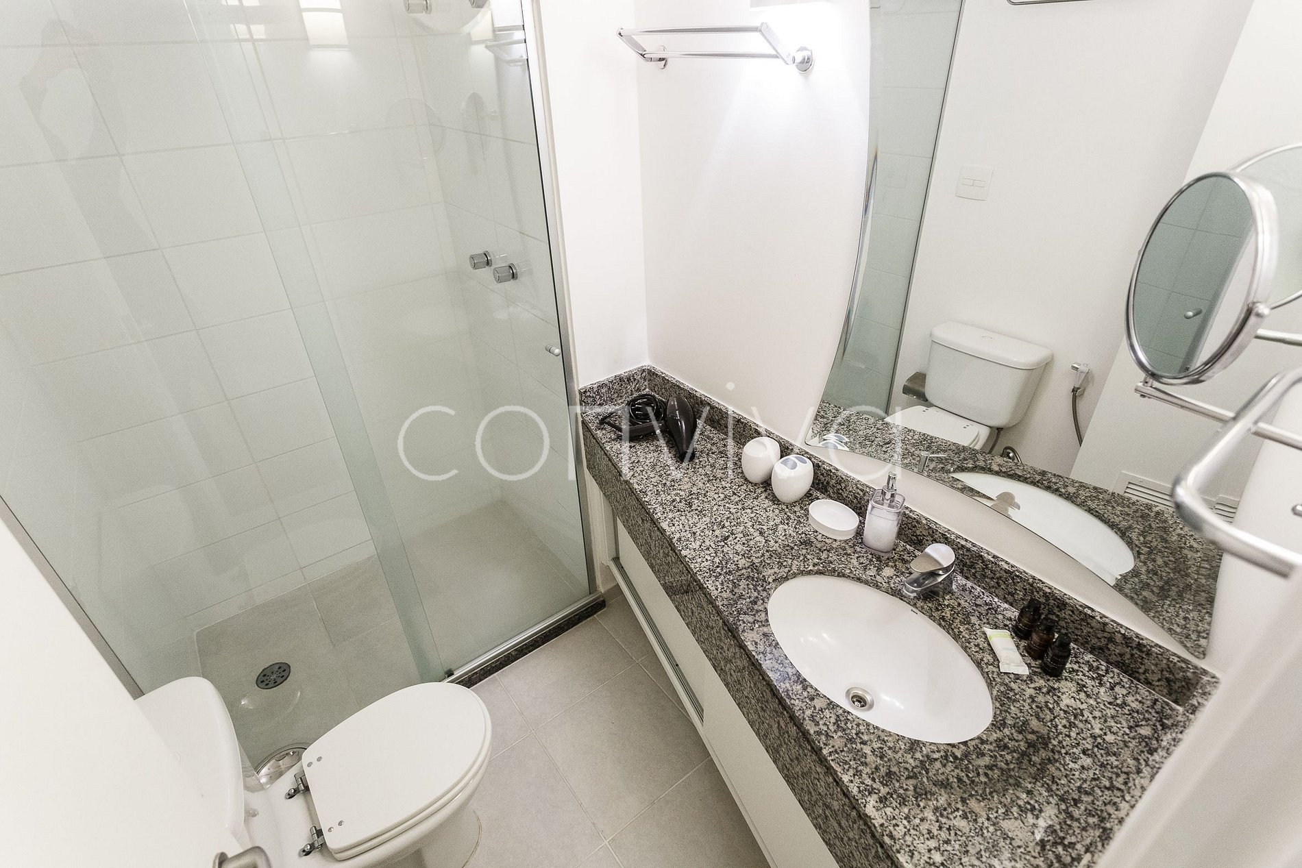 Espaço de 40m², no 10º andar, com uma cama king size, um sofá cama que acomoda uma criança, banheiro, sala com mesa de jantar e cozinha completa. O apartamento possui serviço de uma limpeza básica diária inclusa.