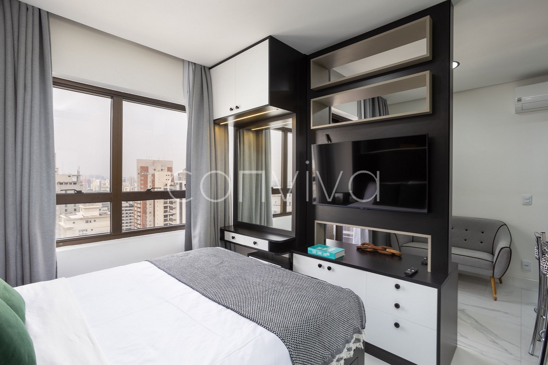 Este apartamento com uma vista espetacular dentro do Hotel Q. Paulista conta com uma cama casal, sala ampla, banheiro espaçoso, bar e cozinha completa.