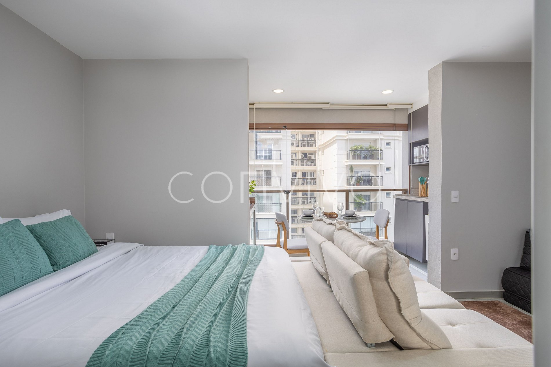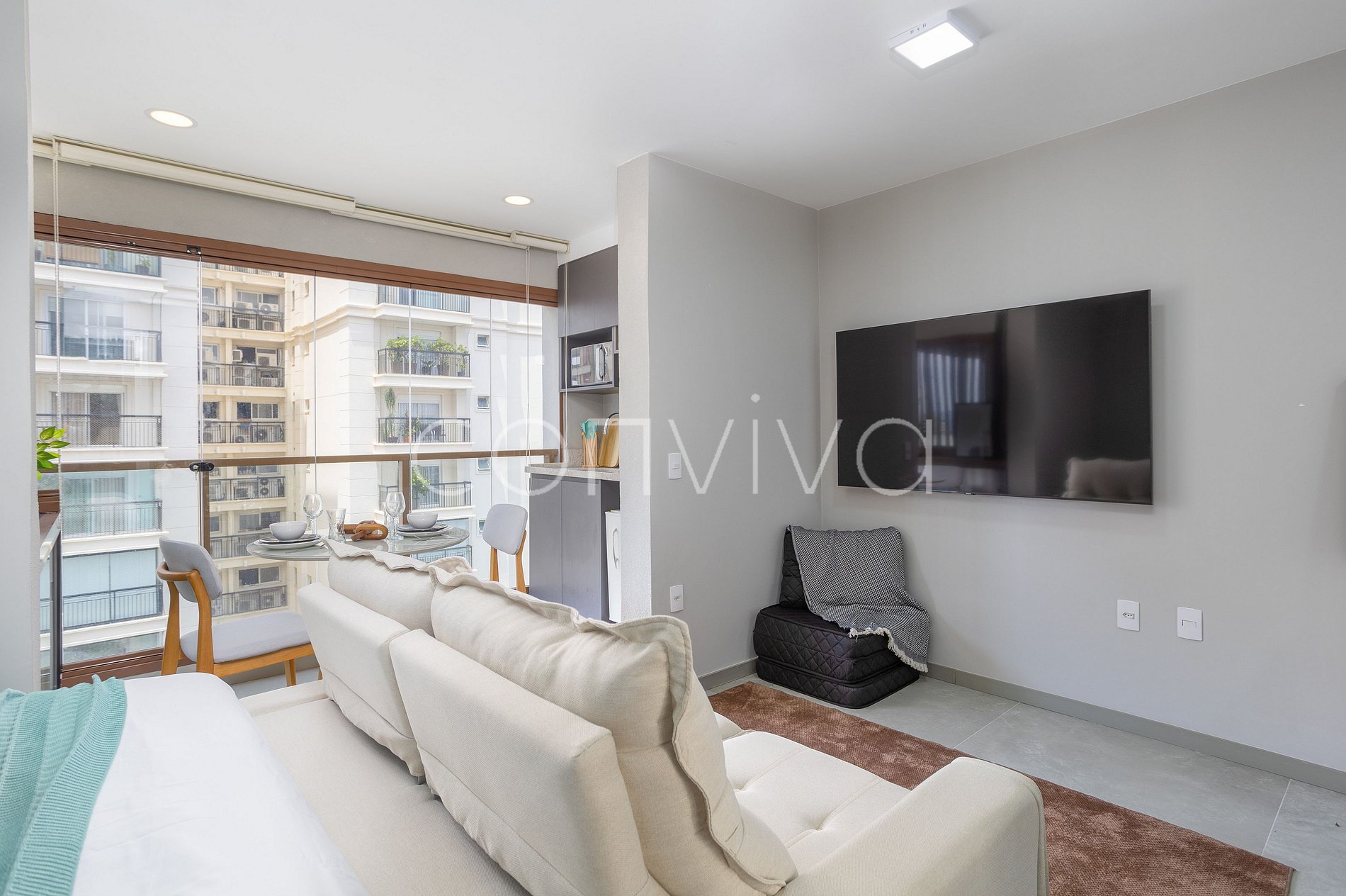 Este apartamento completo conta com uma cama de casal, futon individual, espaço com vista incrível para refeições, sofá extensor, espaço para home office e banheiro espaçoso, em um prédio moderno super bem localizado.
