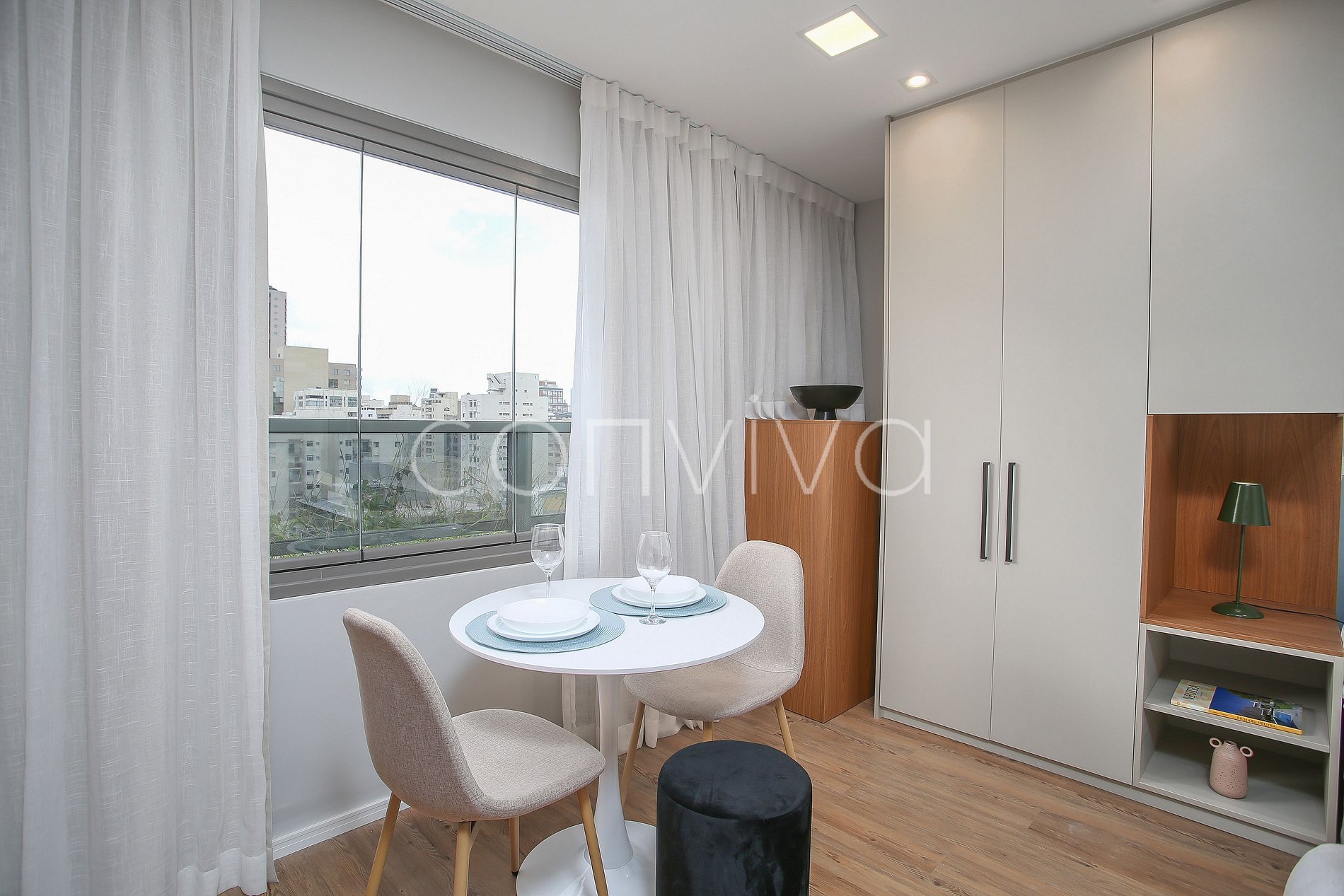 Studio compacto e acolhedor de 28m² no 11º andar, cozinha completa e máquina lava & seca dentro do apartamento, na Rua Joaquim Floriano, no Itaim Bibi. Ideal para quem vem a São Paulo a trabalho ou lazer, com Wi‑Fi, ar-condicionado e prédio com piscina na cobertura, academia, coworking e lavanderia.