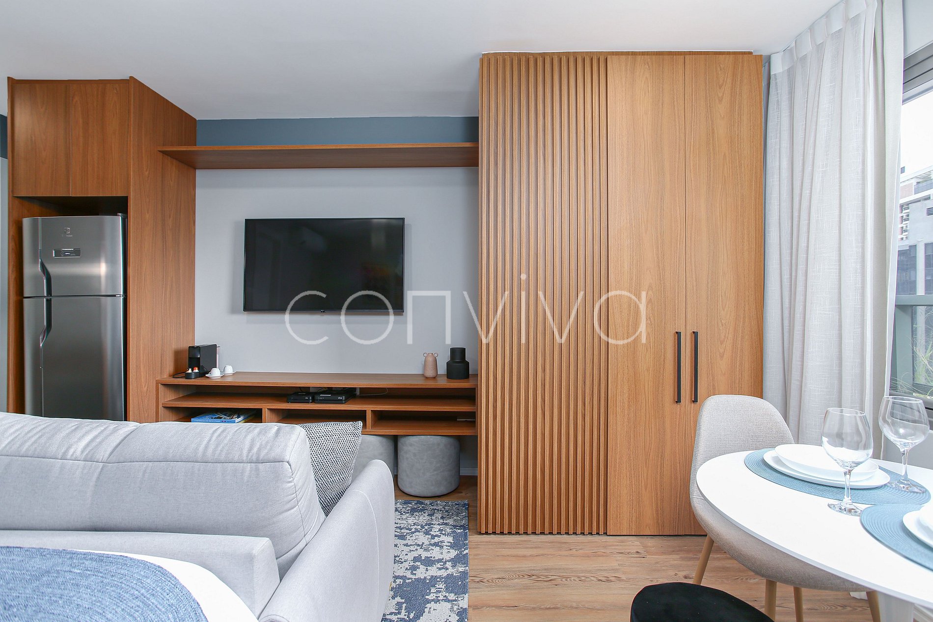 Studio compacto e acolhedor de 28m² no 11º andar, cozinha completa e máquina lava & seca dentro do apartamento, na Rua Joaquim Floriano, no Itaim Bibi. Ideal para quem vem a São Paulo a trabalho ou lazer, com Wi‑Fi, ar-condicionado e prédio com piscina na cobertura, academia, coworking e lavanderia.