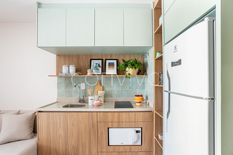 Espaço charmoso de 49m², no 4º andar, com uma cama casal, sofá e banheiro, super bem decorado e equipado.