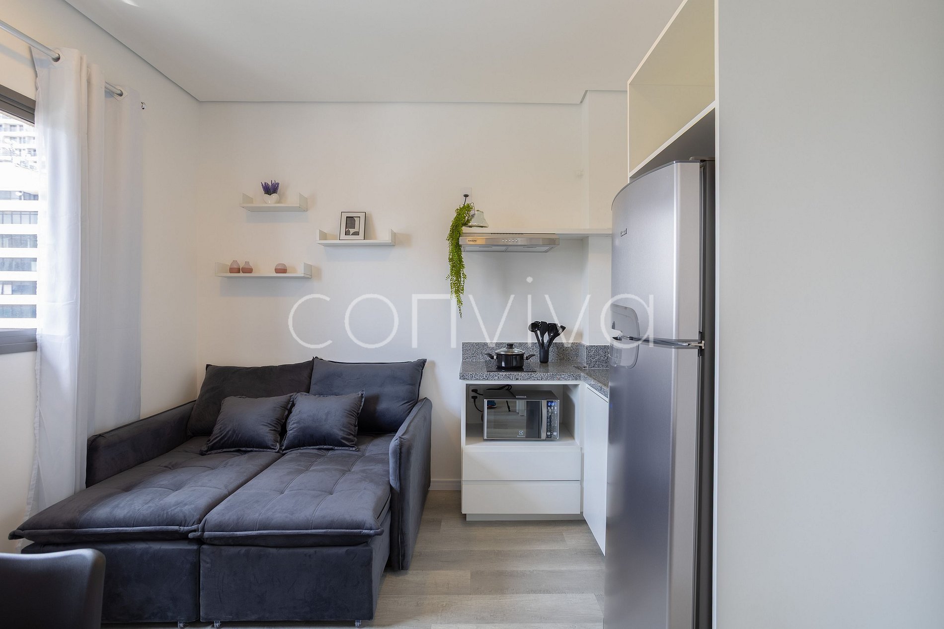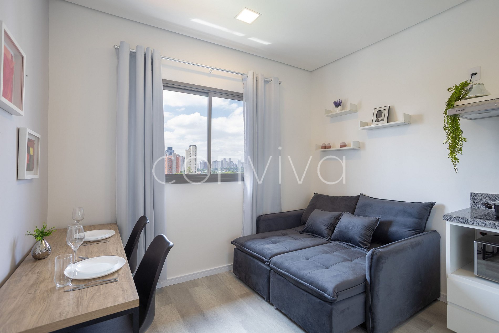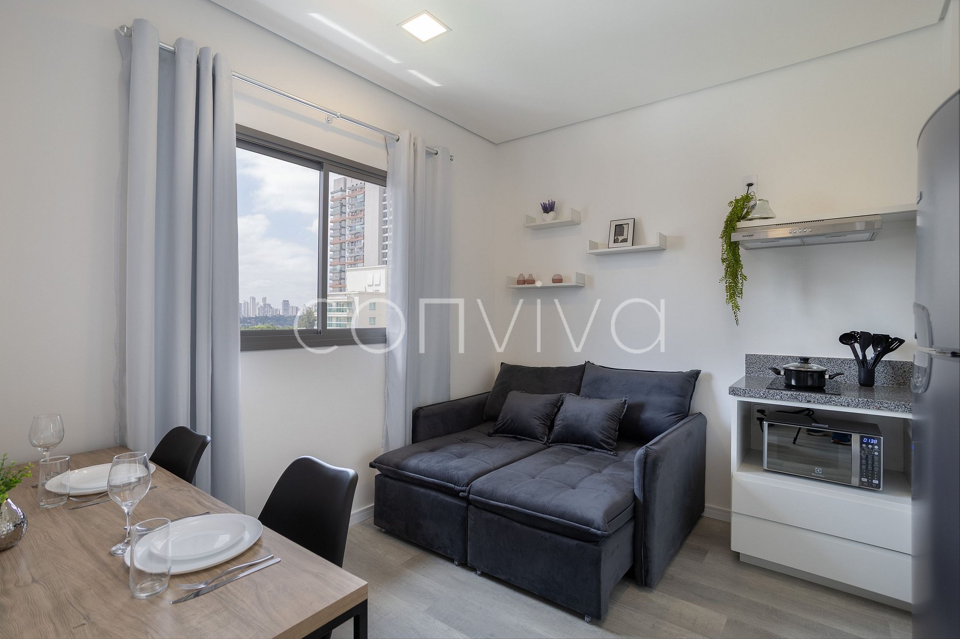 Localizado no charmoso bairro Chácara Santo Antônio, São Paulo. Este apartamento moderno de 27m² no 10º andar oferece conforto e praticidade para sua estadia a lazer ou negócios, a apenas 1 km do Consulado Americano.