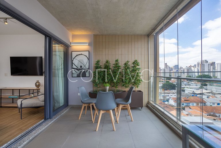 Espaço de 46m², no 8º andar, com uma cama queen size, banheiro, cozinha compacta e varanda com espaço para home offfice.