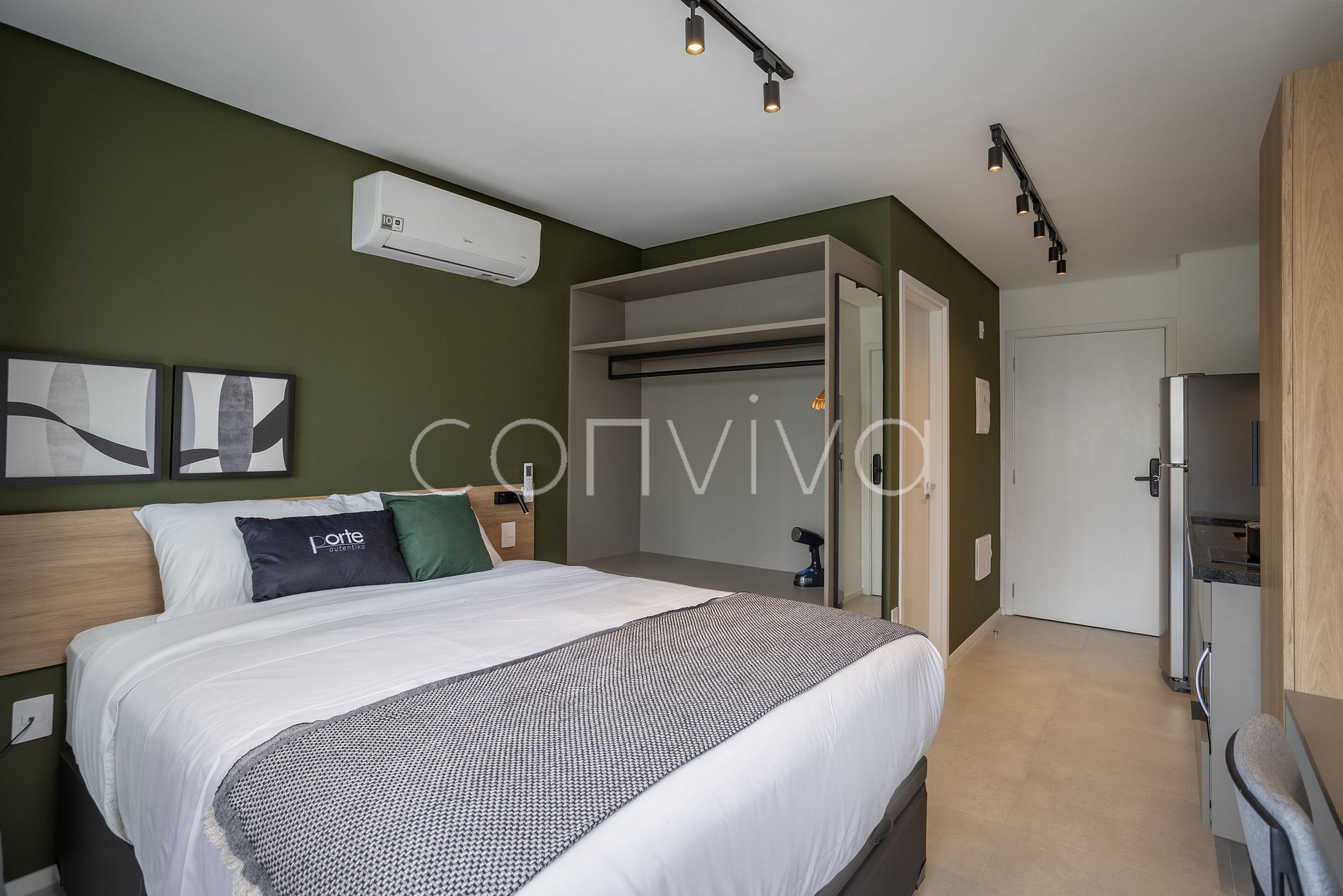 Studio de 25m², no 8º andar, com uma cama queen size, cozinha compacta, banheiro e varanda.