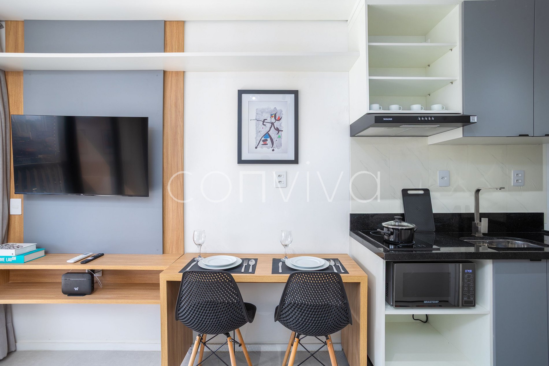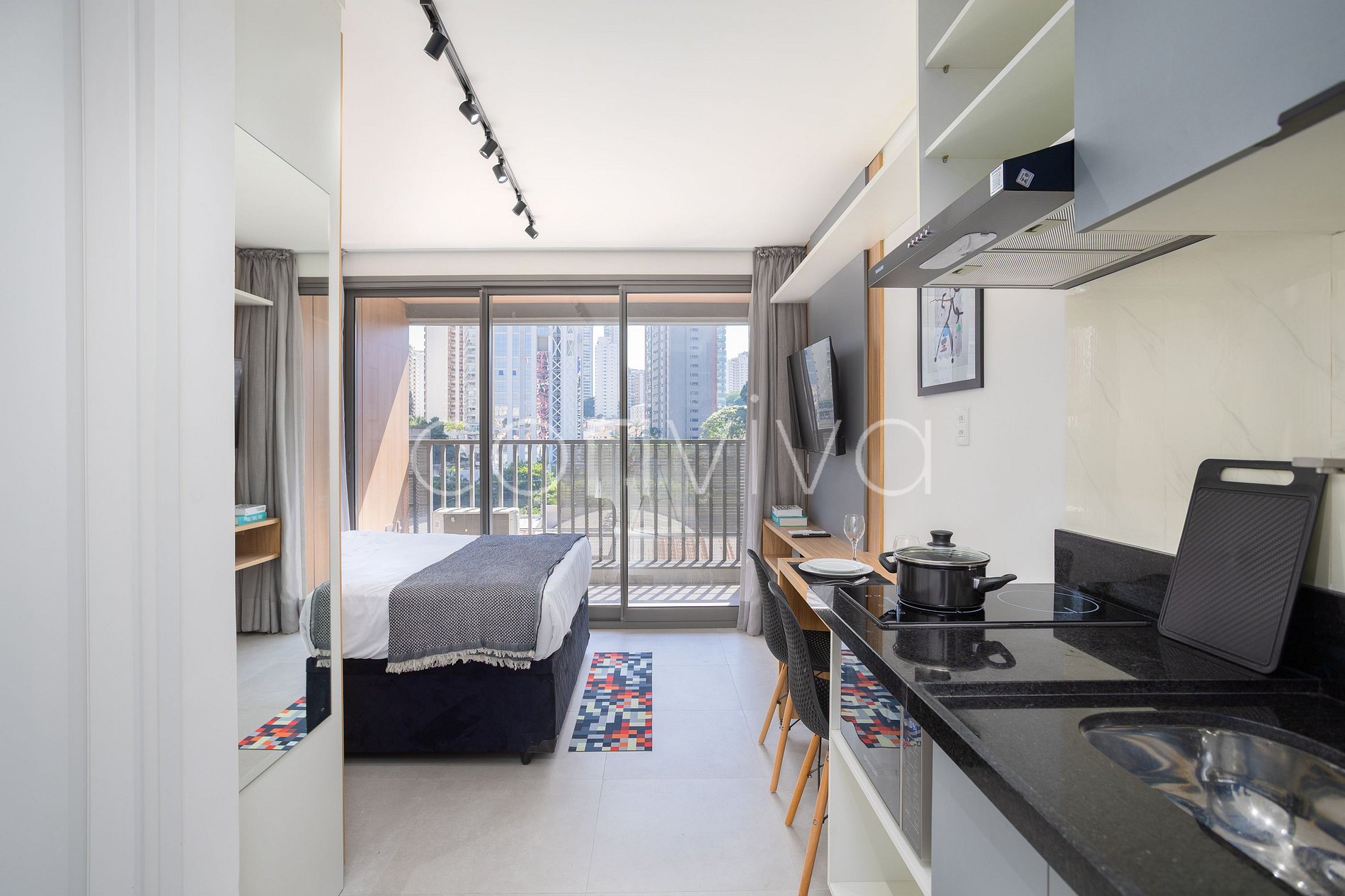 Nosso studio de 25m² no 5º andar combina design moderno com funcionalidade. Relaxe em uma cama casal de qualidade, aproveite a cozinha compacta para preparar suas refeições, e desfrute de momentos especiais na varanda privativa. Banheiro completo e bem equipado. Ideal para casais, profissionais em trânsito ou quem quer explorar São Paulo com estilo e conforto.