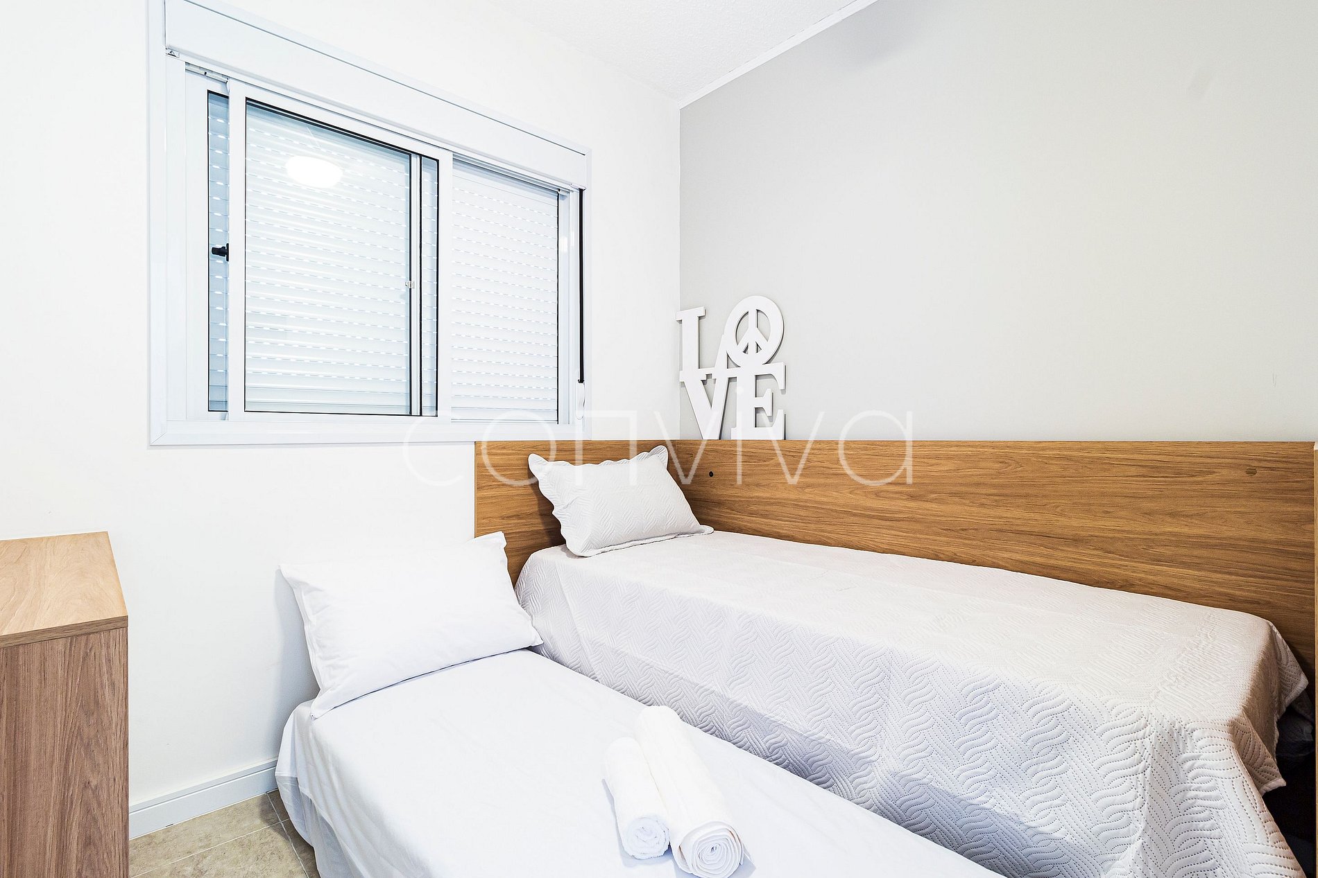 Este apartamento completo conta com dois quartos, sendo uma cama queen size em um, uma bicama no outro e um sofá cama na sala, banheiro e uma cozinha bem equipada. Sendo possível acomodar até 5 pessoas.