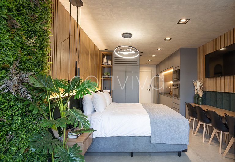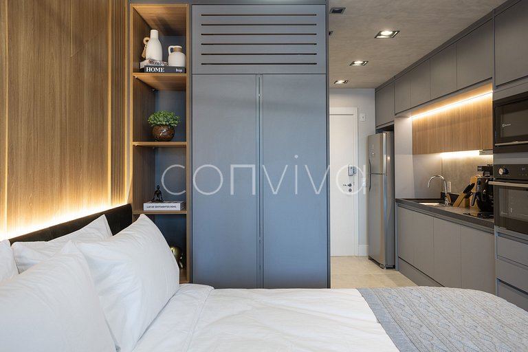 Espaço de 28m², no 2º andar, dispõe de uma cama queen, sofá-cama, cozinha completa, varanda integrada e banheiro.
