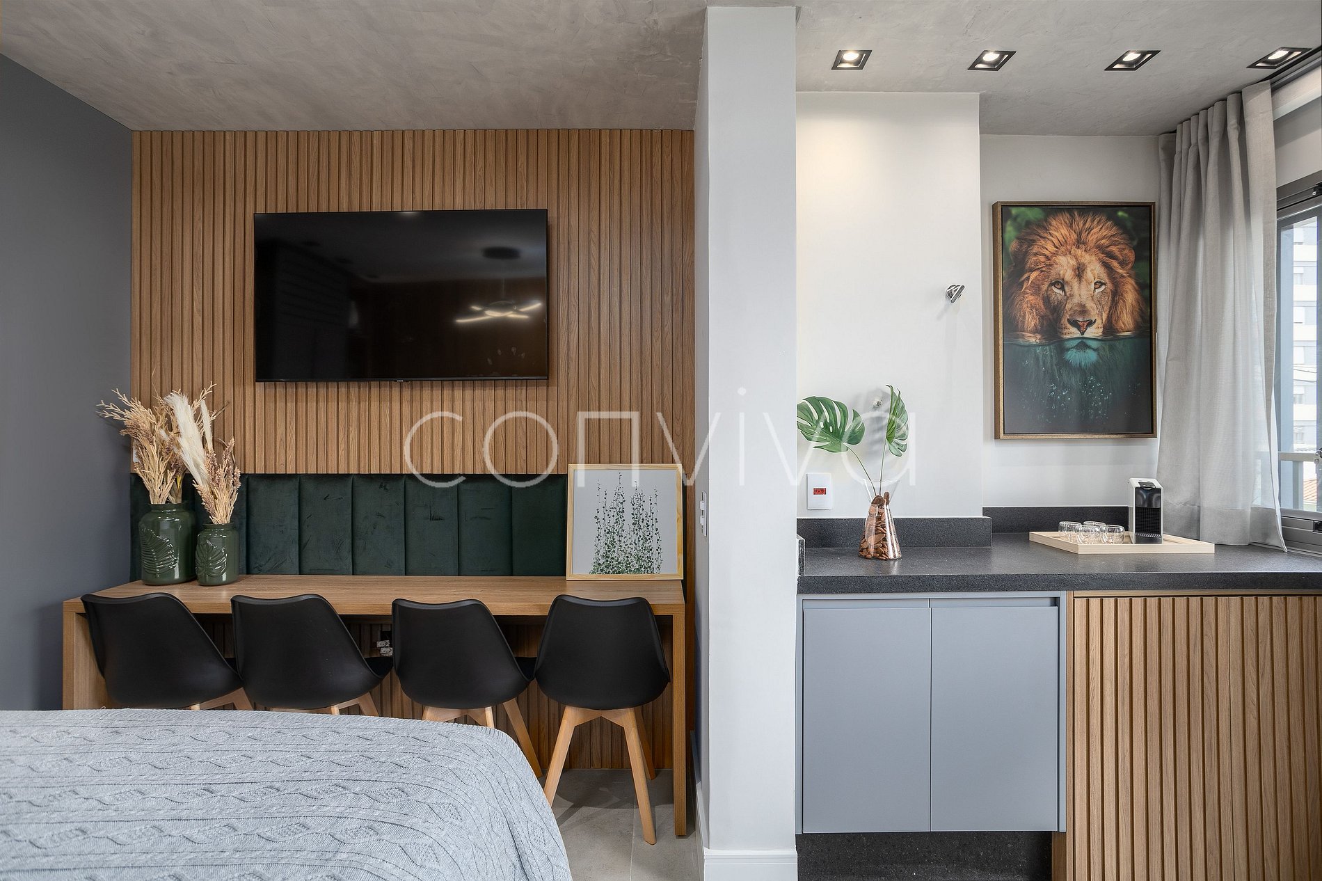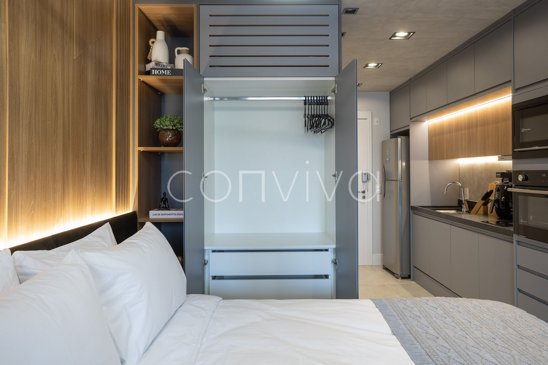 Espaço de 28m², no 2º andar, dispõe de uma cama queen, sofá-cama, cozinha completa, varanda integrada e banheiro.