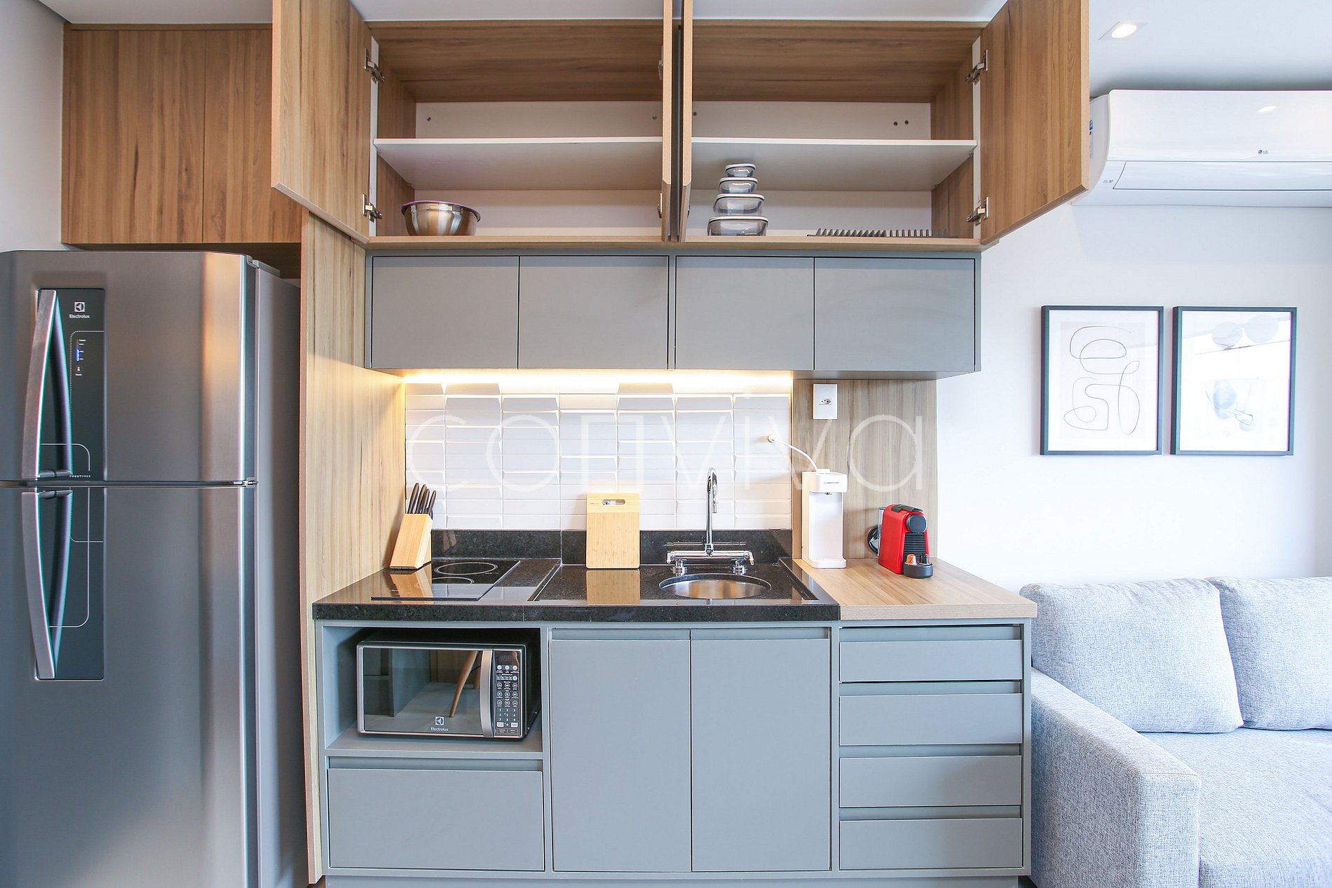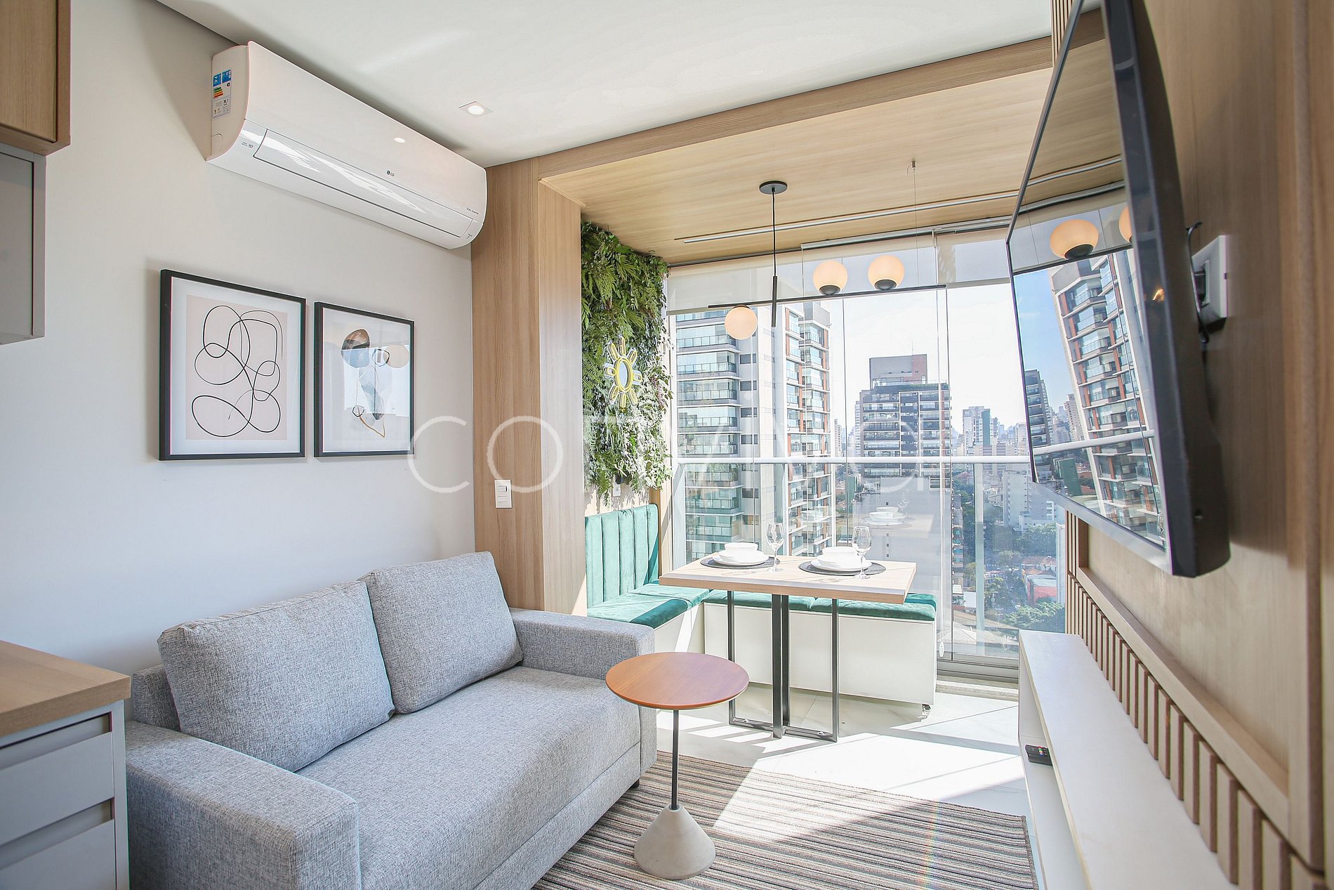 Espaço de 30m², no 17º andar. Com uma cama de casal, sofá, banheiro e uma cozinha compacta na melhor localização de Pinheiros.