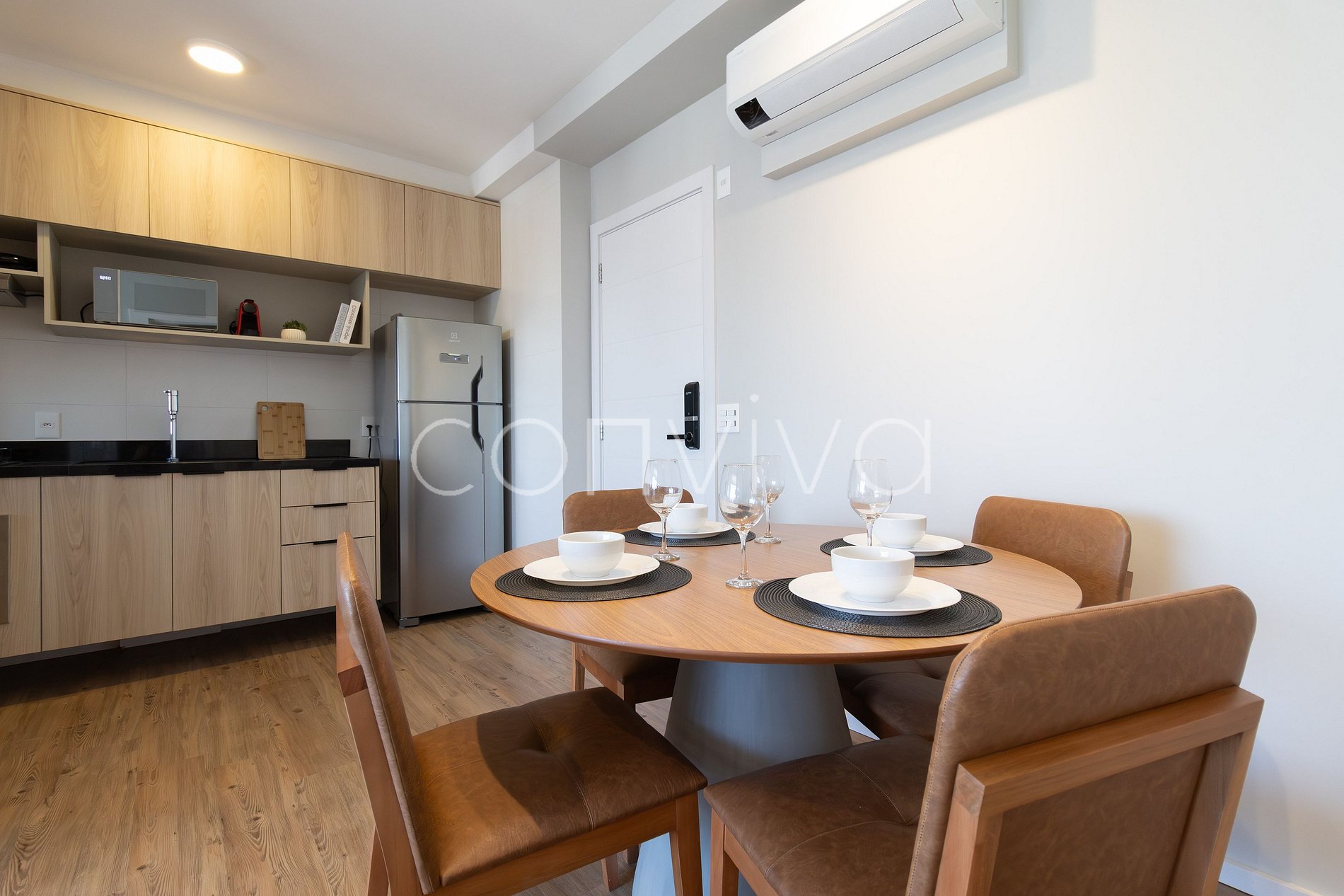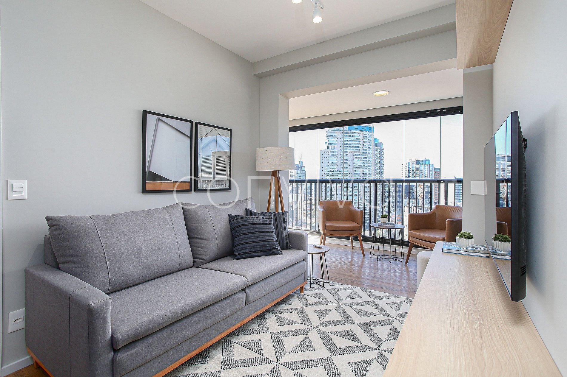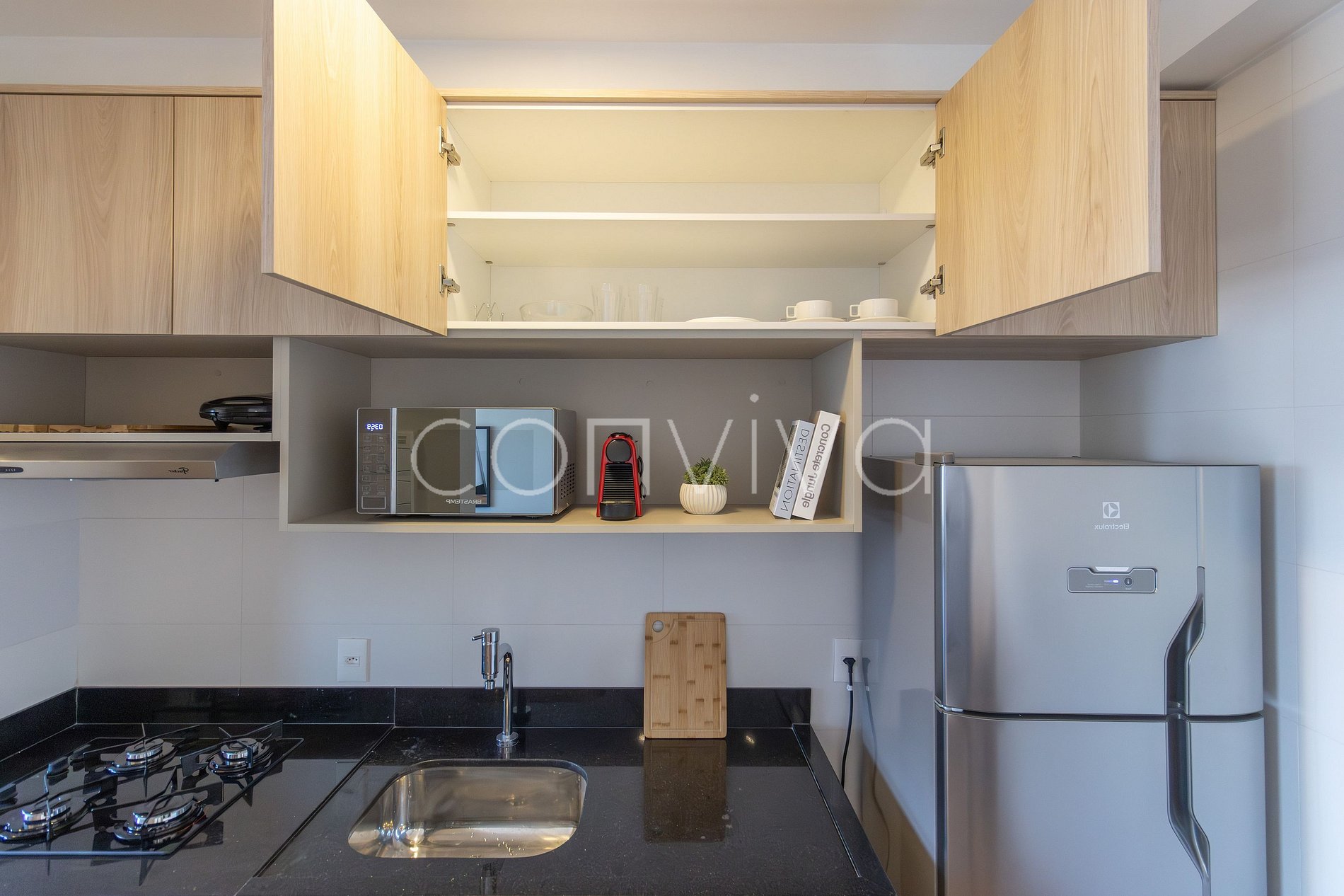 Espaço de 48m², no 17º andar, com uma cama queen size, banheiro, sofá e cozinha. Possui uma vista incrível, na melhor localização de Pinheiros.
