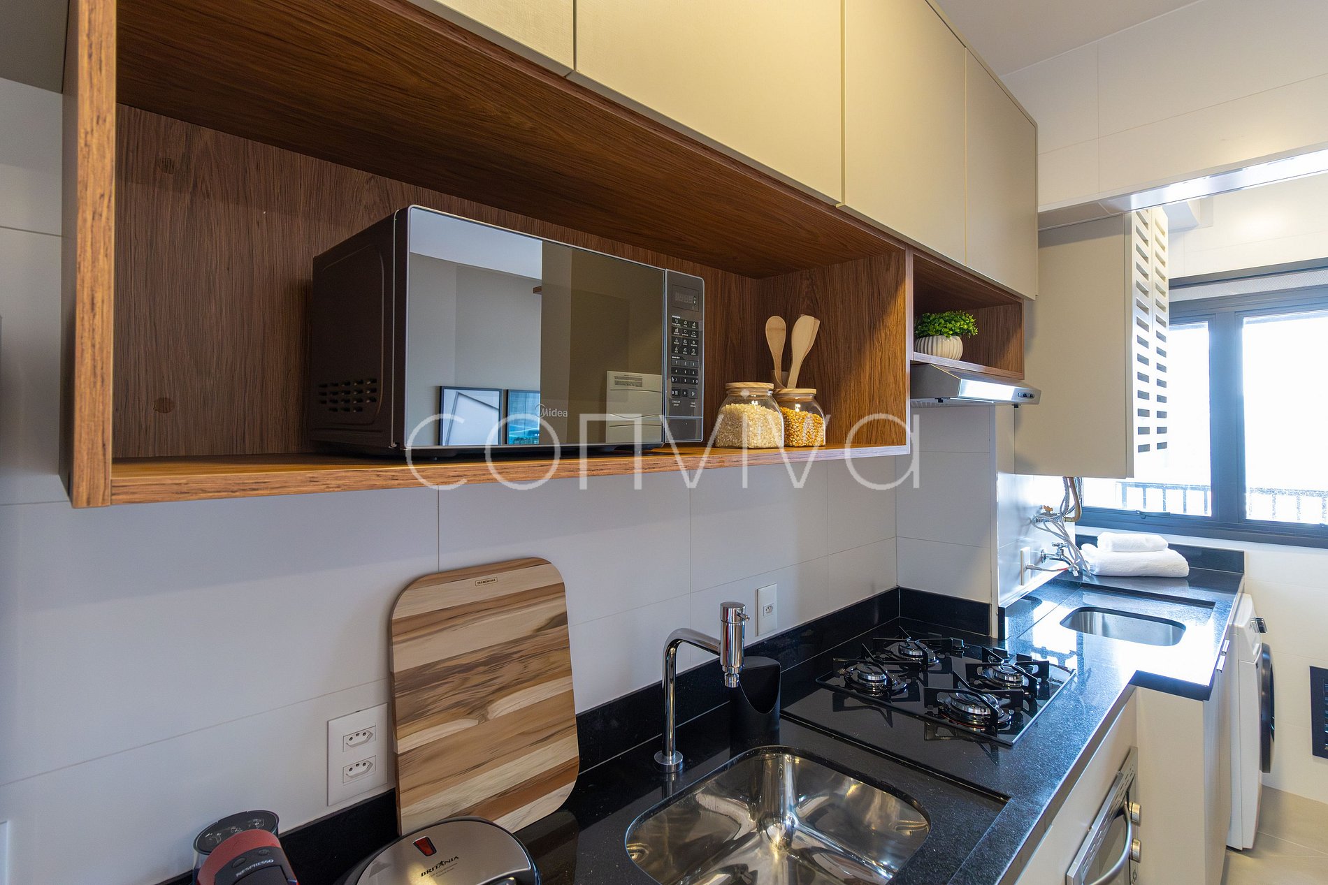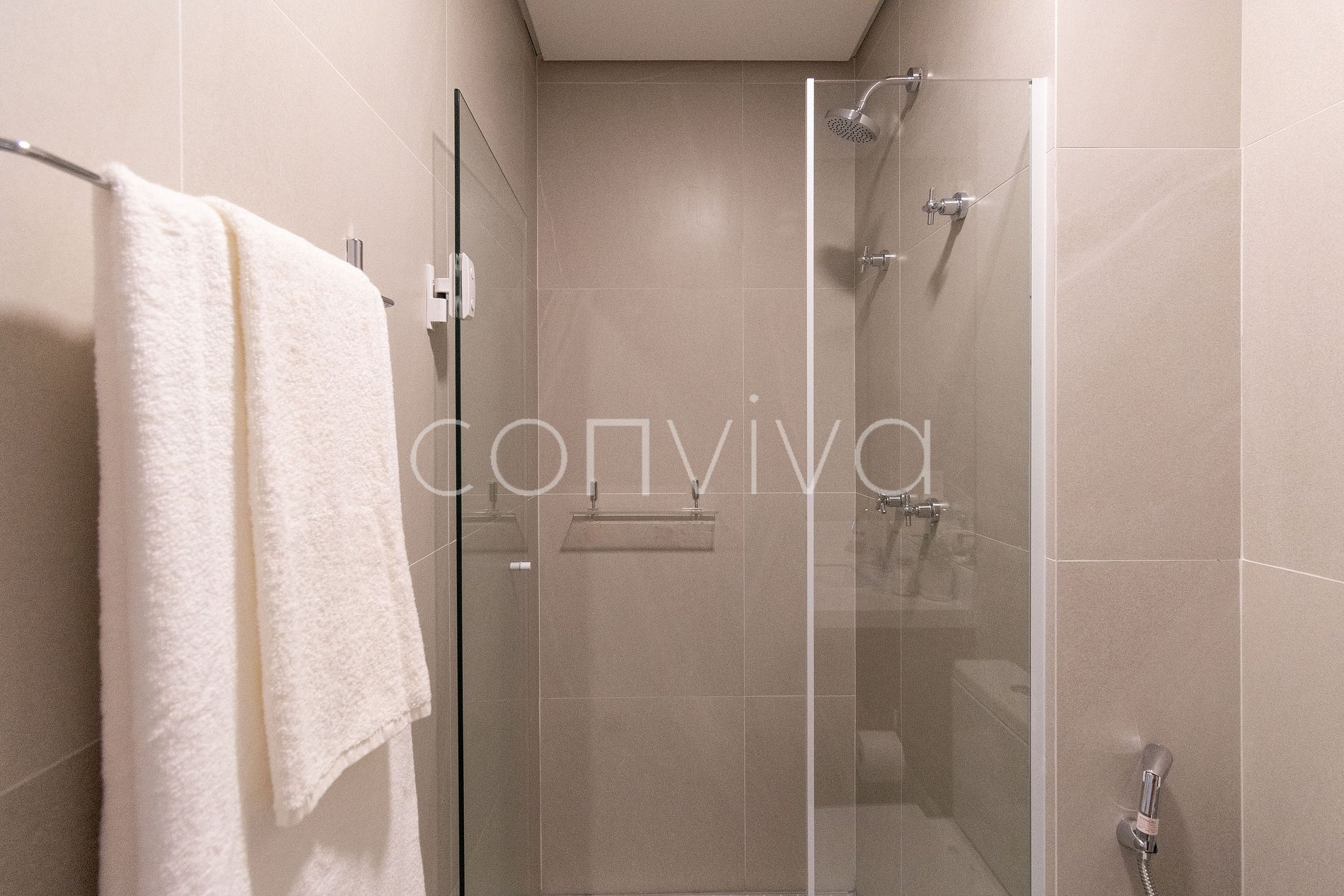 Espaço de 48m², no 12º andar, com uma cama queen size, sofá-cama, banheiro e cozinha. Acomoda até 3 pessoas.