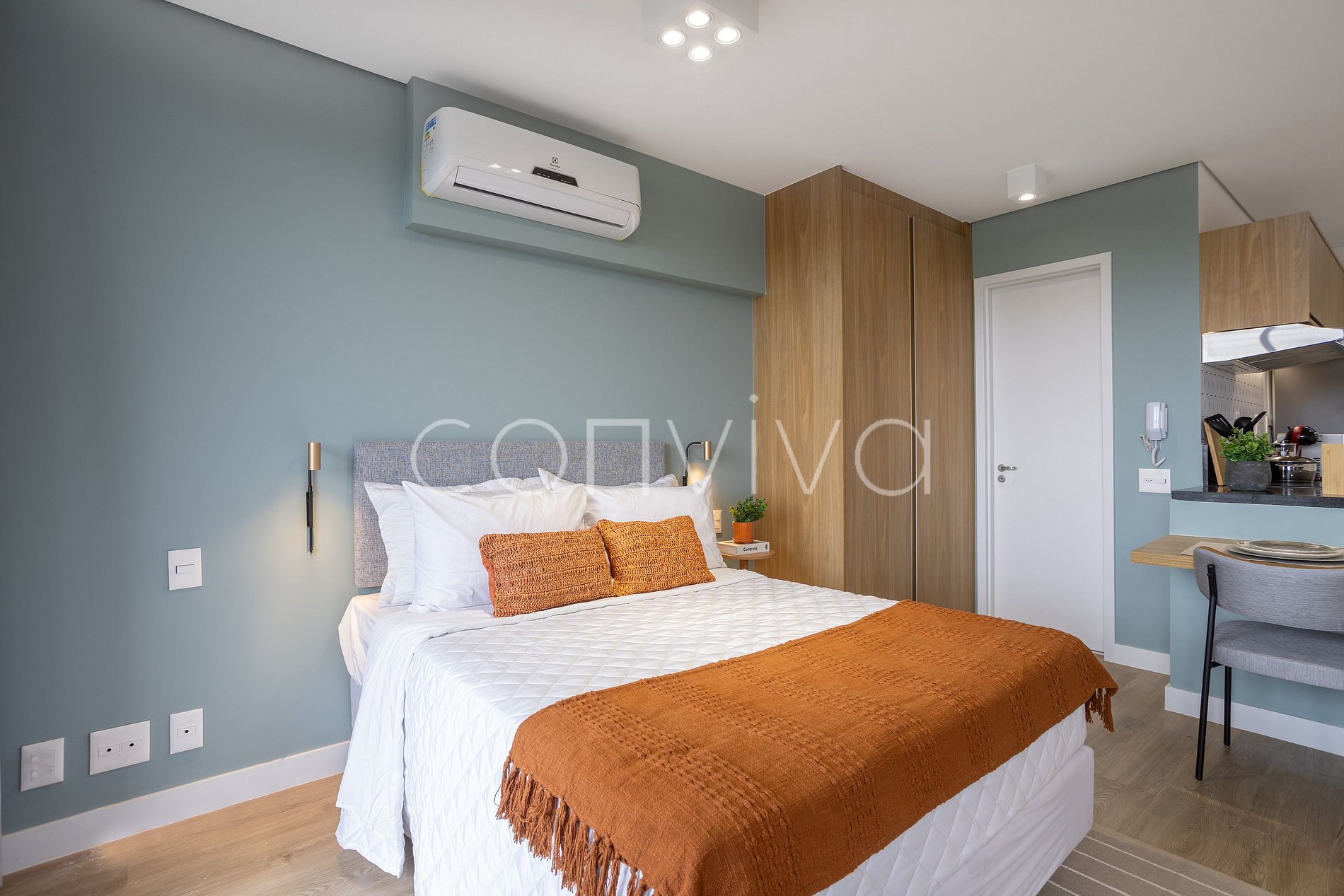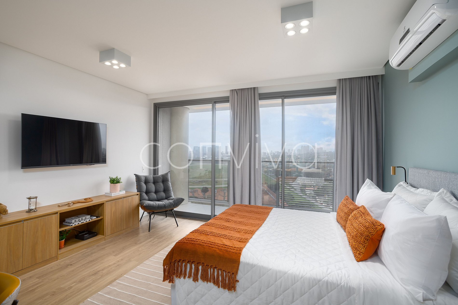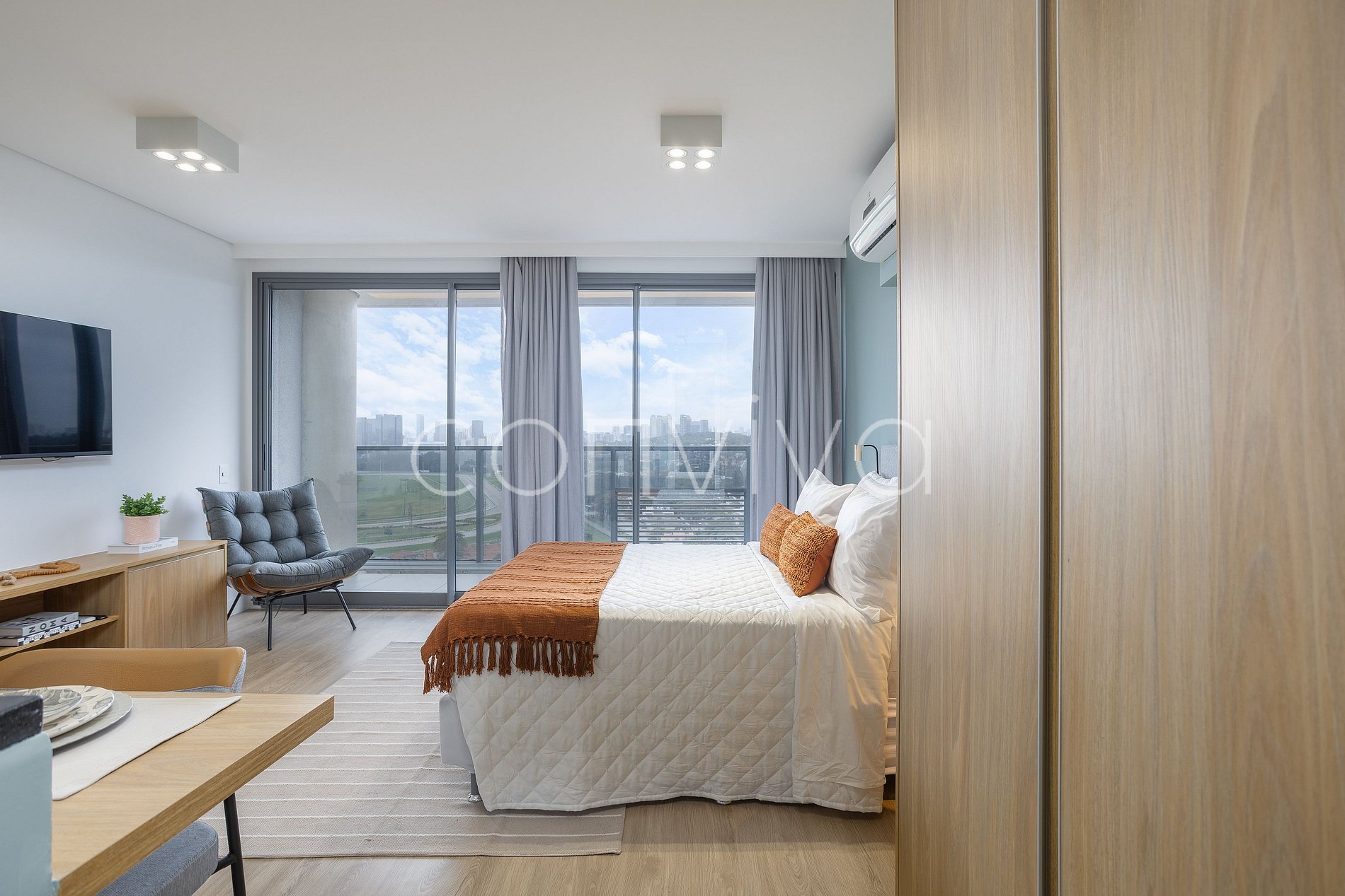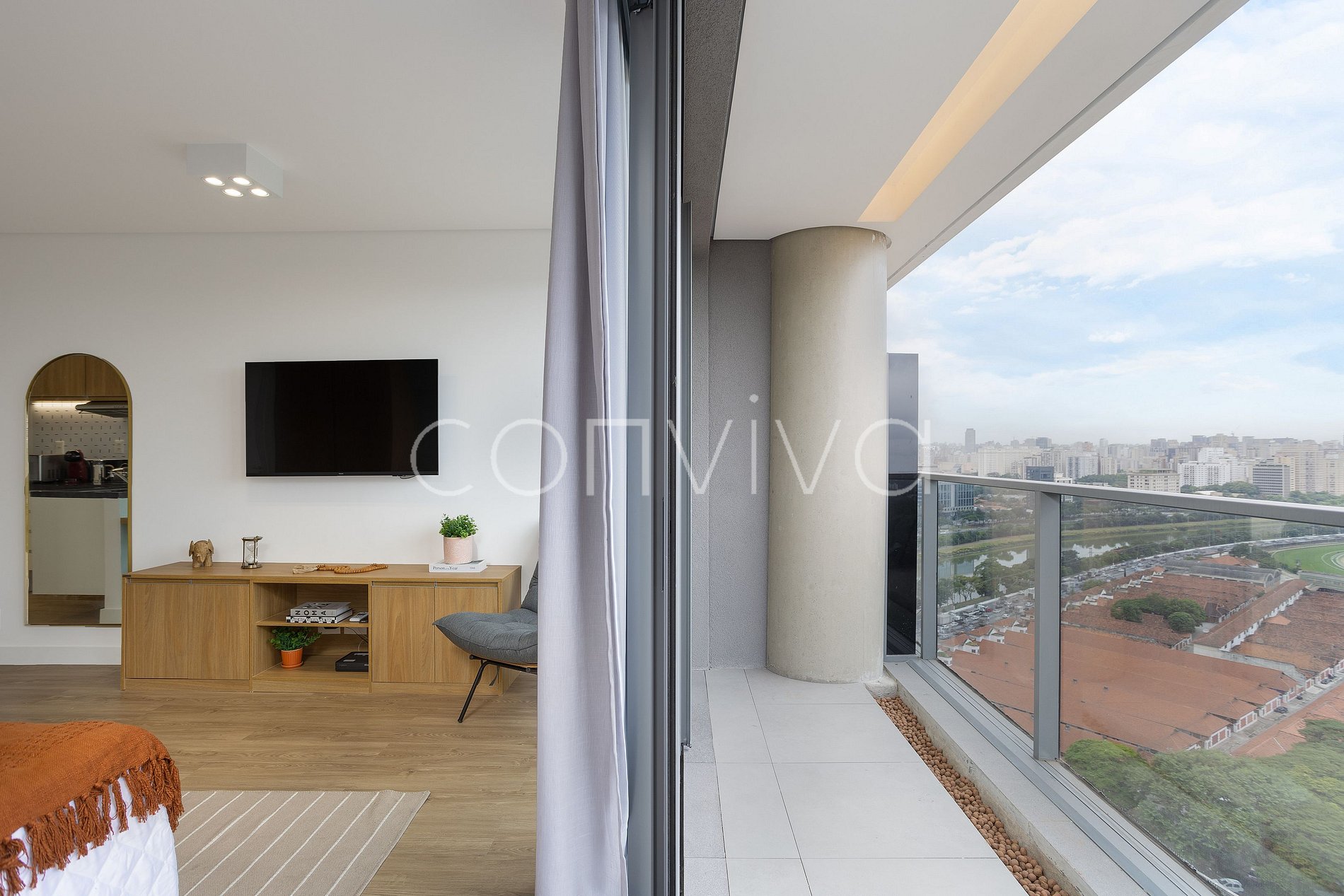 Espaço de 38m², no 19º andar, composto por uma cama casal, sofá, banheiro, cozinha completa e varanda com uma vista privilegiada para o Jockey Club.