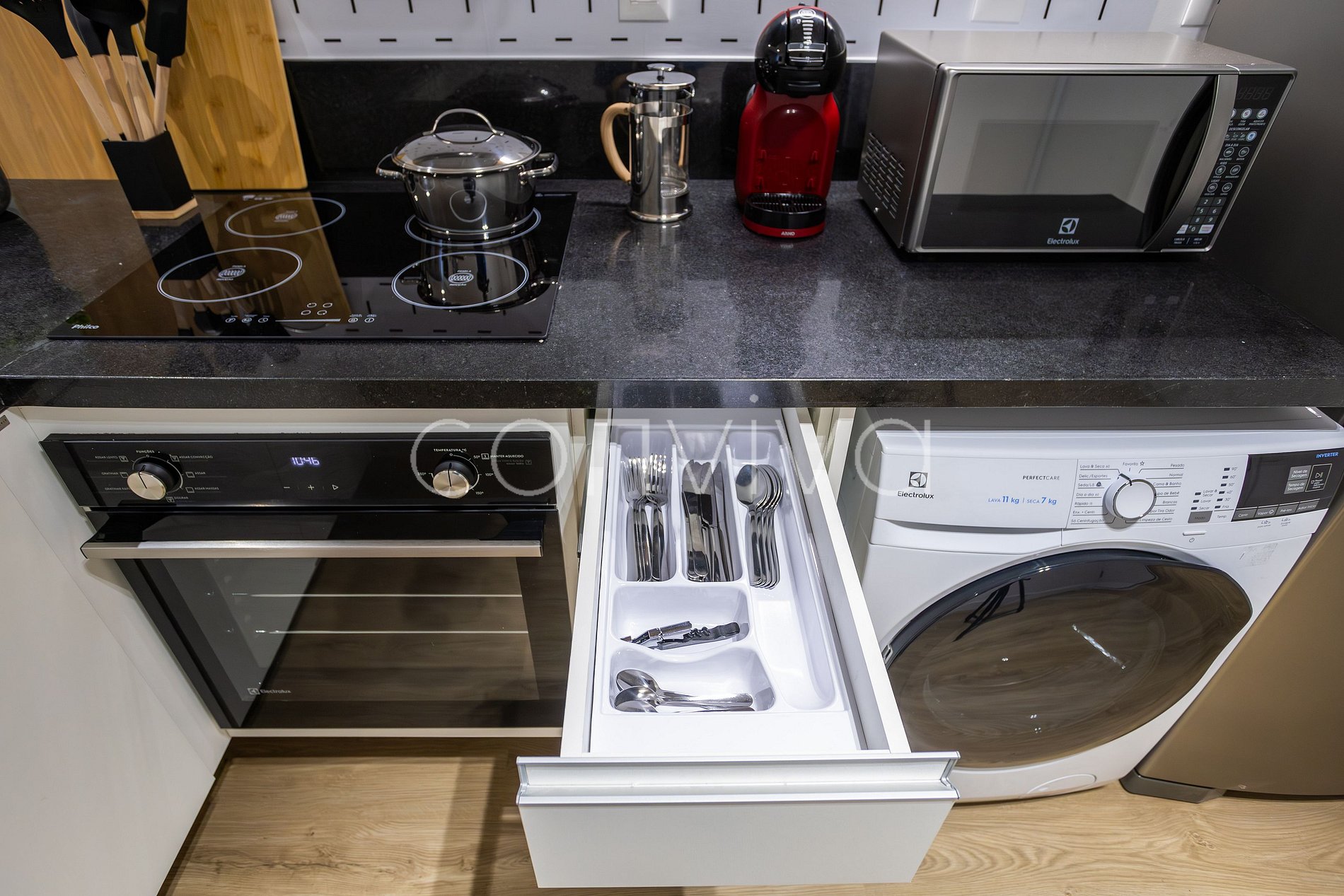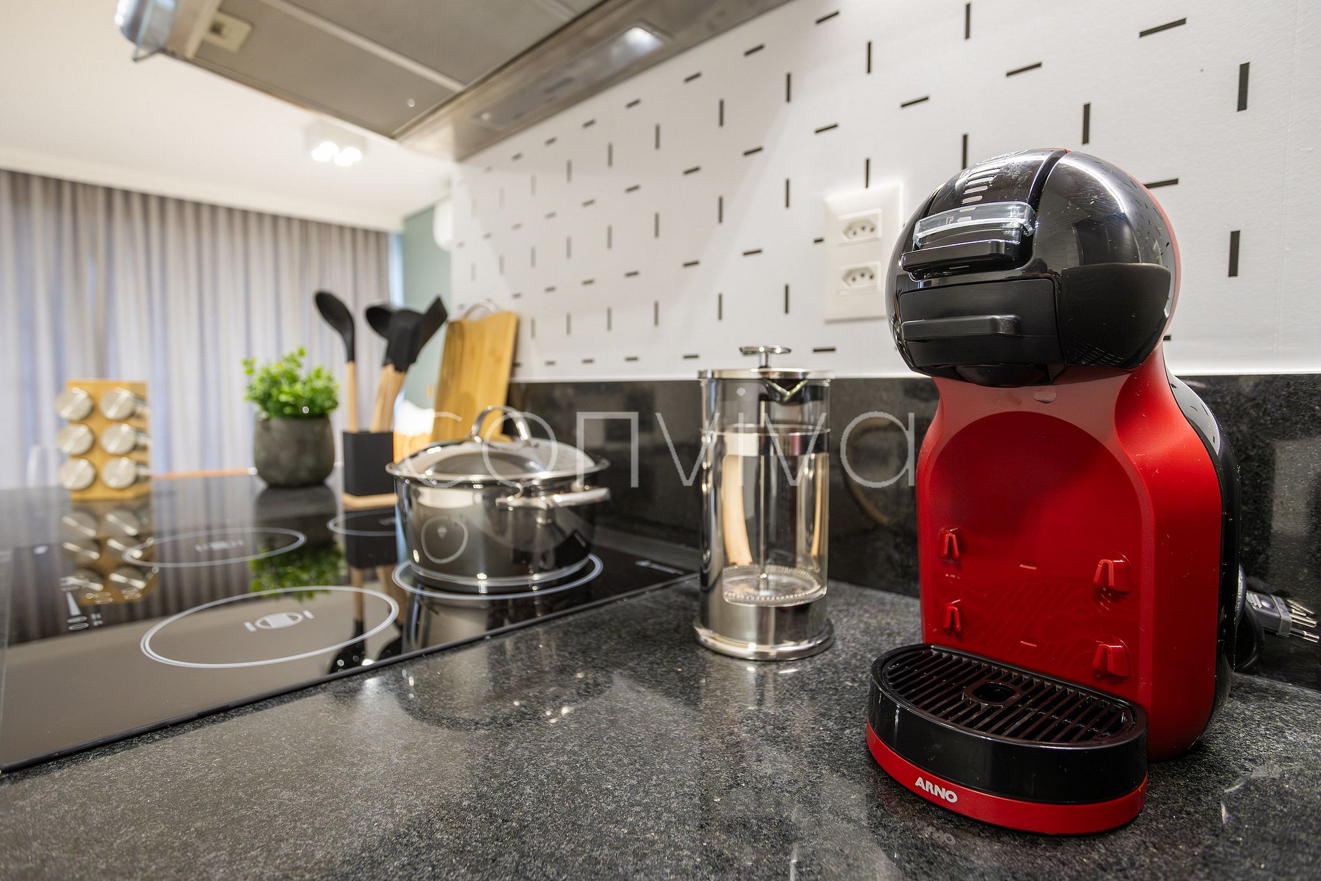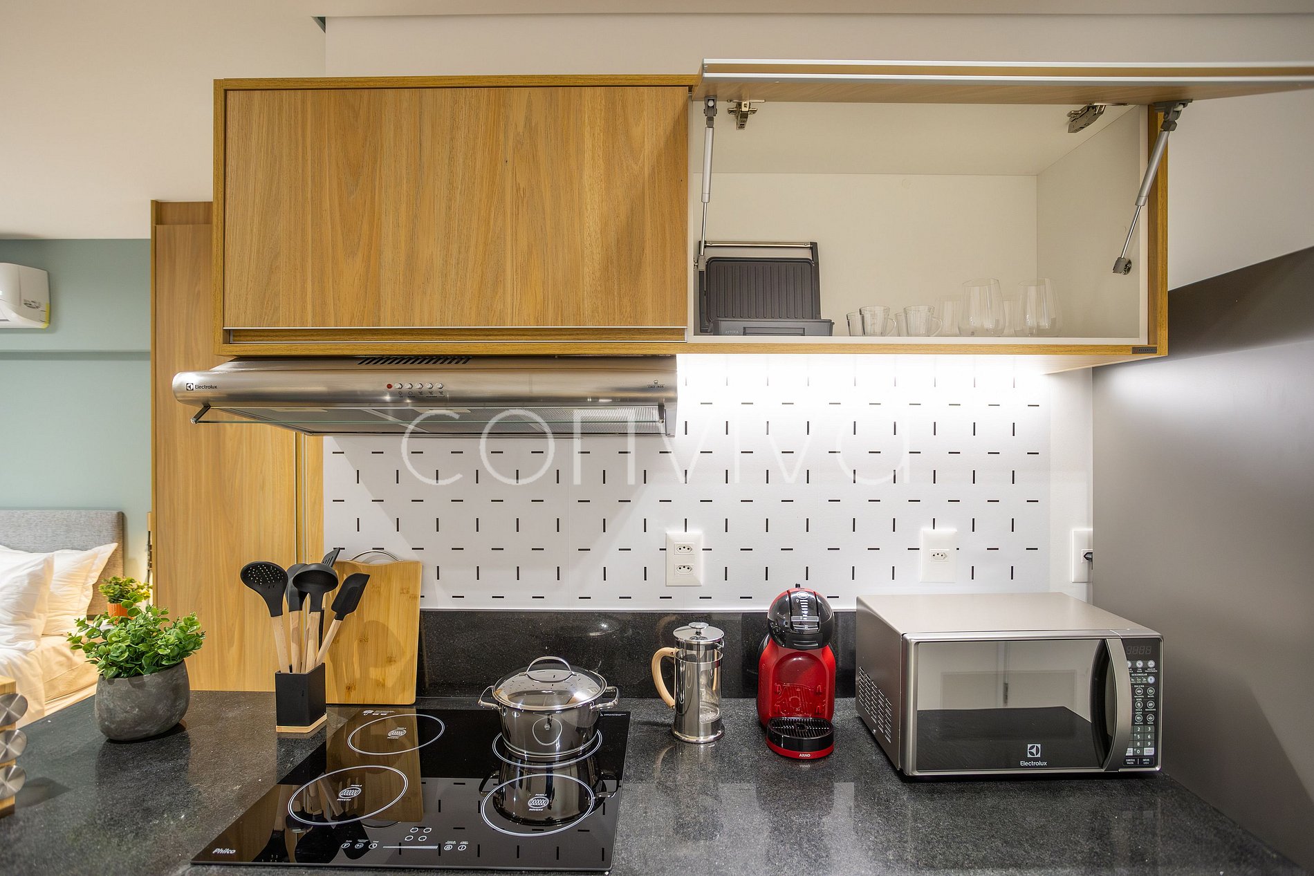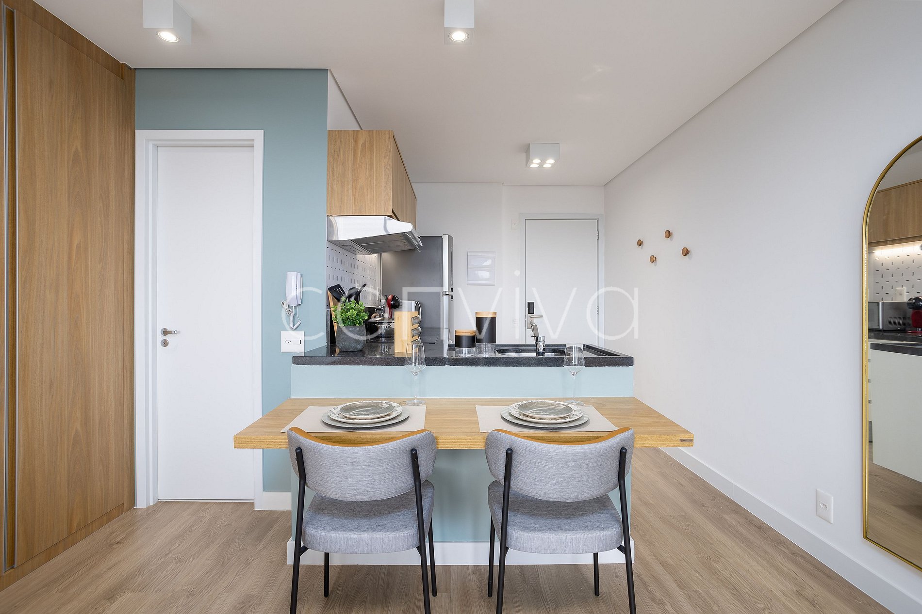 Espaço de 38m², no 19º andar, composto por uma cama casal, sofá, banheiro, cozinha completa e varanda com uma vista privilegiada para o Jockey Club.