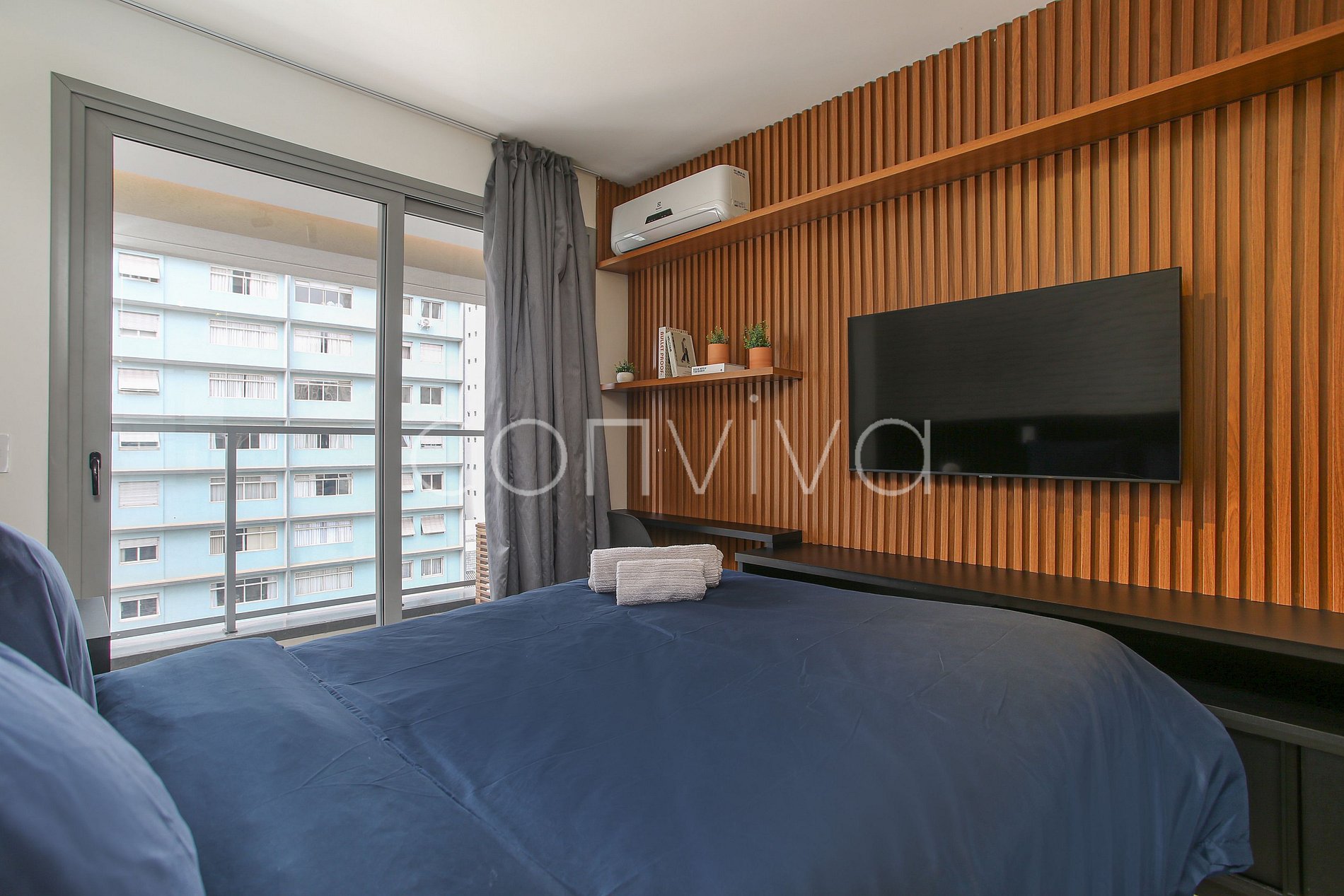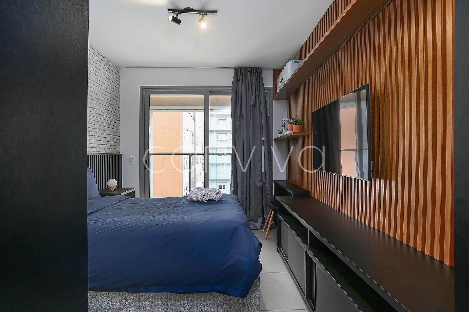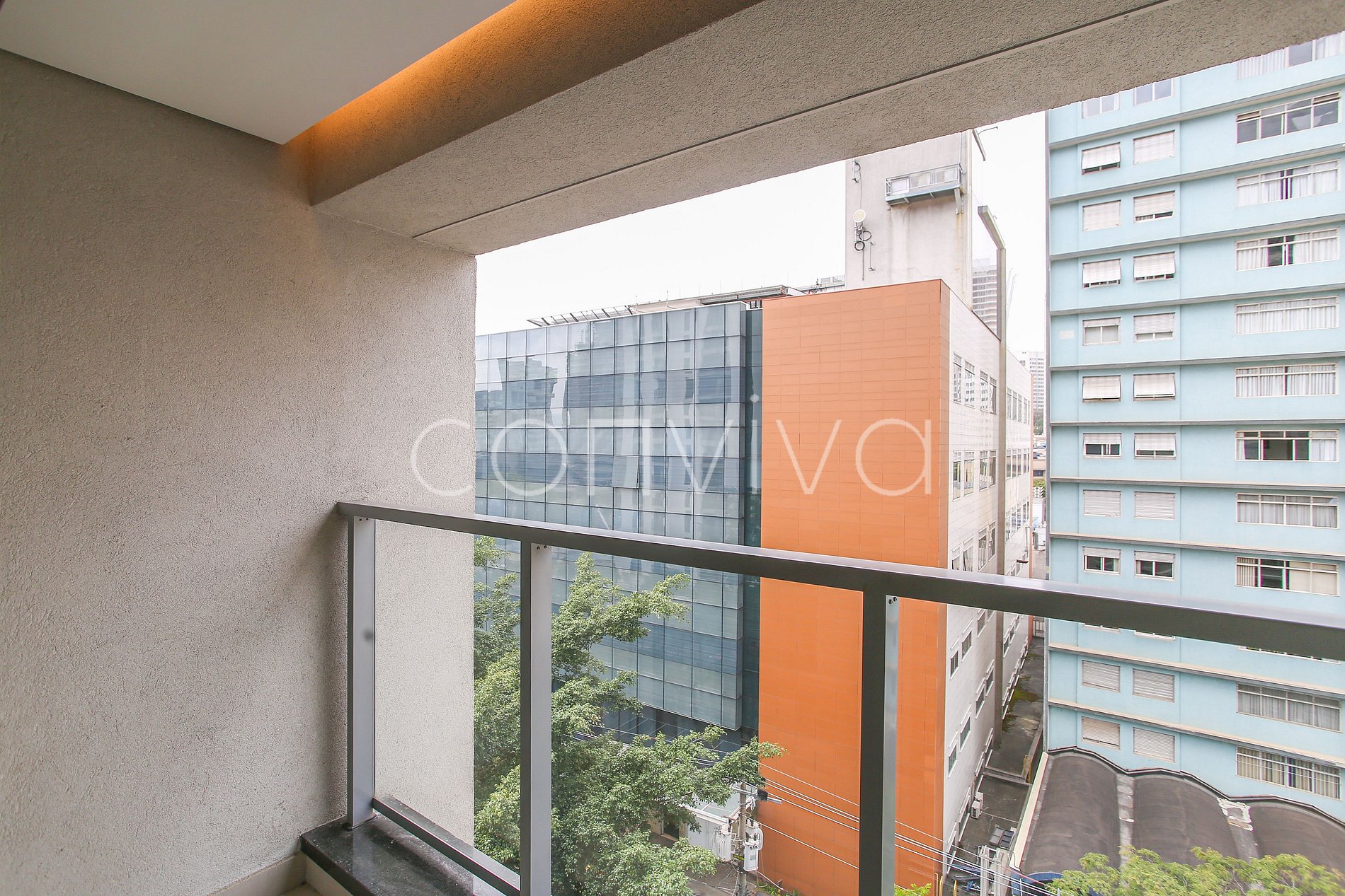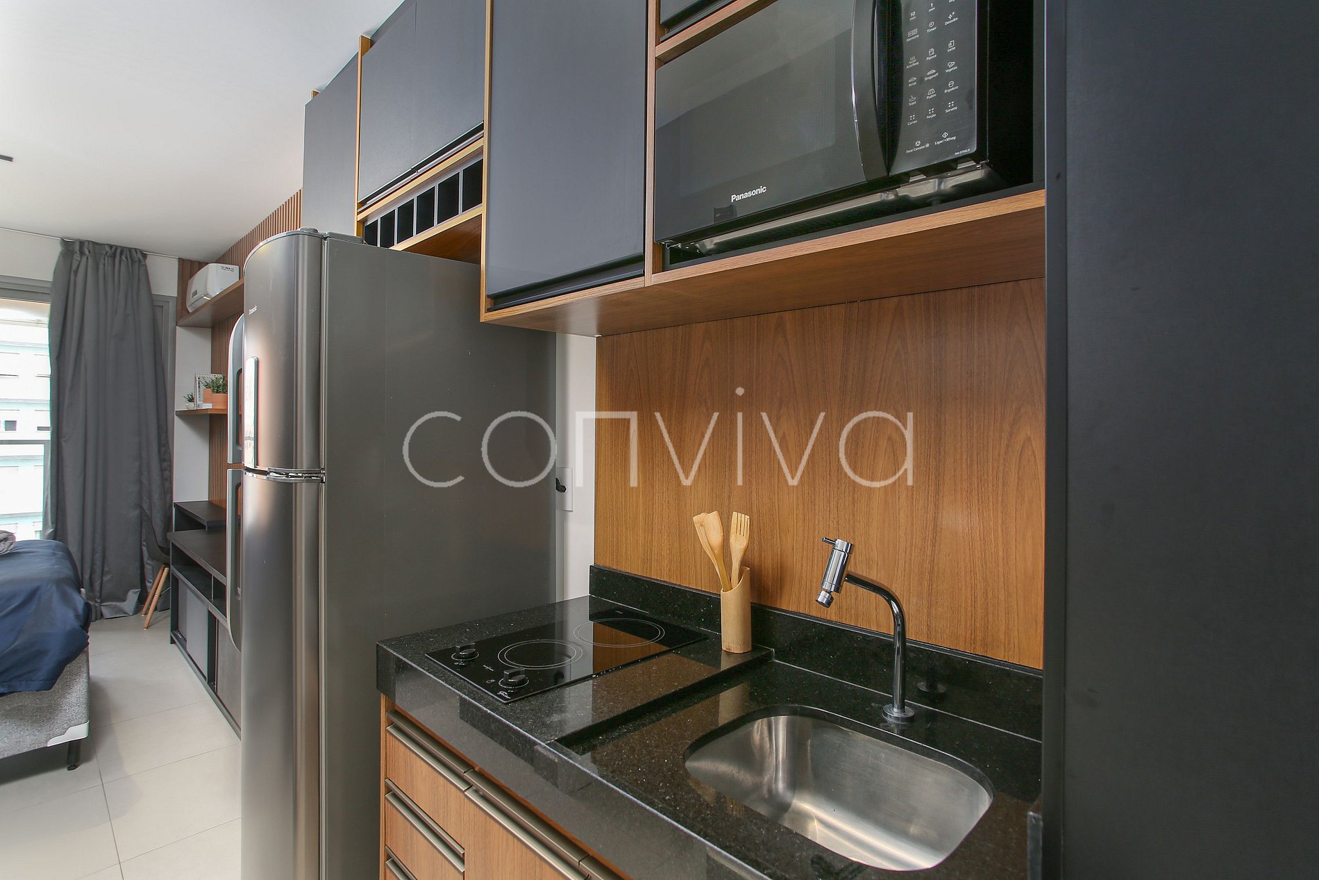 Espaço de 25m², no 7º andar, com uma cama de casal, varanda, cozinha compacta e banheiro.
