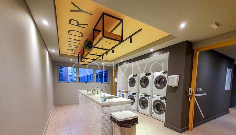 Há uma lavanderia no prédio que pode ser utilizada mediante a compra de créditos no aplicativo.